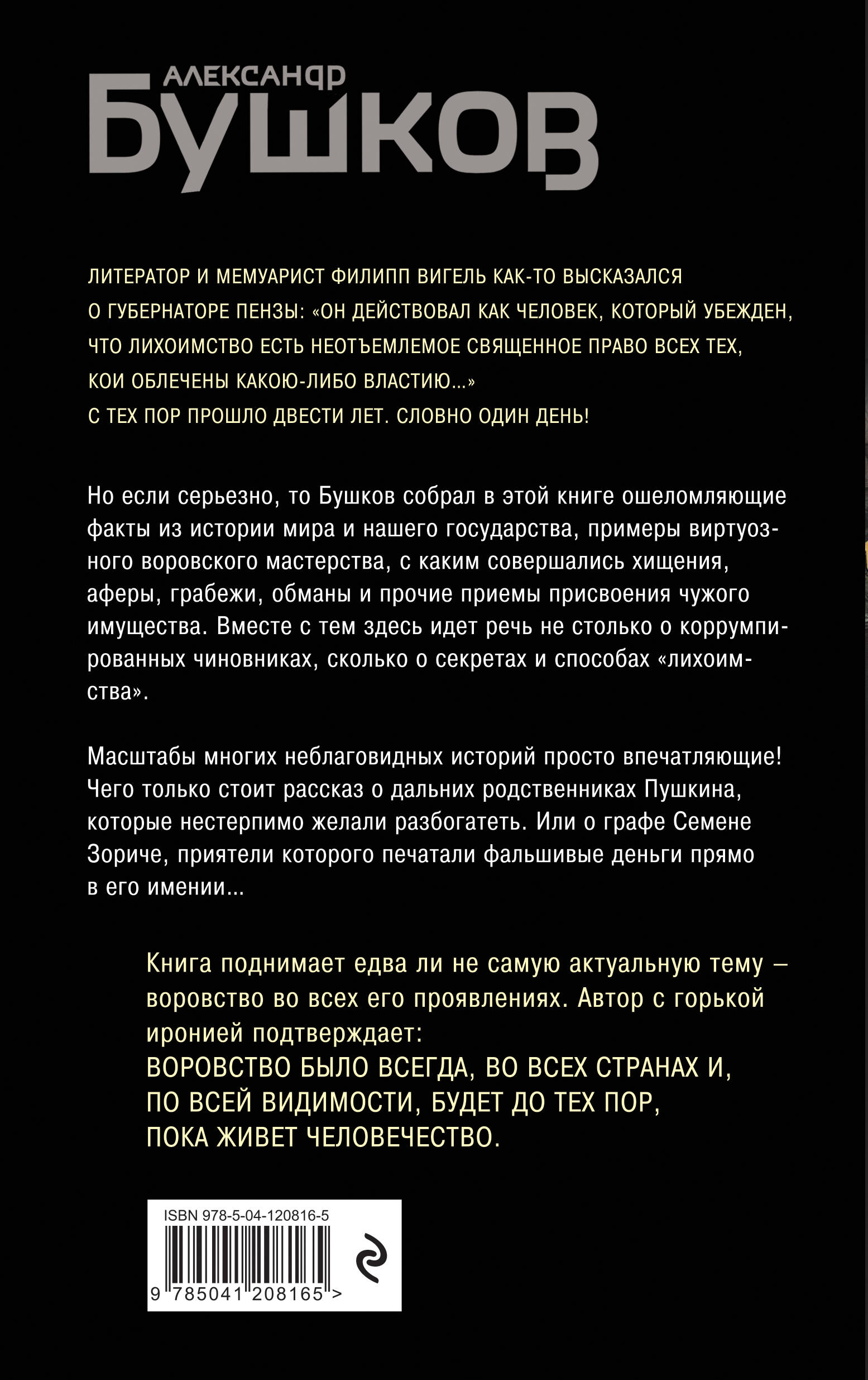 Литератор и мемуарист Филипп Вигель как-то высказался о губернаторе Пензы: «Он действовал как человек, который убеждён, что лихоимство есть неотъемлемое священное право всех тех, кои облечены какою-либо властию…» С тех пор прошло двести лет. Словно один день! В этом месте впору бы поставить смайлик с улыбочкой. Но если серьезно, то Бушков собрал в этой книге ошеломляющие факты из истории мира и нашего государства, примеры виртуозного воровского мастерства, с каким совершались хищения, аферы, грабежи, обманы и прочие приемы присвоения чужого имущества. Вместе с тем здесь идет речь не столько о коррумпированных чиновниках, сколько о секретах и способах злодеяний. Масштабы многих неблаговидных историй просто впечатляющие! Чего только стоит рассказ о дальних родственниках Пушкина, которые нестерпимо желали разбогатеть. Или о графе Семене Зориче, приятели которого печатали фальшивые деньги прямо в его имении… Книга поднимает едва ли не самую актуальную тему - воровство во всех его проявлениях. Автор с горькой иронией подтверждает: воровство было всегда, во всех странах и, по всей видимости, будет до тех пор, пока живет человечество.