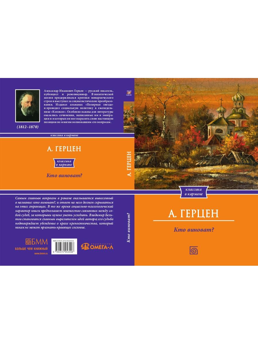Александр Иванович Герцен (1812-1870) - русский писатель, публицист и революционер. В политической жизни придерживался критики монархического строя и выступал за социалистические преобразования. Издавал альманах «Полярная звезда» и проводил социальную политику в еженедельнике «Колокол». Особенно важны для литературы оказались сочинения, написанные им в эмиграции и в которых он мог выразить свою настоящую позицию по многим волновавшим его вопросам. Самым главным вопросом в романе оказывается вынесенный в название: кто виноват?, и ответ на него должен скрываться на этих страницах. В то же время социально-психологический характер книги предполагает множество связанных между собой судеб, за которыми нужно уметь уследить. Владимир Бельтов становится главным выразителем идей автора; его судьба подтверждает убеждение о крахе крепостничества, который никак не может признать правящее сословие.| Издательство | Омега-Л |