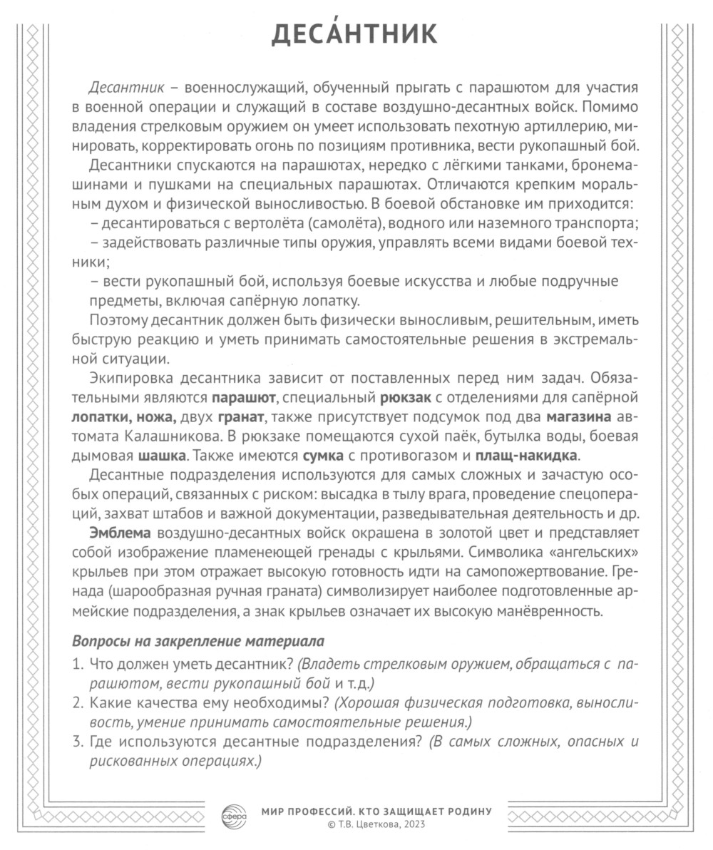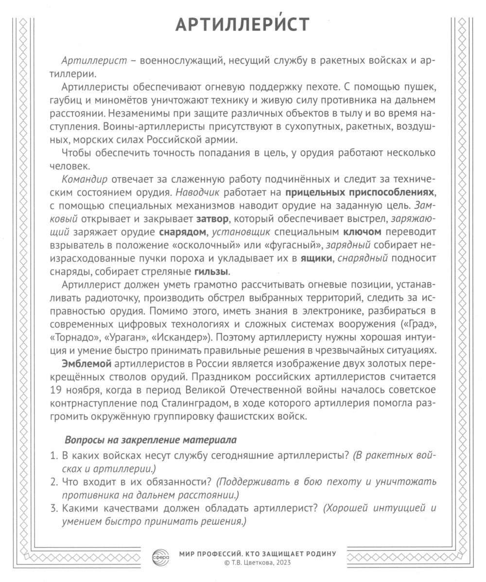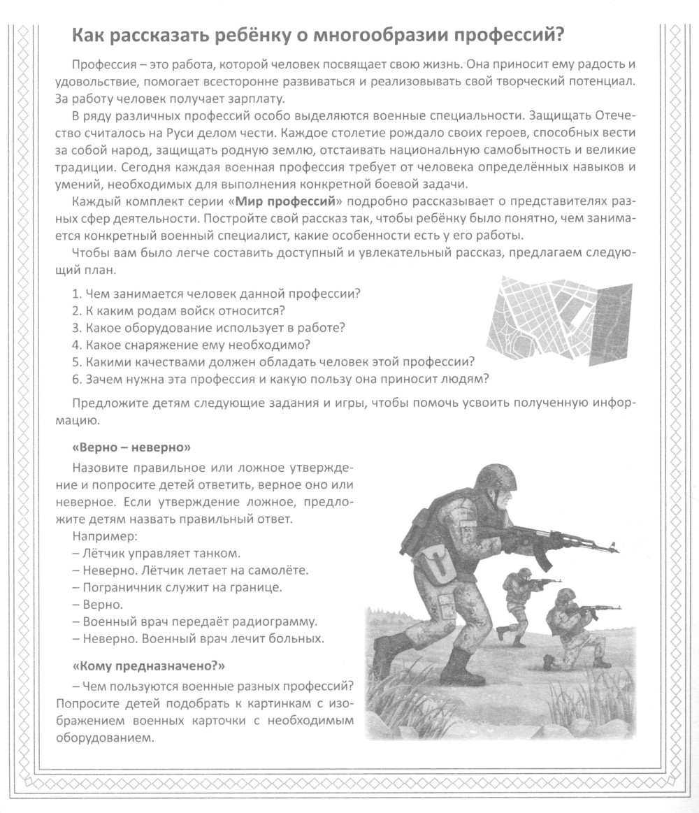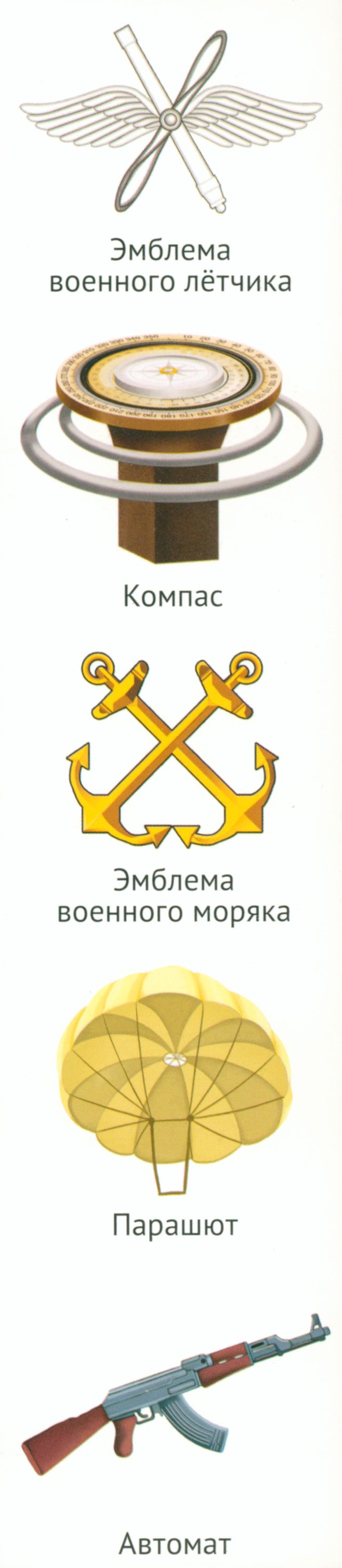 Издательство «ТЦ Сфера» представляет комплект серии «Мир профессий» под названием «Кто защищает Родину». Он состоит из 12 цветных демонстрационных картинок и адресован детям и их родителям, желающим познакомиться с современными военными профессиями, узнать много интересного из жизни военнослужащих разных родов войск. На лицевой стороне каждой картинки даётся цветное изображение военнослужащего определённой военной специальности, на обратной - подробное описание, из которого дети узнают, какой техникой и каким оборудованием пользуется каждый военный. Для лучшего закрепления материала приводятся вопросы по каждой теме. Дополнительно в комплект входят 20 разрезных мини-карточек с изображением военного оборудования и заданиями на обороте. Комплект подходит для индивидуальной и групповой работы, может использоваться на тематических викторинах и вечерах, посвящённых Дню защитника Отечества и празднованию 9 Мая.| Издательство | Творческий центр Сфера |
