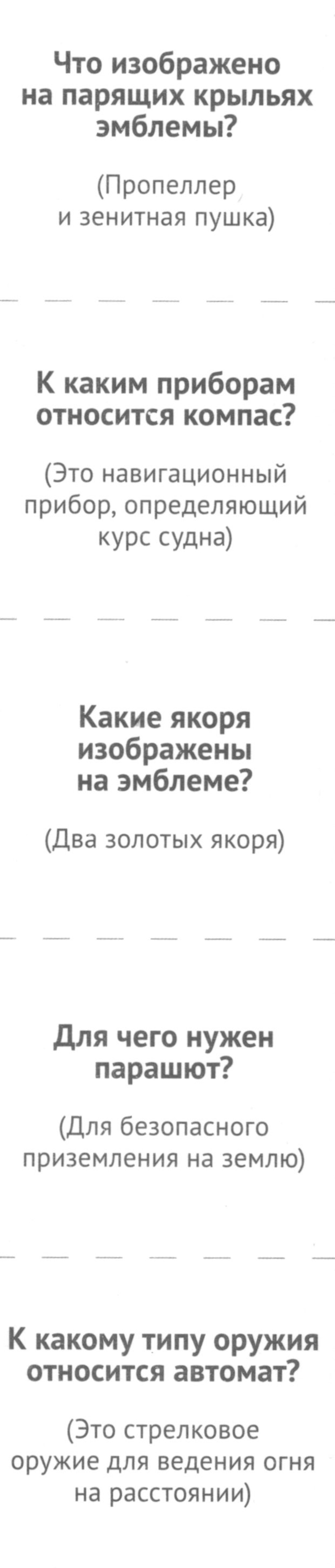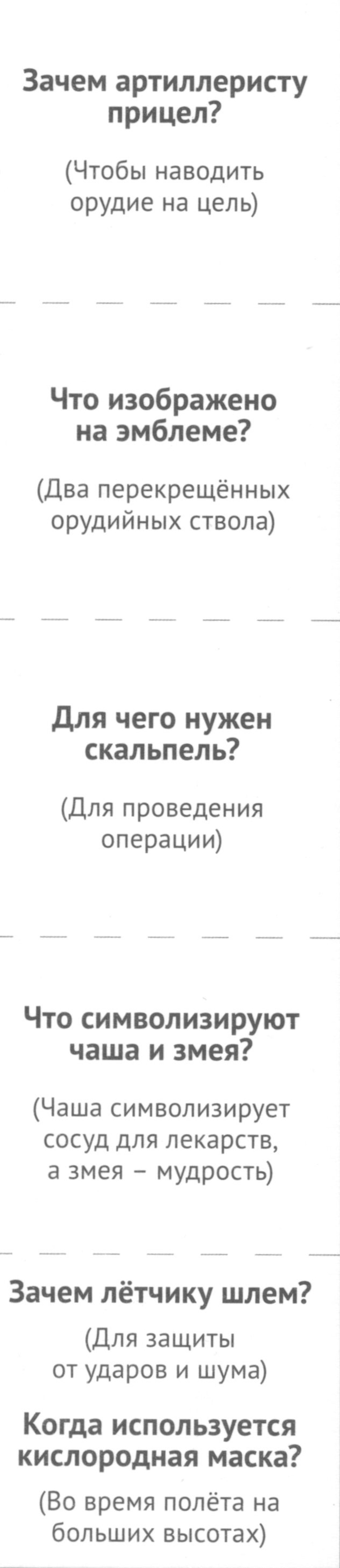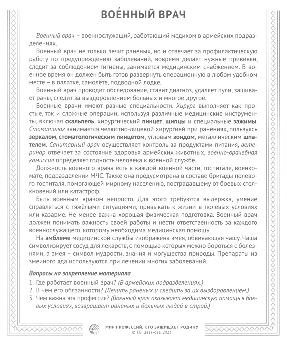 Издательство «ТЦ Сфера» представляет комплект серии «Мир профессий» под названием «Кто защищает Родину». Он состоит из 12 цветных демонстрационных картинок и адресован детям и их родителям, желающим познакомиться с современными военными профессиями, узнать много интересного из жизни военнослужащих разных родов войск. На лицевой стороне каждой картинки даётся цветное изображение военнослужащего определённой военной специальности, на обратной - подробное описание, из которого дети узнают, какой техникой и каким оборудованием пользуется каждый военный. Для лучшего закрепления материала приводятся вопросы по каждой теме. Дополнительно в комплект входят 20 разрезных мини-карточек с изображением военного оборудования и заданиями на обороте. Комплект подходит для индивидуальной и групповой работы, может использоваться на тематических викторинах и вечерах, посвящённых Дню защитника Отечества и празднованию 9 Мая.| Издательство | Творческий центр Сфера |