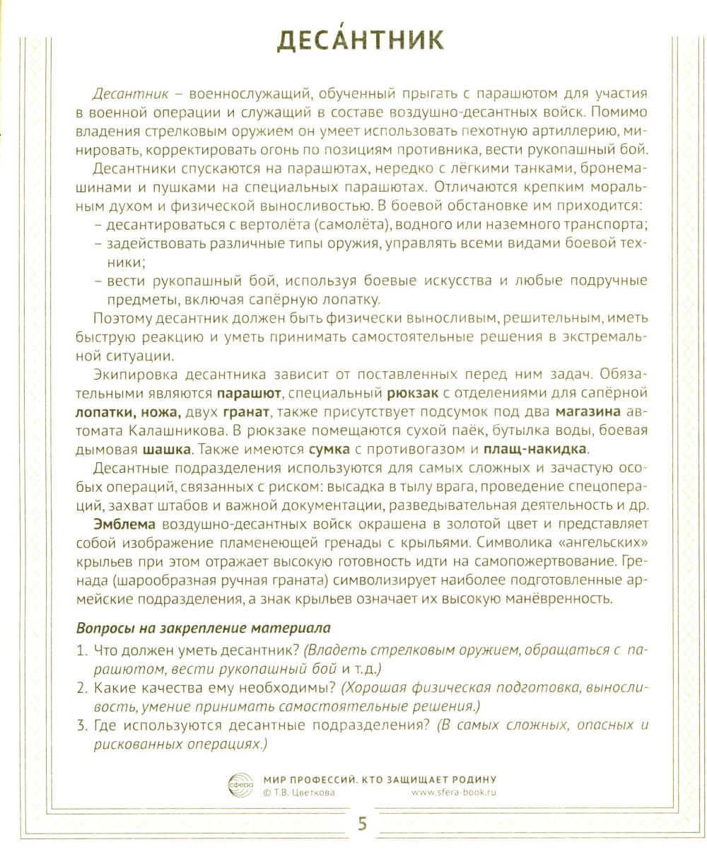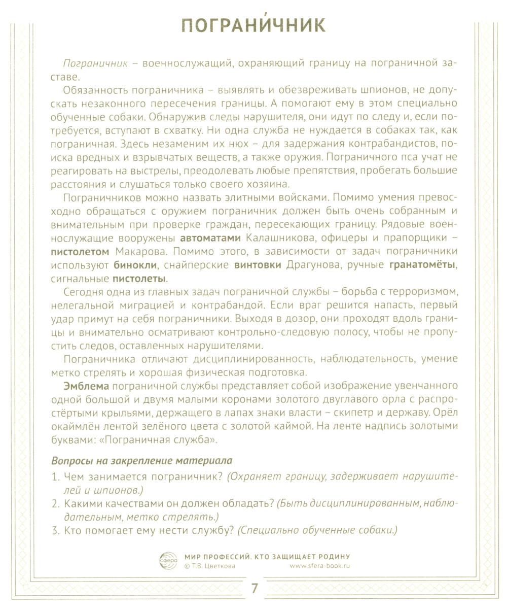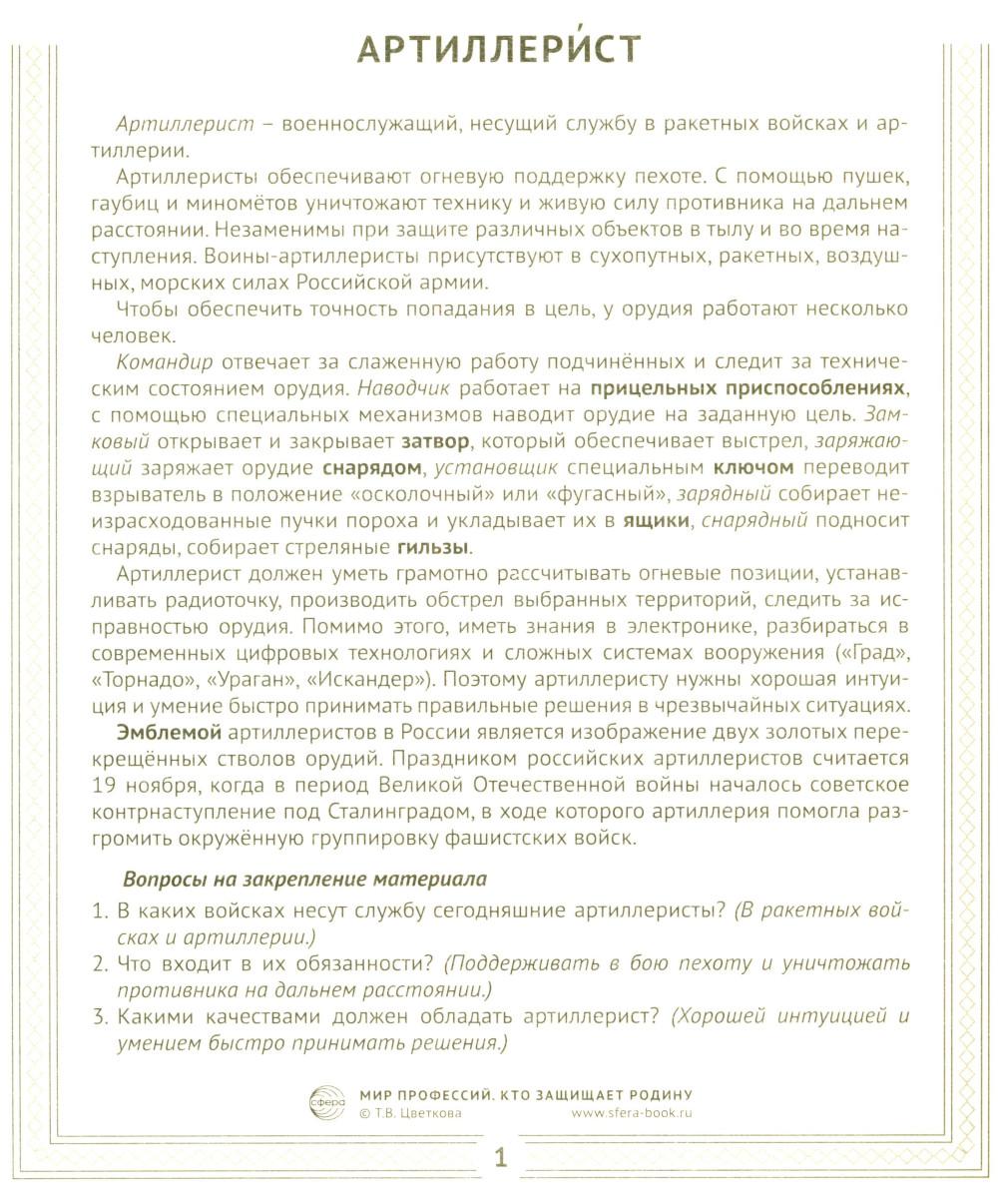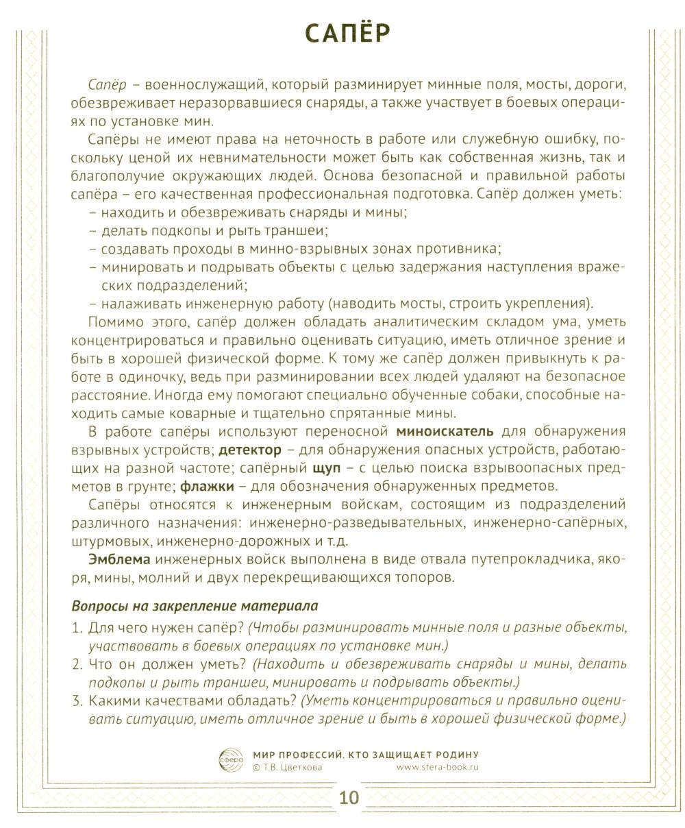 Откройте мир военных профессий с комплектом демонстрационных картинок «Кто защищает Родину»! Наш комплект - идеальное решение для родителей и педагогов, которые хотят познакомить ребенка с военными профессиями и развить его мышление, память и любознательность. Вы получите: - 12 красочных и детализированных картинок, которые привлекут внимание ребенка; - подробное описание каждой профессии на обороте картинок, которое поможет взрослому выстроить интересный и доступный рассказ; - вопросы на закрепление материала для каждой картинки, чтобы убедиться - ребенок все понял и запомнил; - 20 карточек с изображениями военных принадлежностей и заданиями на обороте, чтобы разнообразить обучение; - методические рекомендации, описание упражнений и игр на обороте обложки, чтобы вы могли максимально эффективно использовать комплект. Список карточек: - Артиллерист; - Военный врач; - Военный летчик; - Военный моряк; - Десантник; - Пехотинец; - Пограничник; - Разведчик; - Ракетчик; - Сапер; - Снайпер; - Танкист.| Издательство | Творческий центр Сфера |