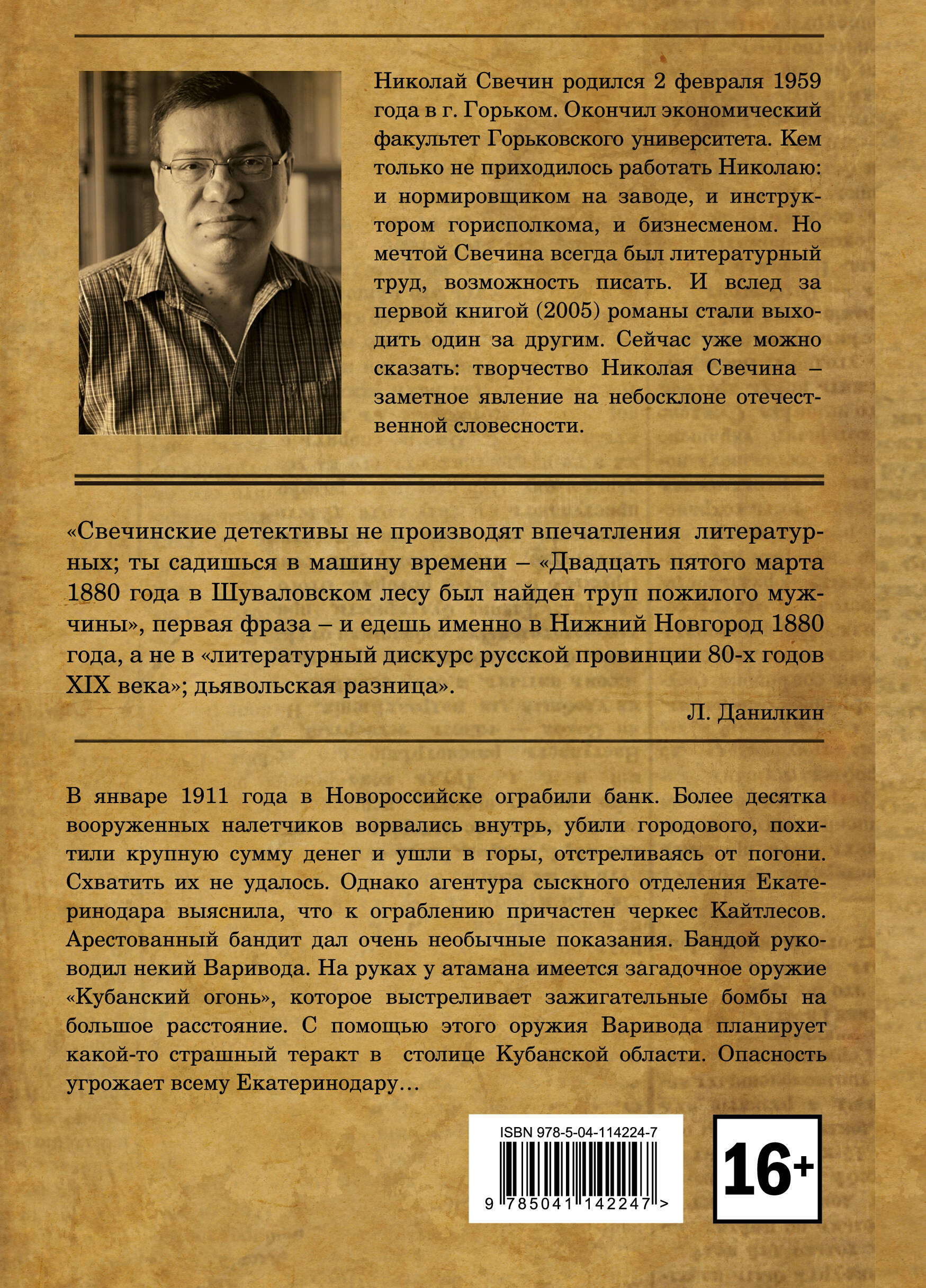В январе 1911 года в Новороссийске ограбили банк. Более десятка вооруженных налетчиков ворвались внутрь, убили городового, похитили крупную сумму денег и ушли в горы, отстреливаясь от погони. Схватить их не удалось. Однако агентура сыскного отделения Екатеринодара выяснила, что к ограблению причастен черкес Кайтлесов. Арестованный бандит дал очень необычные показания. Бандой руководил некий Варивода. На руках у атамана имеется загадочное оружие «Кубанский огонь», которое выстреливает зажигательные бомбы на большое расстояние. С помощью этого оружия Варивода планирует какой-то страшный теракт в столице Кубанской области. Опасность угрожает всему Екатеринодару… Очередной роман из серии расследований Алексея Лыкова! Одна из самых длинных и самых уважаемых серий исторического детектива в России! Стабильные новинки три раза в год, продажи выше 10 тысяч экземпляров!| Издательство | ООО "Издательство "Эксмо" |