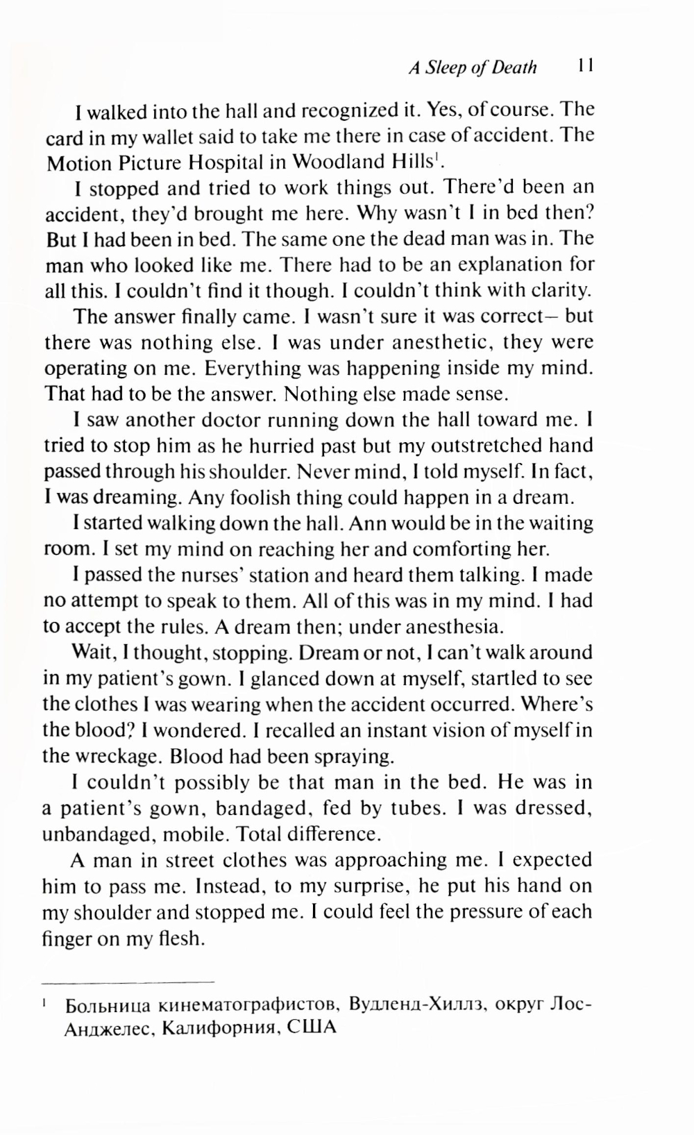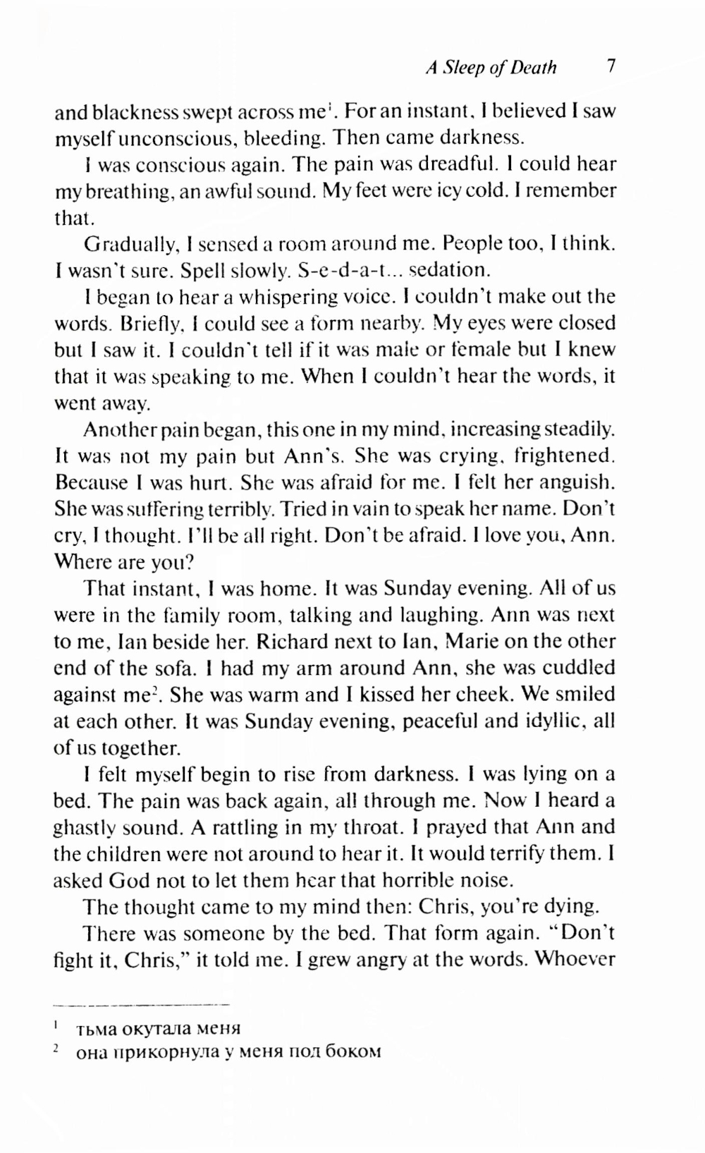Текст сокращён и адаптирован. Уровень Intermediate. Однажды утром в дверь постучала странная женщина и вручила мужчине книгу, надиктованную его умершим братом, погибшим в автомобильной катастрофе. Оказалось, что жизнь продолжается и после смерти. Более того, впереди - бесконечное странствие по неизведанным мирам и вселенным. Именно в такое путешествие суждено отправиться Крису Нильсену, чтобы спастись от отчаяния и вновь обрести надежду и любовь. После аварии его душа попадает в рай, где он готов долгие годы ждать встречи с любимой женой. Однако через некоторое время, не выдержав одиночества, его жена Энн кончает жизнь самоубийством. Из-за смертного греха её душа попадает в ад. Узнав об этом, душа Криса отправляется на поиски жены.| Издательство | Антология |