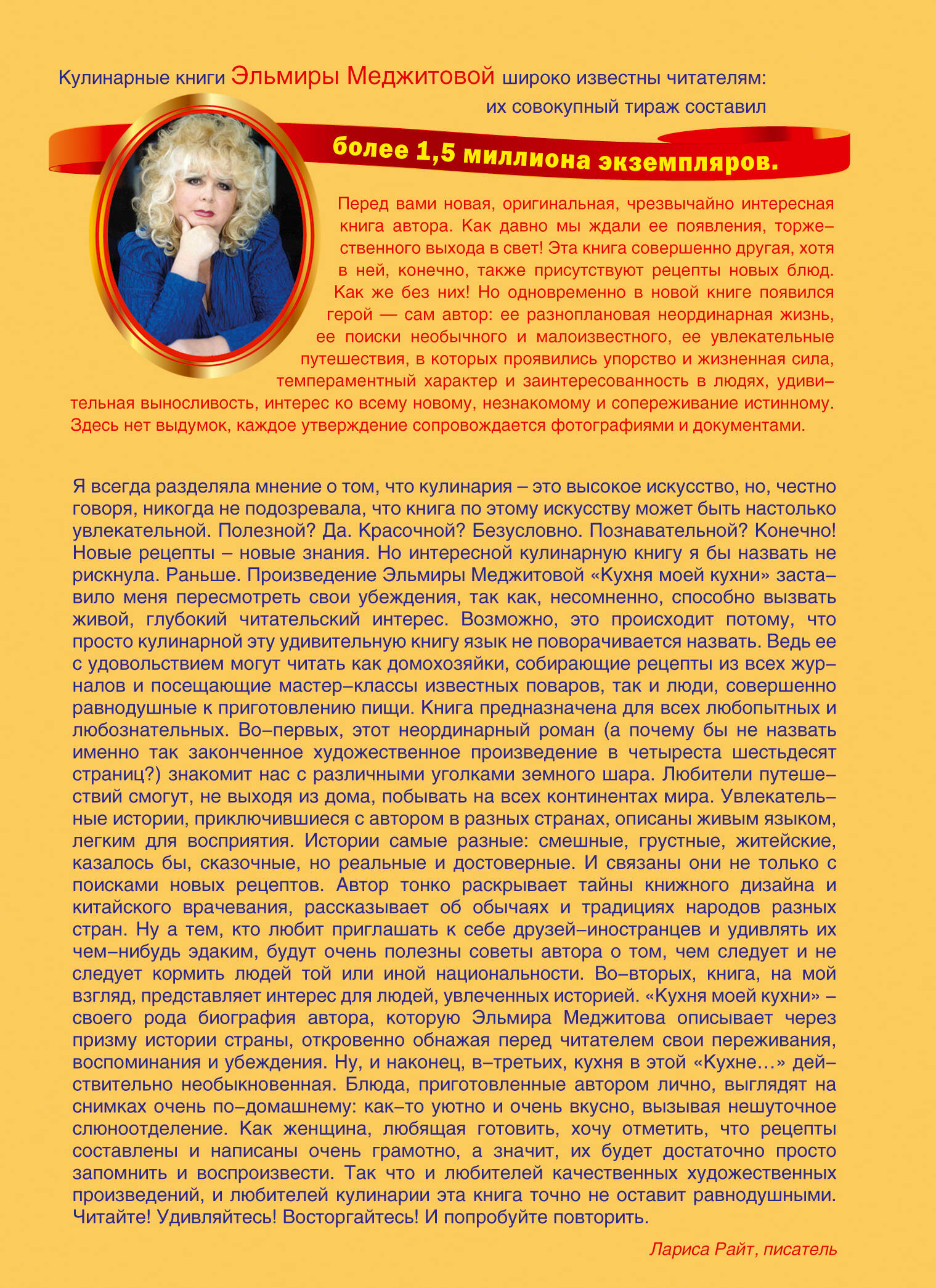 Перед вами новая книга Э.Меджитовой. Как давно мы ждали ее появления, торжественного выхода в свет. Она совершенно другая, хотя в ней, конечно, присутствуют рецепты совершенно новых блюд, Как же без них! Но одновременно с привычным в новой книге появился герой - сам автор: ее жизнь, захватывающая и такая разноплановая, ее поиски необычного, нескучного, ее путешествия, в которых проявились удивительная выносливость, упорство и жизненная сила, темпераментный характер и заинтересованность в людях, любопытство к незнакомому и сопереживание истинному. Язык книги простой, но без фамильярности, с юмором, но без пошлости. Перед читателями пролистывается живая жизнь, живой характер, живая книга и читается она с большим удовольствием!| Издательство | Эксмо |