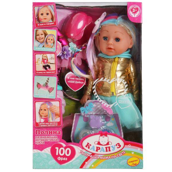 Аннотация: Кукла функциональная АБВГДЙКА песня Полина 35см с цветными прядями, 9акс,кор КАРАПУЗ в кор.12шт