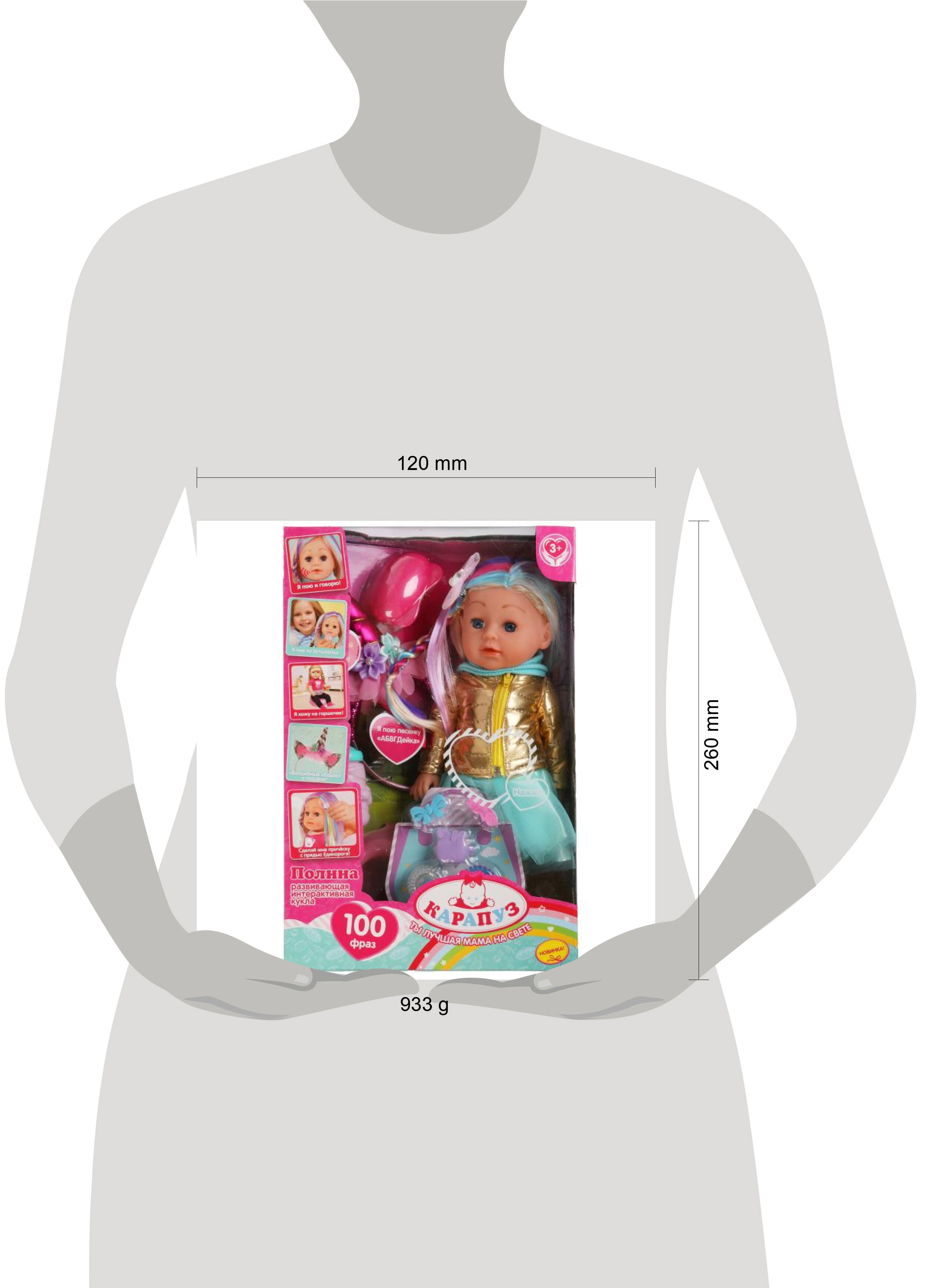 Развивающая интерактивная кукла "Полина" ТМ "Карапуз" станет прекрасным подарком для вашей маленькой принцессы: - поёт 2 песни: "АБВГДейка", "Волшебный цветок" - рассказывает 3 стихотворения - знает 2 скороговорки - загадывает 2 загадки - говорит разные фразы - пьёт из бутылочки - ходит на горшок - вместе учим вежливые слова - учимся быть аккуратными - учимся помогать маме - волшебный ободок в подарок В комплекте: - расчёска - заколки и резинки - бутылочка - горшок Милая кукла с детально проработанным личиком обязательно понравится малышке. Полина одета в золотистую курточку на молнии и пышную бирюзовую юбку из фатина. Одежда легко снимается и надевается. У куклы длинные красивые волосы с цветными прядями. Хозяйка куколки легко сможет сделать Полине причёску по своему желанию, для этого в наборе имеется расческа, резиночки и заколки. Игра с интерактивными куклами ТМ "Карапуз" учит ребёнка заботиться об окружающих, быть ответственным и внимательным, а также развивает: - воображение - память - звуковое восприятие и музыкальный слух - социально-коммуникативные навыки Рост куклы: 35 см. Материал: пластмасса + текстиль. Работает от 3-х батареек типа LR44 (в комплекте). Рекомендовано детям от 3-х лет.