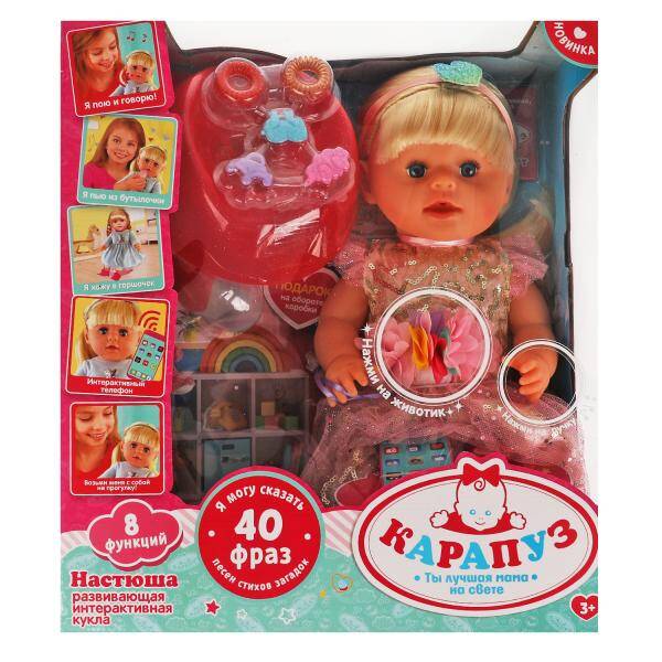 Аннотация: Кукла функциональная Волшебники двора (песни) Настюша 40см, пьет,писает, 8акс КАРАПУЗ в кор.8шт