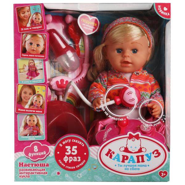 Развивающая интерактивная кукла "Настюша" ТМ "Карапуз" станет прекрасным подарком для вашей маленькой принцессы: - поёт 10 песен: "Песенка Мамонтёнка", "Дружба крепкая", "Изумрудный город", "Мало молока" (Волшебники двора), "Улыбка", "Антошка", "Всё мы делим пополам", "Облака", "Волшебный цветок", "Мамочка" (Волшебники двора) - говорит 11 фраз: "Привет, подружка!", "Как твои дела?", "Подружка, я вчера съела много мороженого, замёрзла и заболела", "У меня теперь болит горлышко!", "Полечи меня, пожалуйста! Дай мне лекарство!", "Спасибо, подружка! Я выздоровела!", "Ты меня вылечила, я снова могу петь и веселиться!", "Хочешь я спою тебе любимые песенки?", "Я знаю много стихов!", "Я загадаю тебе загадки!", "Я люблю тебя, подружка! Ты у меня самая лучшая!" - издаёт детские звуки - загадывает 4 загадки: "Про зебру", "Про петуха", "Про ёжика", "Про тигра" - рассказывает 7 стихотворений "Хорошие манеры": "Доброе утро", "Улыбаться", "Умываться", "Чищу зубки", "Будь здорова", "Помощь маме", "Спасибо" - пьёт из бутылочки - ходит на горшок - горят щечки - ест из ложечки В комплекте: - магнитная ложка - стетоскоп - бутылочка - горшок - пустышка - 3 заколки Милая кукла с детально проработанным личиком обязательно понравится малышке. Настюша одета в яркую тёплую кофточку с повязкой на голове в тон и розовую юбочку. Одежда легко снимается и надевается. У куклы длинные красивые волосы, которые хозяйка куколки легко сможет укладывать в разнообразные причёски, для этого в наборе имеются заколки. Игра с интерактивными куклами ТМ "Карапуз" учит ребёнка заботиться об окружающих, быть ответственным и внимательным, а также развивает: - воображение - память - звуковое восприятие и музыкальный слух - социально-коммуникативные навыки Рост куклы: 40 см. Материал: пластмасса + текстиль. Работает от 3-х батареек типа АА (в комплекте). Рекомендовано детям от 3-х лет.