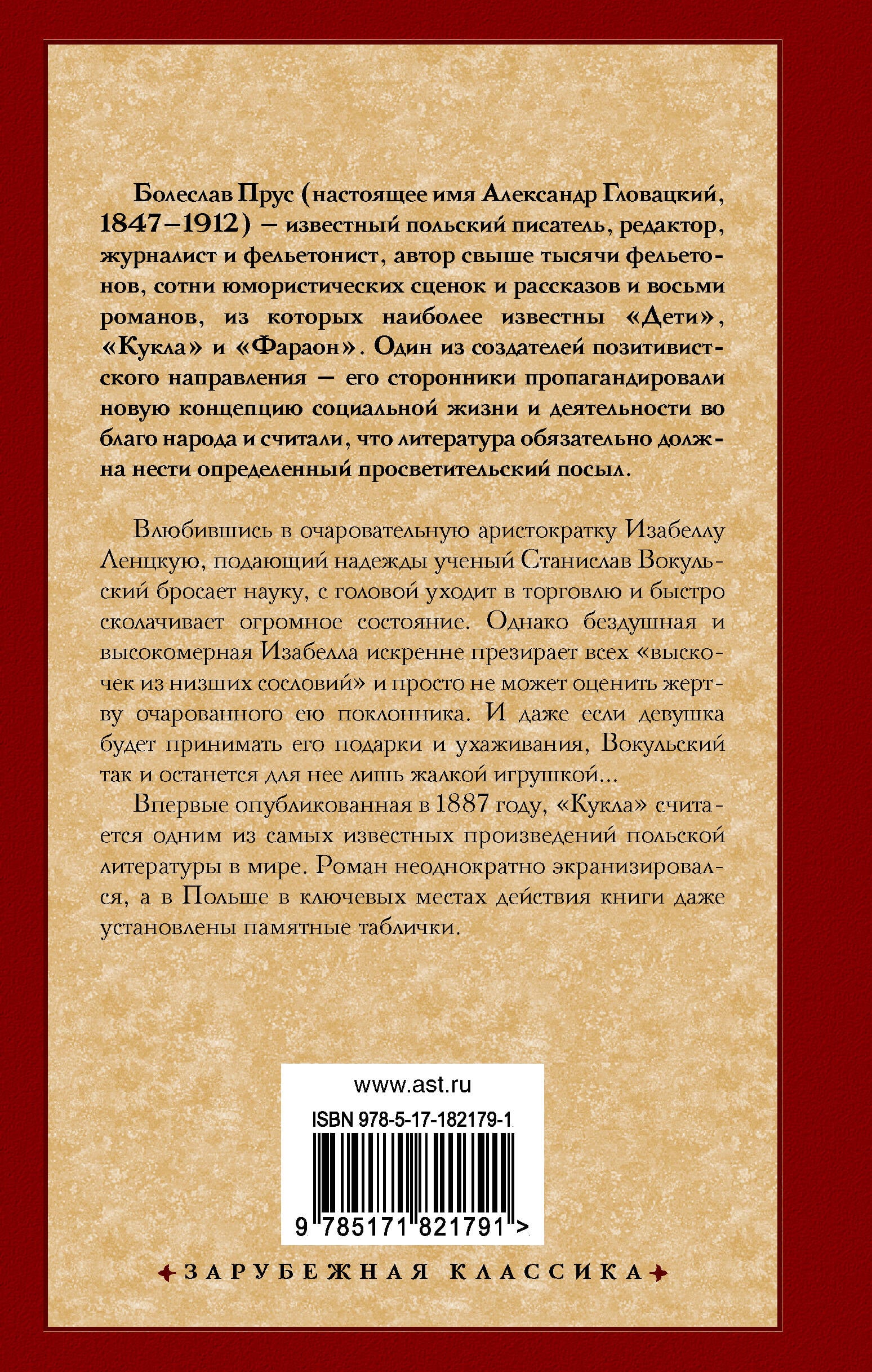 Влюбившись в очаровательную аристократку Изабеллу Ленцкую, подающий надежды ученый Станислав Вокульский бросает науку, с головой уходит в торговлю и быстро сколачивает огромное состояние. Однако бездушная и высокомерная Изабелла искренне презирает всех "выскочек из низших сословий" и просто не может оценить жертву очарованного ею поклонника. И даже если девушка будет принимать его подарки и ухаживания, Вокульский так и останется для нее лишь жалкой игрушкой… Впервые опубликованная в 1887 году, "Кукла" считается одним из самых известных произведений польской литературы в мире. Роман неоднократно экранизировался, а в Польше в ключевых местах действия книги даже установлены памятные таблички.| Издательство | Издательство "АСТ" |
