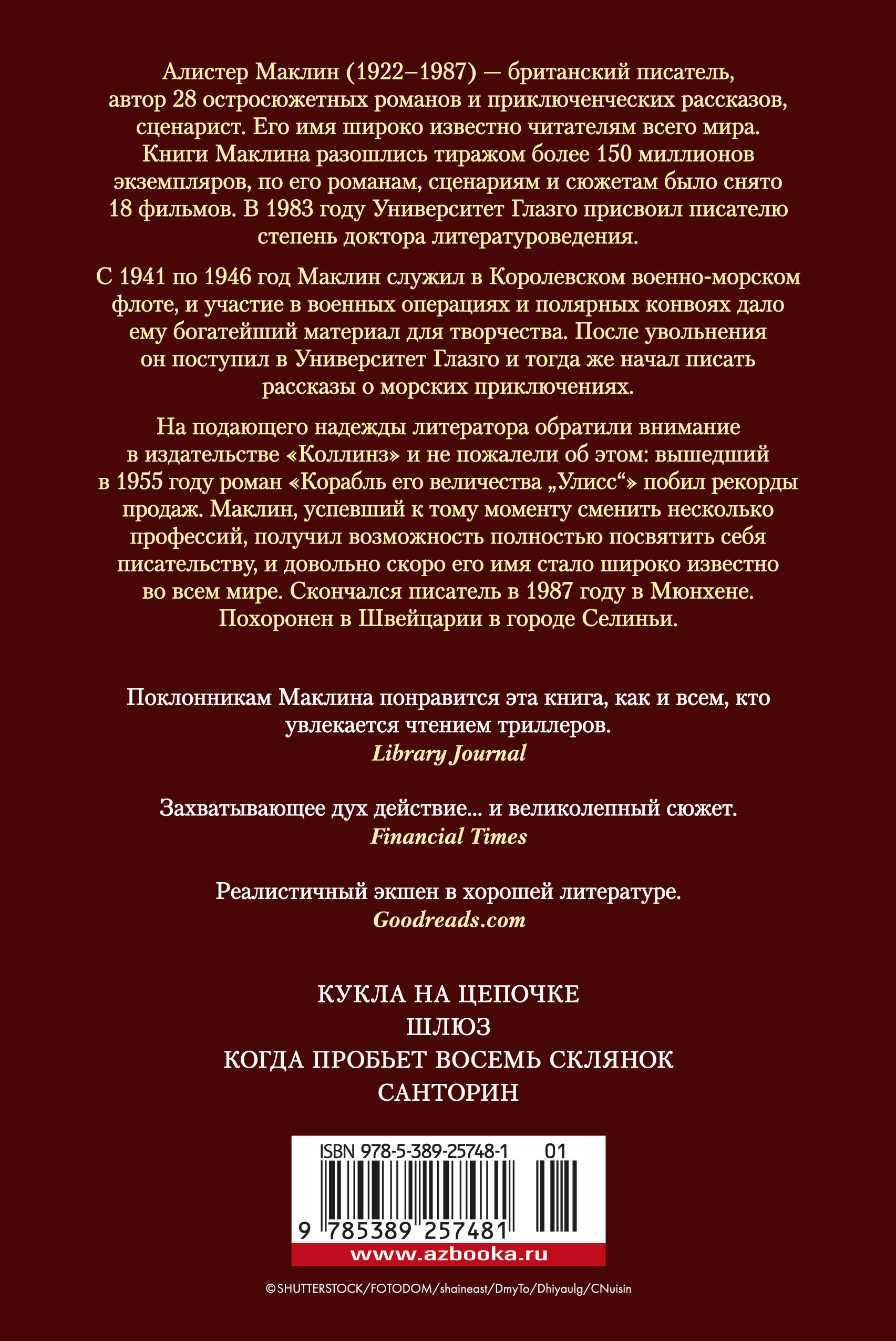 Алистер Маклин (1922-1987) - британский писатель, автор 28 остросюжетных романов и приключенческих рассказов, сценарист. Его имя широко известно читателям всего мира. Книги Маклина разошлись тиражом более 150 миллионов экземпляров, по его романам, сценариям и сюжетам было снято 18 фильмов. В 1983 году Университет Глазго присвоил писателю степень доктора литературоведения. Герои Маклина живут и побеждают по всему земному шару, "от коммунистической Венгрии и Мексиканского залива до Сингапура, юга Франции, Сан-Франциско, Нидерландов и Северного Ледовитого океана". Флагман сборника - "Кукла на цепочке". Матерый агент Интерпола, чьи методы работы порой выходят за рамки закона, прилетает в Амстердам, чтобы разоблачить преступный синдикат. И попадает в изощренную ловушку, расставленную врагами... Сюжет "Шлюза" связан с предыдущим романом. Террористы взрывают дамбу и угрожают затопить всю Голландию, если их требования не будут выполнены. Шеф полиции Амстердама поручает агенту под прикрытием внедриться в группировку... У берегов Шотландии угоняют несколько судов с драгоценным грузом ("Когда пробьет восемь склянок"). Готовится операция по обезвреживанию пиратов, но происходит нечто непредвиденное... В Эгейском море терпит катастрофу самолет ("Санторин"). Падение бомбардировщика с ядерным оружием на борту может вызвать извержение вулкана, цунами и ядерную зиму... Три романа в сборнике (кроме "Шлюза") выходят в новом переводе.| Издательство | Азбука-Аттикус Издат.группа ООО |