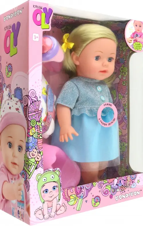 Пупс OLY от Bondibon - это очаровательный малыш, который непременно завоюет сердце любой девочки. У него забавная мордашка и милый костюмчик, который можно снимать и надевать. У пупсика двигаются ручки, ножки, а еще он умеет пить из бутылочки и ходить на горшок! Когда пупсик недоволен, он плачет, а еще он может издавать другие звуки и даже произносить слова! В комплекте с пупсом Вы найдете бутылочку для кормления, горшочек и памперс. Питание звукового механизма - 3*AG13 (включены в комплект).