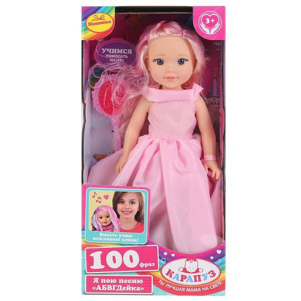 Аннотация: Кукла озвуч АБВГДЙКА песня Катерина 38см, в платье, с цвет. волосами, акс,кор КАРАПУЗ в кор.24шт