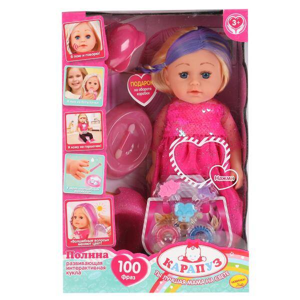 Аннотация: Кукла озвученная АБВГДЙКА песня Полина 35см,пьет,пис, волос мен-т цвет,акс,кор КАРАПУЗ в кор.12шт