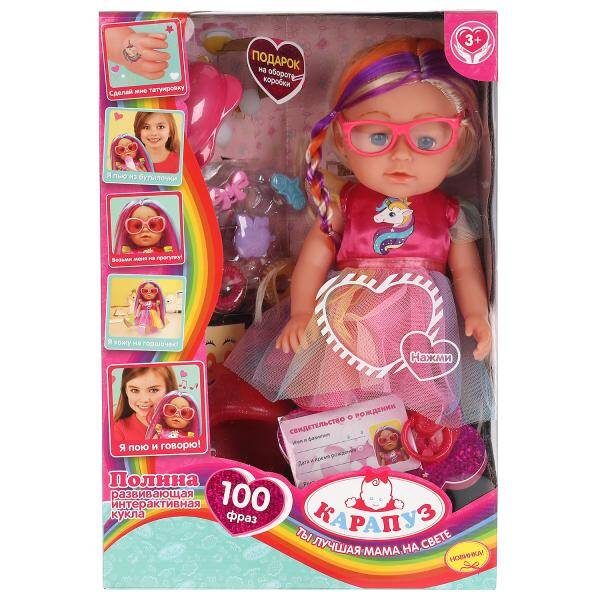 Аннотация: Кукла озвученная АБВГДЙКА песня Полина 35см, в комплекте тату, очки, 9 акс КАРАПУЗ в кор.12шт
