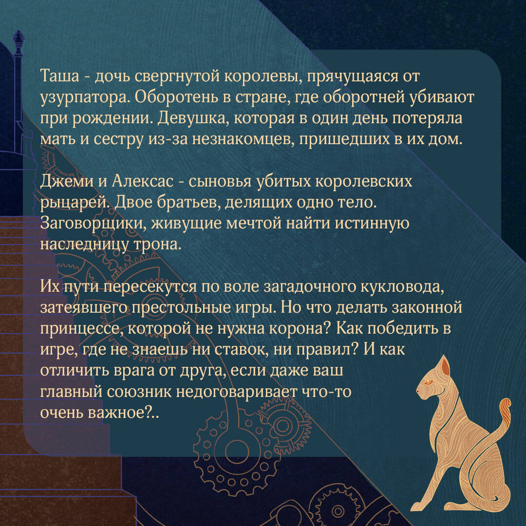 Таша - дочь свергнутой королевы, прячущаяся от узурпатора. Оборотень в стране, где оборотней убивают при рождении. Девушка, которая в один день потеряла мать и сестру из-за незнакомцев, пришедших в их дом. Джеми и Алексас - сыновья убитых королевских рыцарей. Двое братьев, делящих одно тело. Заговорщики, живущие мечтой найти истинную наследницу трона. Их пути пересекутся по воле загадочного кукловода, затеявшего престольные игры. Но что делать законной принцессе, которой не нужна корона? Как победить в игре, где не знаешь ни ставок, ни правил? И как отличить врага от друга, если даже ваш главный союзник недоговаривает что-то очень важное?.. Первая часть таинственной тетралогии Евгении Сафоновой «Кукольная королева» в новом оформлении! Мрачная сказка о наследнице свергнутого короля, девушке, потерявшей всё, но идущей вперед. Цверги, маги, альвы, люди, оборотни - герои, которые не оставят вас равнодушными. Проработанный и детальный авторский мир. Роман по достоинству оценили не только читатели, но и книжные блогеры и рецензенты журнала «Мир фантастики». История полюбилась Хелависе, лидеру популярной фолк-группы «Мельница». Обложку и внутренние иллюстрации для книги подготовила популярная художница Таня Дюрер. Оформление страниц и карту подготовила художница Анна Лужецкая (Aaerynn). Темные силы вступили в игру. Готовы ли вы дать отпор?| Издательство | ООО "Издательство "Эксмо" |