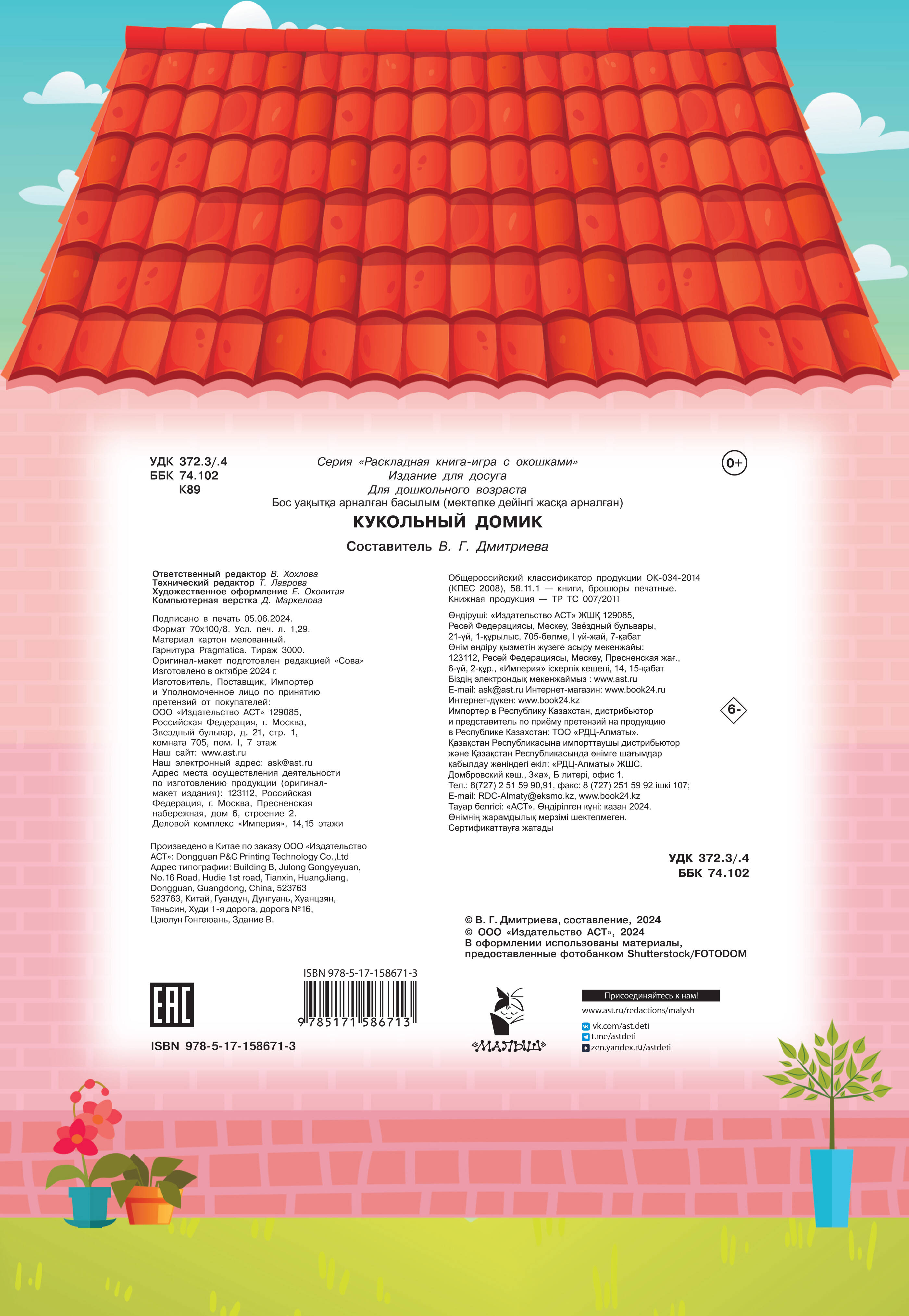 «Кукольный домик» - это необычная удивительная книга, с которой можно играть! Открываем книгу - и перед нами возникает макет дома длиной более 2-х метров. Малышам предстоит детально изучить множество разнообразных комнат, понять их назначение и узнать, как всё устроено в доме. Прихожая, гостиная, детская, столовая, спальня, ванная, кухня, игровая, каминная и другие - в нашем доме более 20 комнат! Маленькие хозяйки большого дома с любопытством откроют клапаны-окошки, внутри которых найдут много интересного и занимательного. Что хранится в шкафах? Где могут быть спрятаны трубы? Что находится в холодильнике? Как устроена духовка? Игры с окошками развивают мелкую моторику, внимание, мышление и логику. Книга содержит множество интересных деталей и ярких картинок. Она большого формата и сделана из плотного картона, поэтому прослужит долго. Отличный подарок, который порадует любого ребёнка!| Издательство | Издательство "АСТ" |