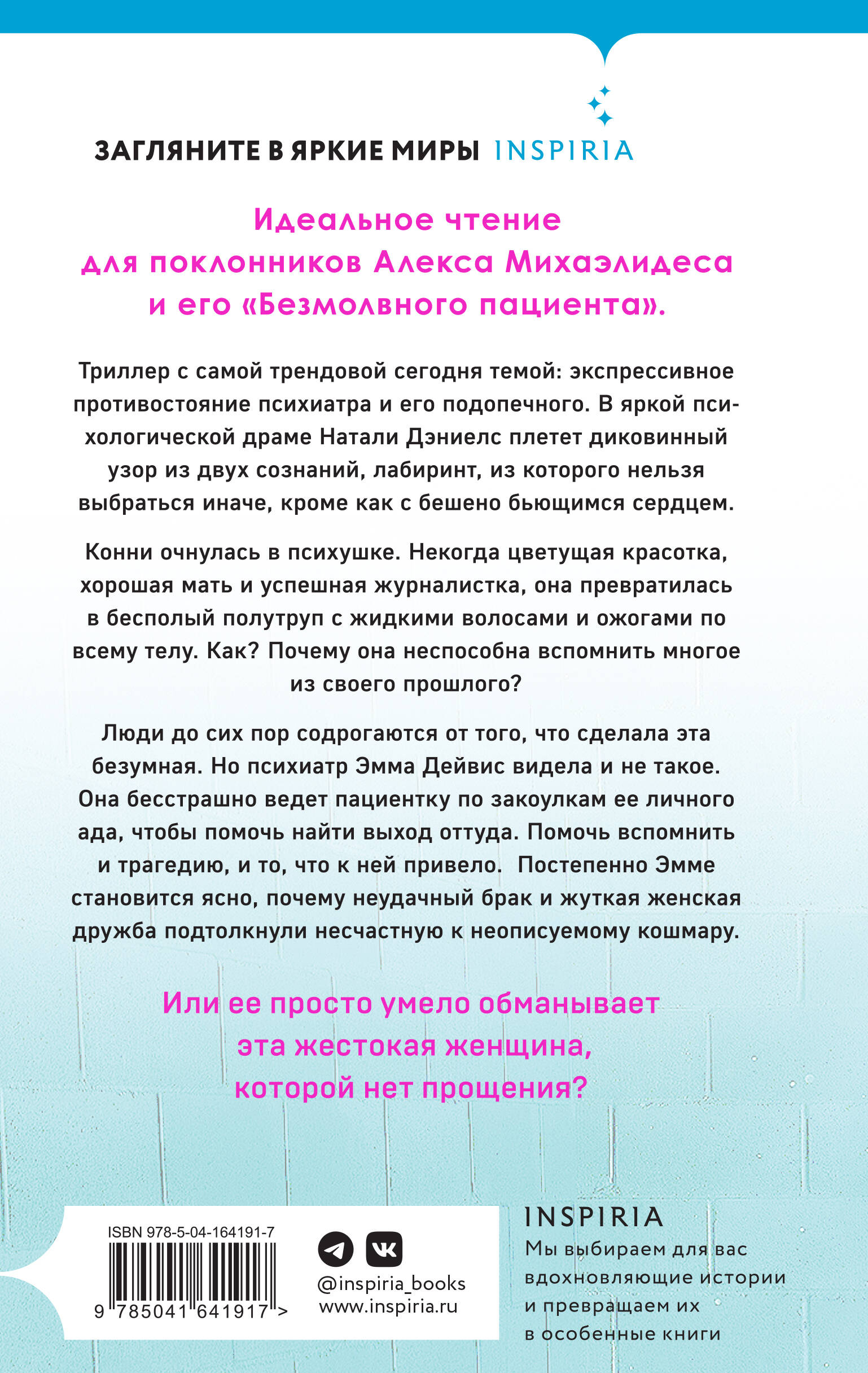 Идеальное чтение для поклонников Алекса Михаэлидеса и его «Безмолвного пациента». Триллер с самой трендовой сегодня темой: экспрессивное противостояние психиатра и его подопечного. В яркой психологической драме Натали Дэниелс плетет диковинный узор из двух сознаний, лабиринт, из которого нельзя выбраться иначе, кроме как с бешено бьющимся сердцем. Конни очнулась в психушке. Некогда цветущая красотка, хорошая мать и успешная журналистка, она превратилась в бесполый полутруп с жидкими волосами и ожогами по всему телу. Как? Почему она не способна вспомнить многое из своего прошлого? Люди до сих пор содрогаются от того, что сделала эта безумная. Но психиатр Эмма Дейвис видела и не такое. Она бесстрашно ведет пациентку по закоулкам ее личного ада, чтобы помочь найти выход оттуда. Помочь вспомнить и трагедию, и то, что к ней привело. Постепенно Эмме становится ясно, почему неудачный брак и жуткая женская дружба подтолкнули несчастную к неописуемому кошмару. Или ее просто умело обманывает эта жестокая женщина, которой нет прощения? Ее поступок - за гранью добра и зла. Осталось только вспомнить его… «Жестокий, беспощадный взгляд на суть любви, верности и предательства». - Publishers Weekly| Издательство | Эксмо |