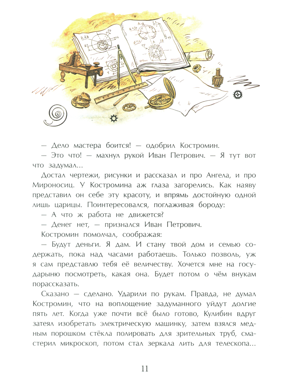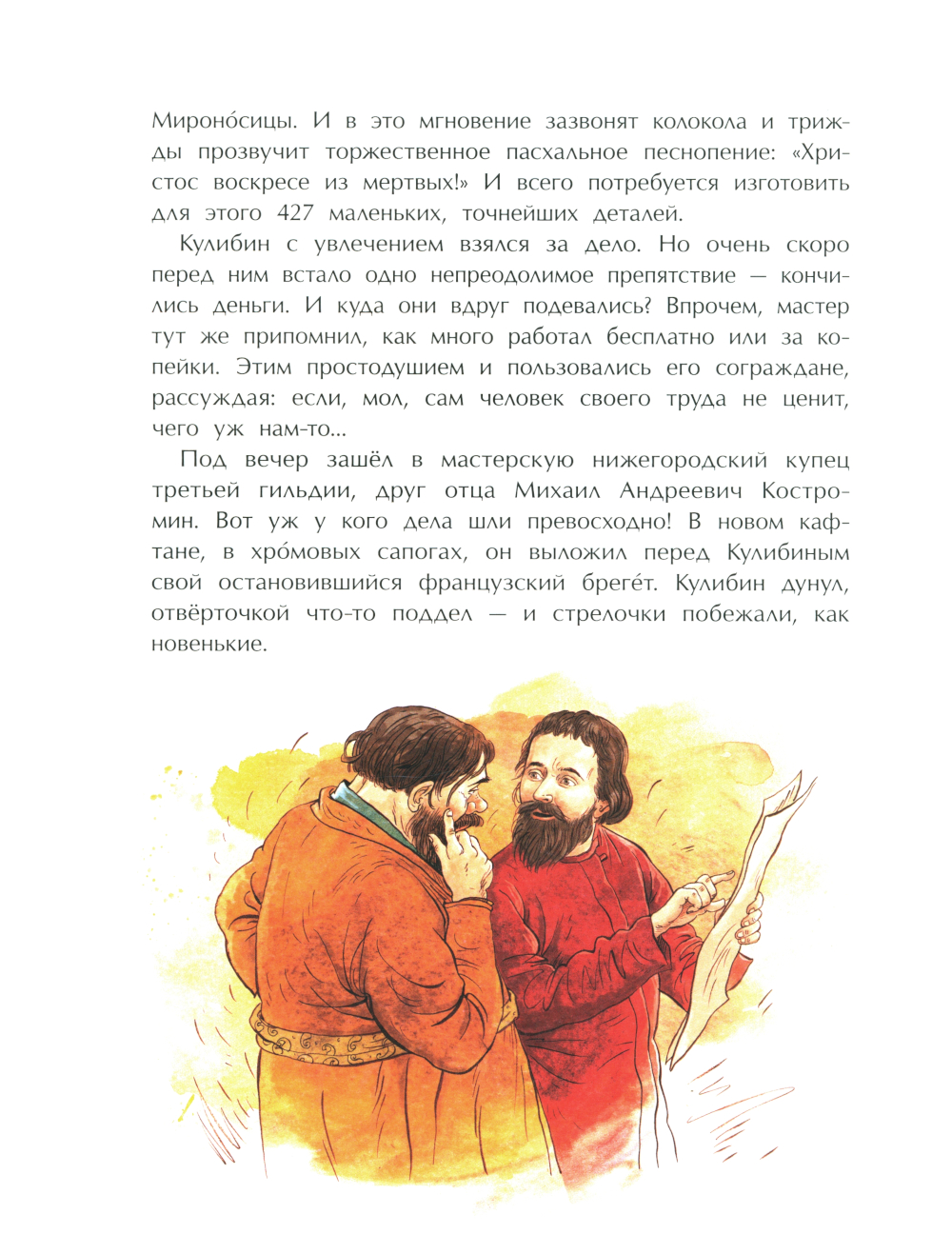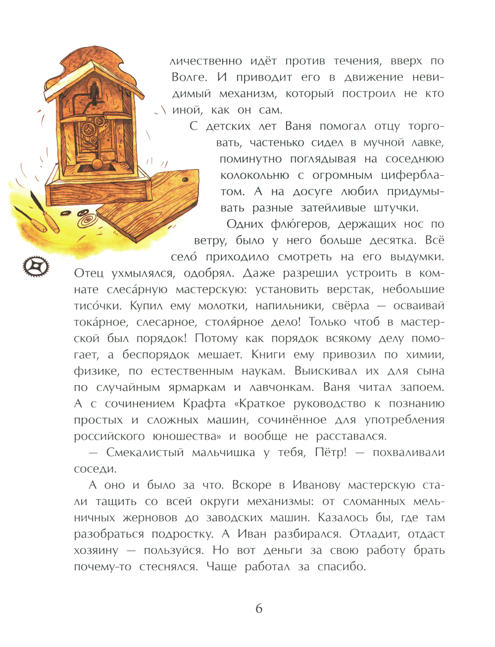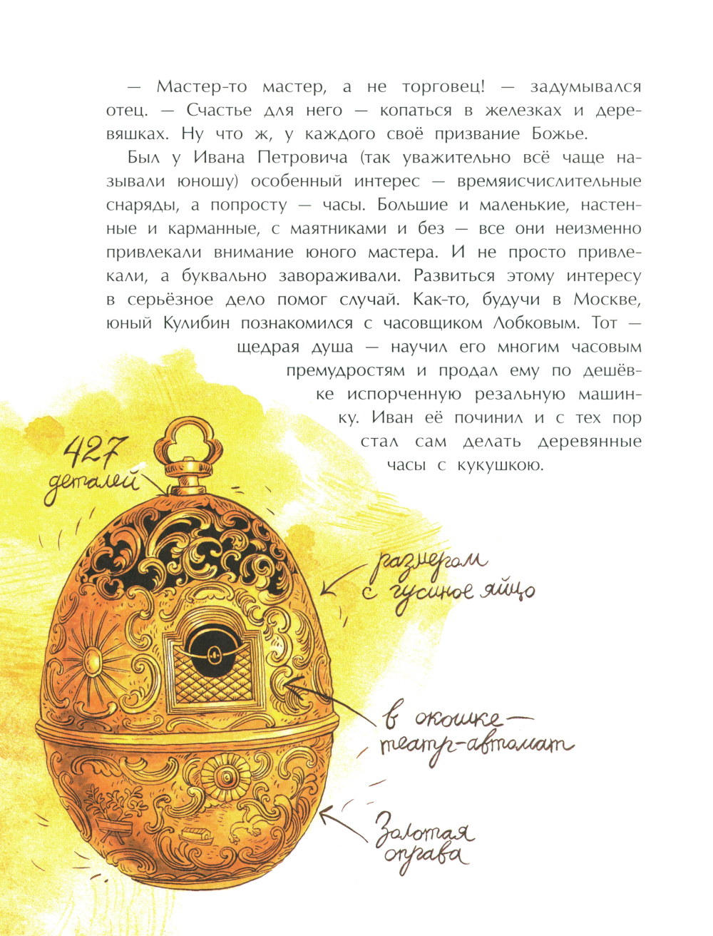 Иван Кулибин - русский изобретатель-самоучка 18 века, намного опередивший свое время. Не имея никакого специального образования, он строил такие вещи, которыми восхищались лучшие учёные мира. Сколько же он всего придумал! «Самобеглую» коляску - прообраз будущих автомашин. Самоходное судно, упразднившее тяжкий труд бурлаков. Фейерверки, которым могли бы позавидовать самые искусные пиротехники Китая. А его знаменитые часы - подарок императрице Екатерине - и поныне хранятся в музее «Эрмитаж» в Санкт-Петербурге, удивляя и восхищая и простых людей, и специалистов. Это уже второе издание книги «Кулибин». Она пользовалась таким успехом, что разошлось в самые короткие сроки.| Издательство | Настя и Никита |
