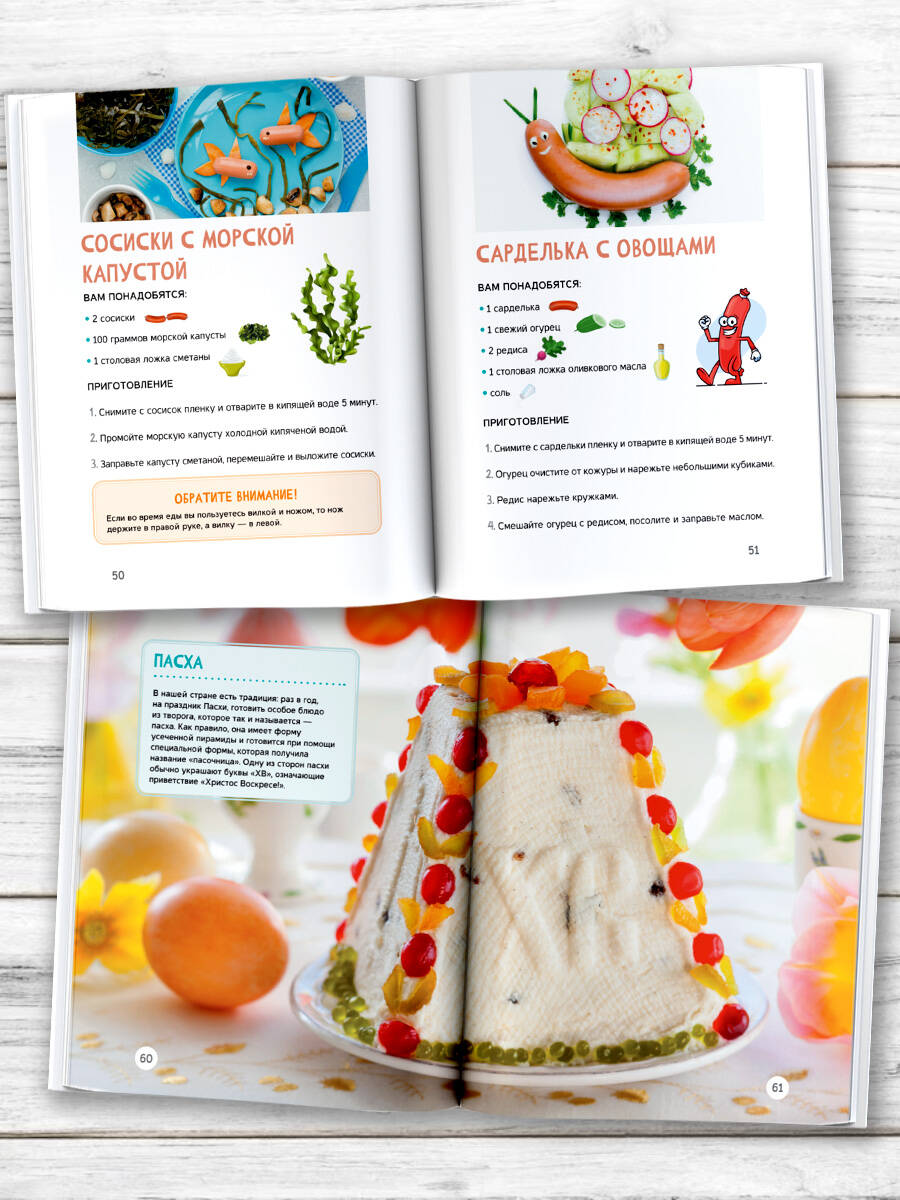 Чтобы ребенок заинтересовался кулинарией, следует превратить приготовление пищи в веселую игру. А если вовлечь в нее и других членов семьи, это будет замечательным поводом для совместного времяпрепровождения. Также вам может понадобиться кулинарная книга для детей, содержащая достаточно простые, но оригинальные рецепты с пошаговыми инструкциями. Такое издание мы вам и предлагаем. Его можно назвать практическим руководством для начинающего кулинара, ведь в книге подробно описано приготовление самых разных блюд, из которых можно организовать как быстрый перекус, так и полноценный прием пищи. Бутерброды и пиццы, аппетитные вареники и сырники, воздушные омлеты и витаминные салаты, нежные супы-пюре и румяные котлеты, вкусные каши и макароны, блины и оладьи, как у бабушки, и даже праздничные десерты - рецепты этих и многих других блюд найдут в нашей книге мальчишки и девчонки. А яркие, зрелищные иллюстрации, любопытные факты и маленькие секреты превратят рутинное приготовление еды в захватывающее, похожее на приключение занятие, которое может стать для вашего ребенка увлечением на всю жизнь. Для младшего школьного возраста.| Издательство | Издательство "АСТ" |