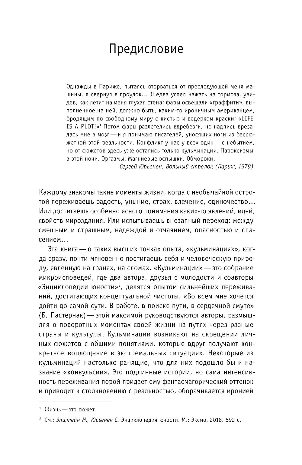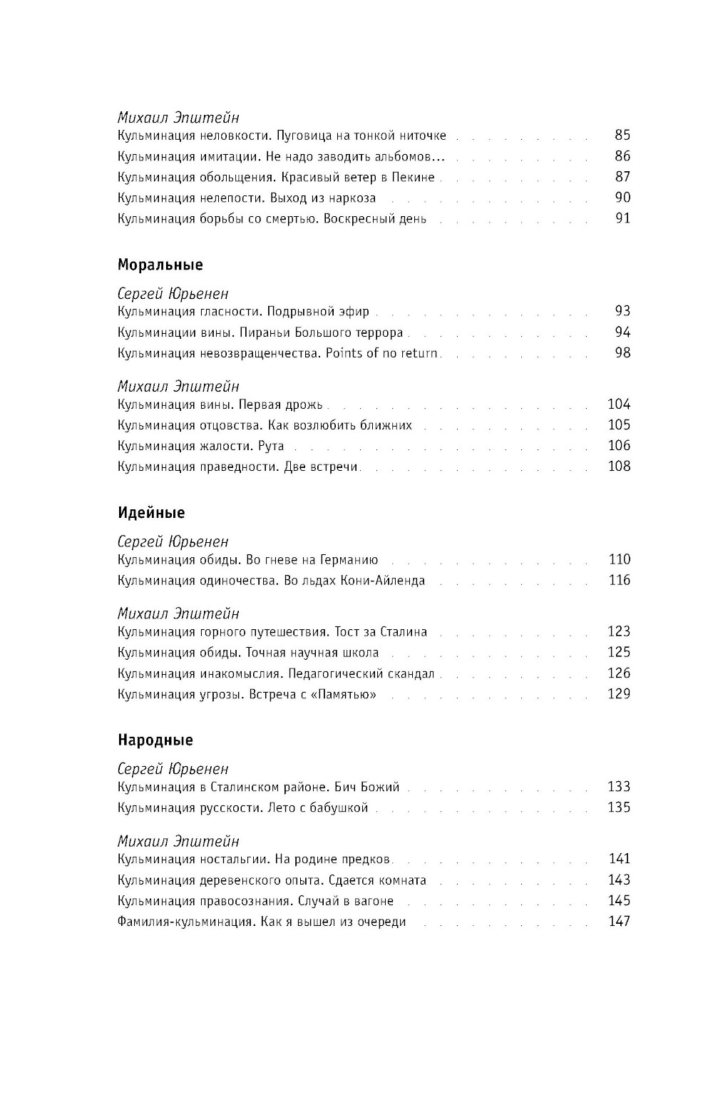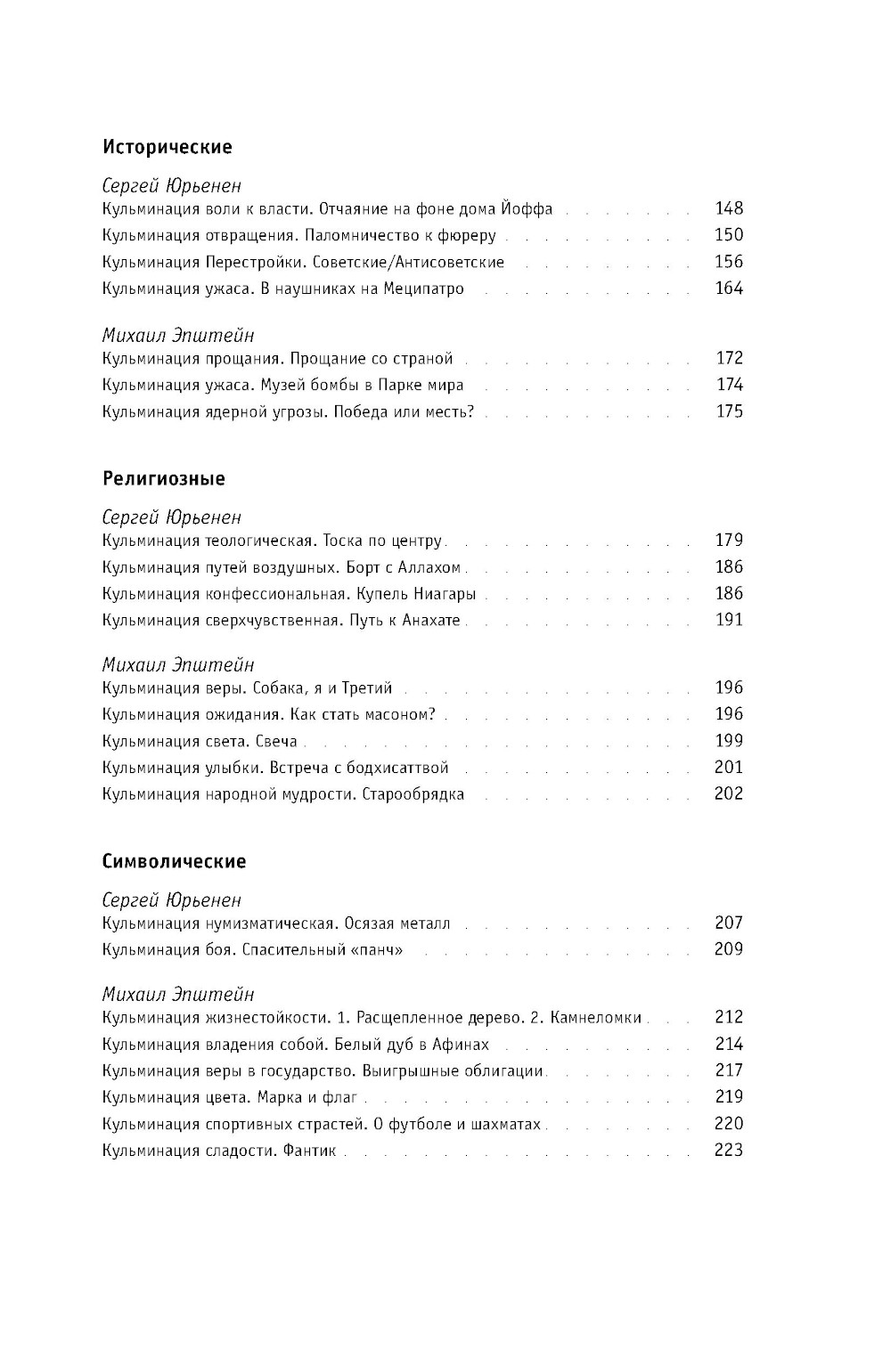 Эта книга - о высших точках опыта, «кульминациях», когда почти мгновенно постигаешь себя, общество, человеческую природу, явленную на гранях, на сломах. Михаил Эпштейн и Сергей Юрьенен - друзья с молодости - размышляют о поворотных моментах своей жизни и делятся опытом сильнейших переживаний. В книгу вошло около девяноста небольших историй на разные темы - от любовно-романтических и семейных до социальных, религиозных и творческих. Кульминации, о которых пишут авторы, возникают на скрещении личных сюжетов с событиями большой истории и общечеловеческими духовными проблемами, которые вдруг получают конкретное воплощение в пережитых ими экстремальных ситуациях. Рассказчики надеются, что эта уникальная по остроте самоанализа книга поможет читателям лучше осознать кульминационные моменты собственной жизни. Михаил Эпштейн - философ, культуролог и литературовед, лингвист, эссеист. Автор книг «Ирония идеала» и «Проективный словарь гуманитарных наук», вышедших в издательстве «НЛО». Сергей Юрьенен - прозаик, переводчик, журналист, издатель, автор публикаций в журнале «Новое литературное обозрение».| Издательство | Новое литературное обозрение |