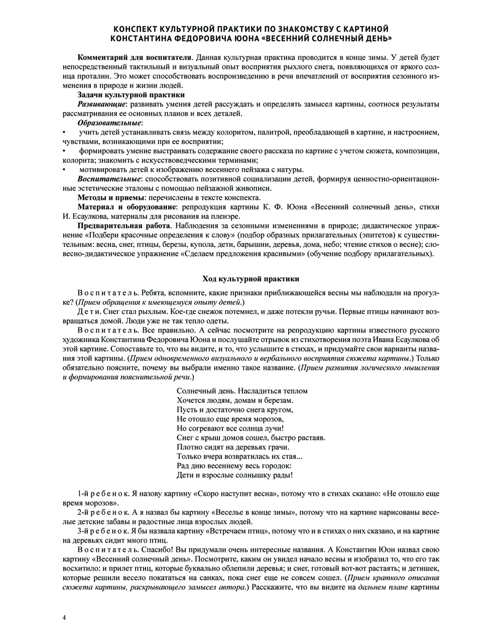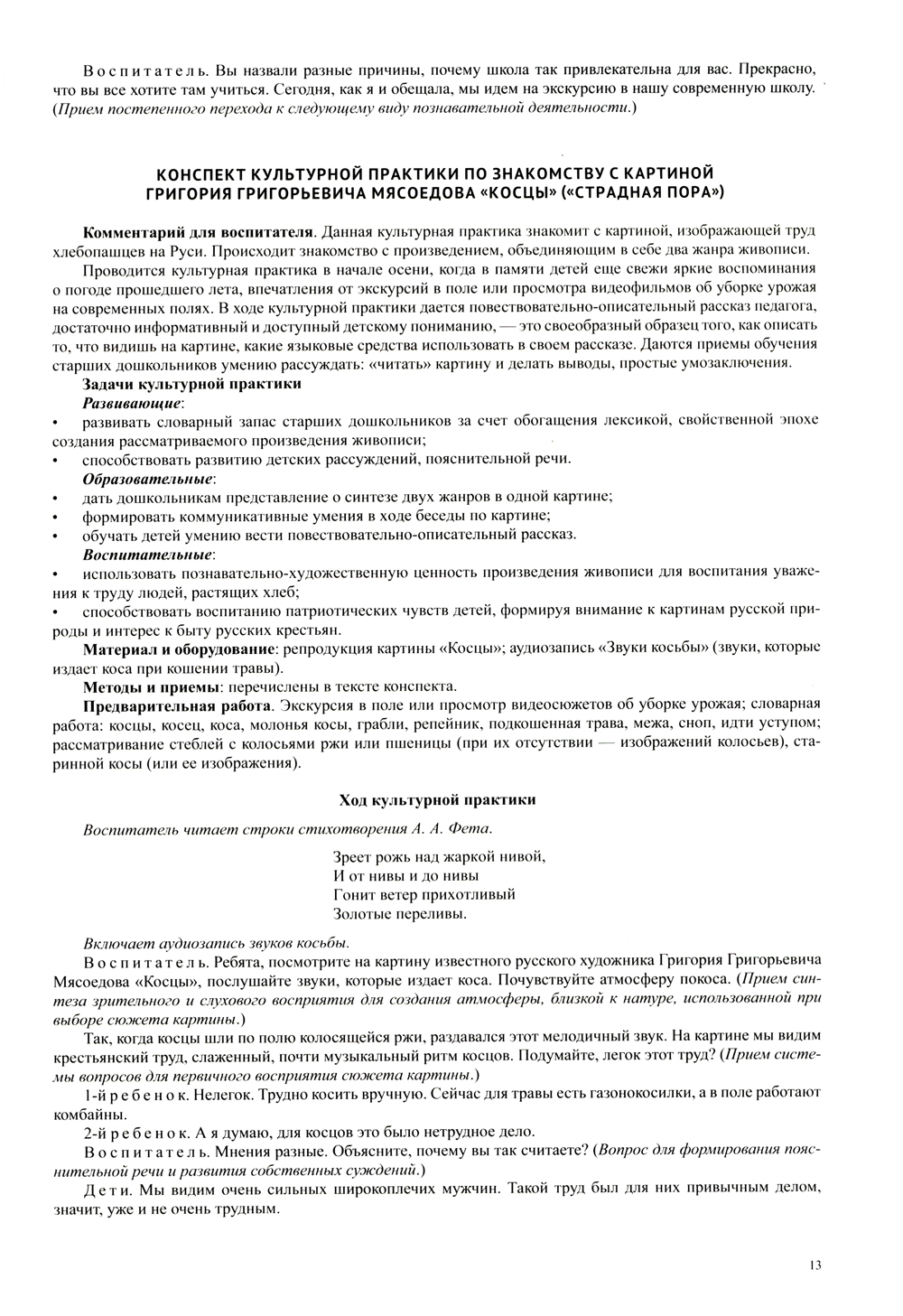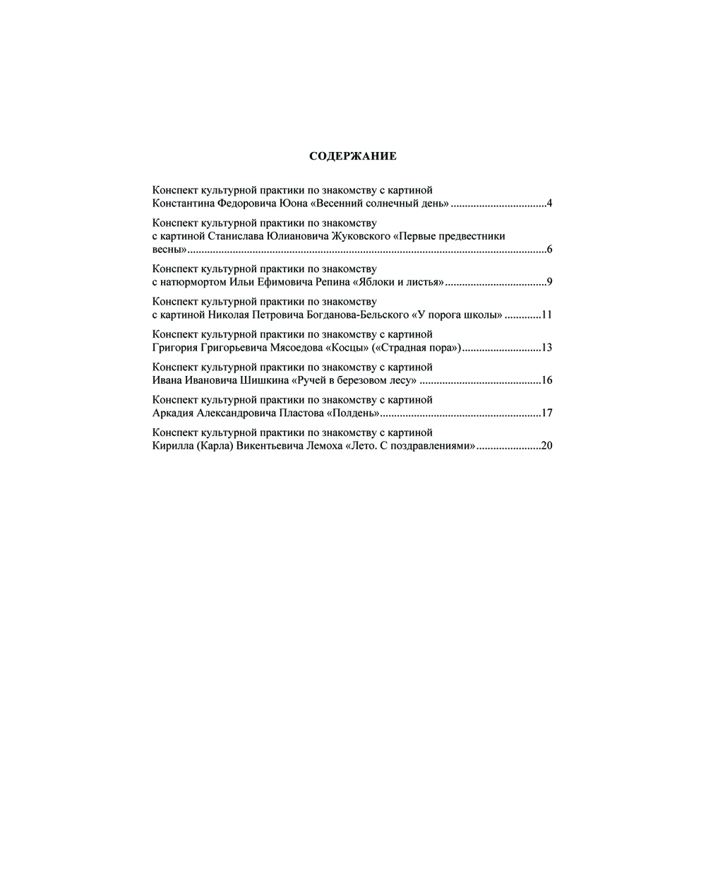 Издание представляет собой сборник конспектов культурных практик, в ходе которых дети знакомятся с произведениями живописцев из коллекции Государственного Русского музея. Такие практики позволяют решать задачи эстетического и культурологического воспитания старших дошкольников, формируют у них речевую культуру, способствуют патриотическому воспитанию детей, пробуждают чувство гордости за русских художников, внесших вклад в сокровищницу всемирного культурного наследия. В книге даны цветные репродукции картин для демонстрации во время занятия. Пособие адресовано воспитателям ДОО, педагогам дополнительного образования, родителям.