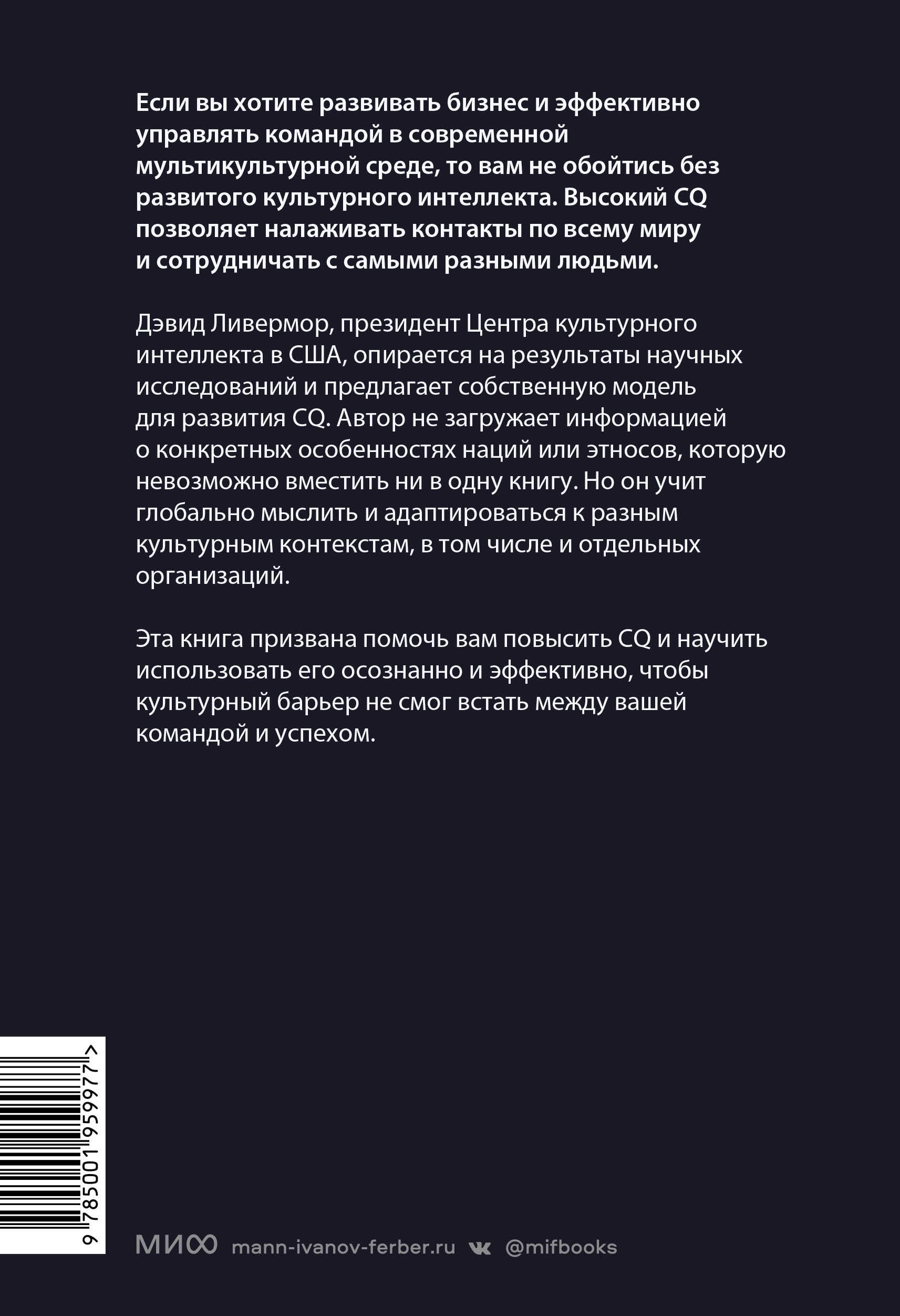 Дэвид Ливермор, президент Центра культурного интеллекта в США, предлагает собственную модель для развития CQ, которая не позволит культурному барьеру встать между вашей командой и успехом. Главный показатель будущего успеха в сегодняшнем мире без границ - не уровень IQ, не профессиональные навыки и даже не опыт, а культурный интеллект (CQ), позволяющий человеку успешно общаться и работать в ситуации культурного многообразия. Если вы хотите развивать бизнес и эффективно управлять командой в современной мультикультурной среде, то вам не обойтись без развитого культурного интеллекта. Высокий CQ позволяет налаживать контакты по всему миру и сотрудничать с самыми разными людьми. Дэвид Ливермор, президент Центра культурного интеллекта в США, опирается на результаты научных исследований и предлагает собственную прикладную модель для развития CQ из четырех ступеней. Автор не загружает информацией о конкретных особенностях наций или этносов, которую невозможно вместить ни в одну книгу. Но учит глобально мыслить и адаптироваться к разным культурным контекстам, в том числе и отдельных организаций. Предисловие - от профессора Nanyang Technological University Сун Анг, которая разработала концепцию культурного интеллекта. Для кого книга: Для руководителей и собственников компаний, которые вышли или планируют выйти на глобальные рынки. Для лидеров, работающих в условиях мультикультурной среды. Для всех, кто стремится развить свой CQ.| Издательство | МАНН, ИВАНОВ И ФЕРБЕР ООО |