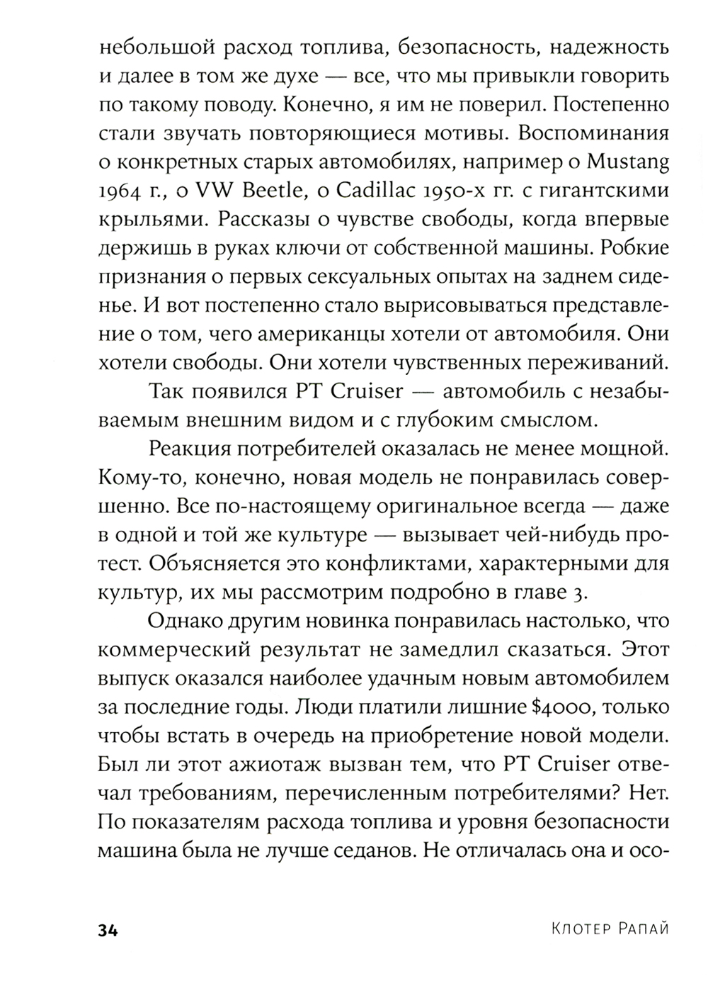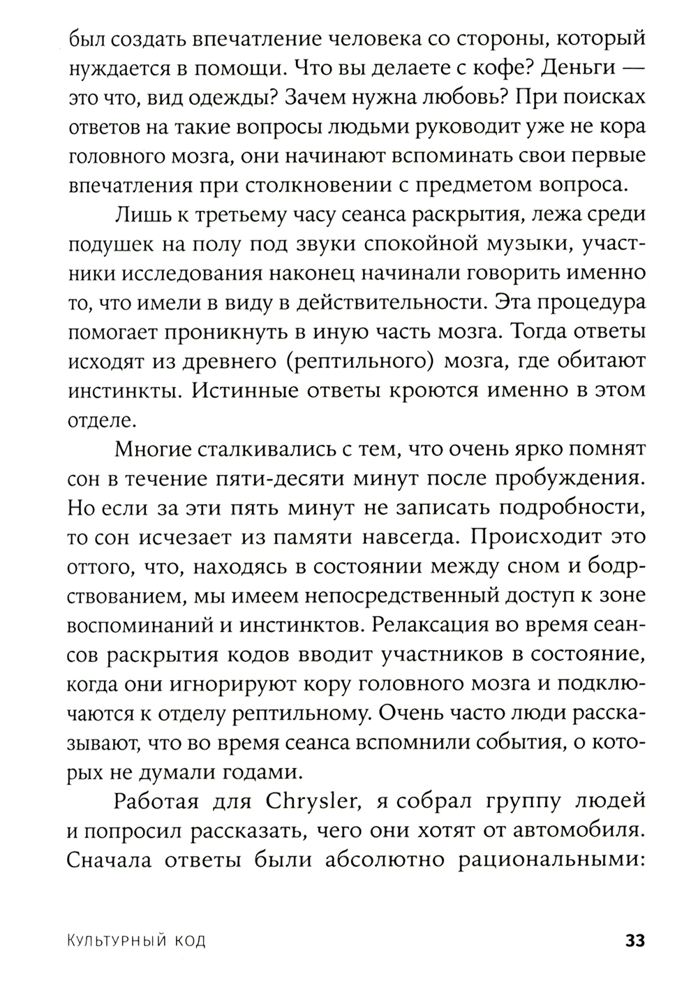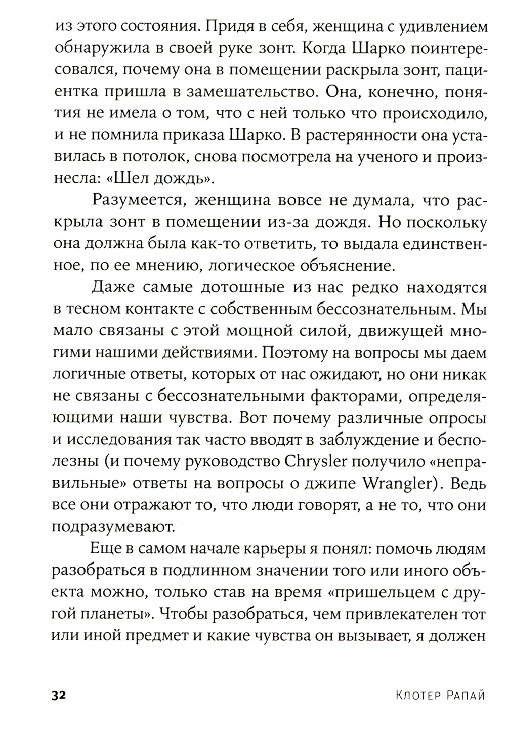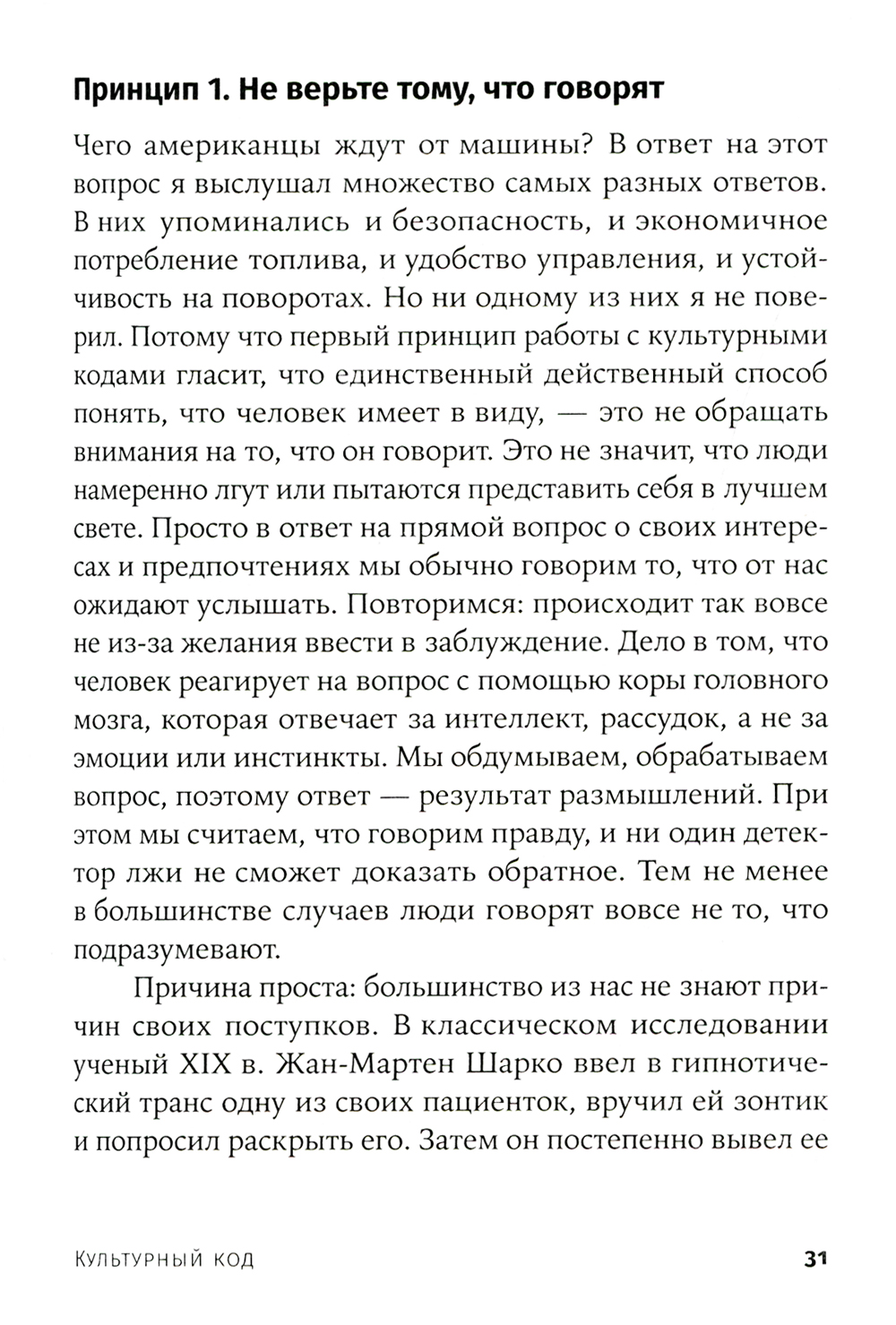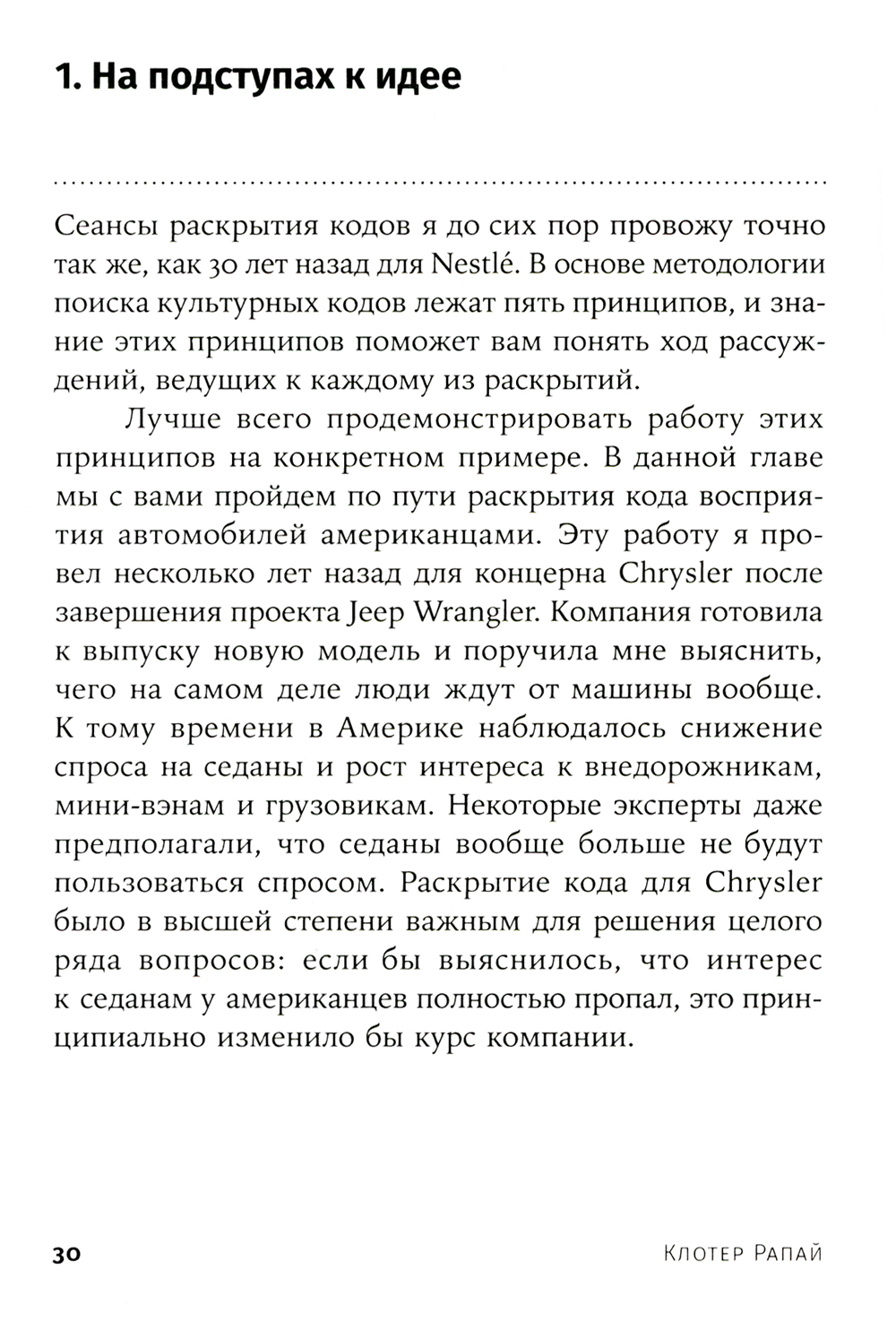 Почему у американского джипа фары должны быть круглыми? Почему во Франции идея изготовления сыра из пастеризованного молока обречена на провал? Почему реклама одного и того же товара в Америке, Германии или Франции должна быть разной? Потому что восприятие любой вещи, явления или понятия - будь то машина, еда, отношения между людьми и даже сама страна - восходит к самым ранним детским впечатлениям и откладывается в глубинной части мозга, которая отвечает за выживание. Тайный смысл сложившихся образов в каждой культуре свой. Это своего рода замок, и открывается он с помощью шифра - культурного кода. Изучение культурных кодов привело психолога Клотера Рапая в мир бизнеса, где его знания принесли огромную практическую пользу. Ведущие компании мира используют идеи Рапая при разработке продукции и планировании рекламных кампаний.| Издательство | Альпина Паблишер |