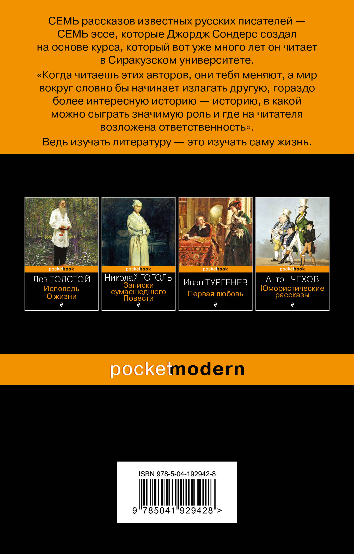 ОТ БУКЕРОВСКОГО ЛАУРЕАТА ДЖОРДЖА СОНДЕРСА, АВТОРА «ЛИНКОЛЬН В БАРДО» И «ДЕСЯТОЕ ДЕКАБРЯ». Секреты литературы легко раскрыть - достаточно лишь перевернуть страницу. ЧЕХОВ. ТУРГЕНЕВ. ТОЛСТОЙ. ГОГОЛЬ. СЕМЬ рассказов известных русских писателей - СЕМЬ эссе, которые Джордж Сондерс создал на основе курса, который вот уже много лет он читает в Сиракьюсском университете. «Когда читаешь этих авторов, они тебя меняют, а мир вокруг словно бы начинает излагать другую, гораздо более интересную, историю - историю, в какой можно сыграть значимую роль и где на читателя возложена ответственность», - пишет во вступлении сам Сондерс. Ведь изучать литературу - это изучать саму жизнь. «Ода каждому писателю и читателю». - O, The Oprah Magazine «Эта книга особенно великолепна тем, что это не очередной "хау-ту" или критическое эссе. Это настоящее погружение в историю, Сондерс нащупал идеальный баланс между писательским препарированием и читательской завороженностью». - The Guardian «Слава великого русского романа огромна; великому русскому рассказу повезло меньше. Американский писатель и преподаватель Джордж Сондерс пробует исправить эту несправедливость - и показывает, как по-новому взглянуть на короткие вещи Чехова, Тургенева, Толстого и Гоголя. В его остроумных и педантичных разборах различаешь жар фаната и холод исследователя - сочетание, которое присуще каждому хорошему читателю и сочинителю художественной прозы. Собственно, будущим авторам эта книга во многом и предназначена: «Купание в пруду под дождем» - одно из лучших пособий по литературному мастерству, книга с той же полки, что и набоковские «Лекции по литературе» или филологические эссе Кутзее». - Игорь Кириенков, книжный критик, автор «Полки»| Издательство | ООО "Издательство "Эксмо" |