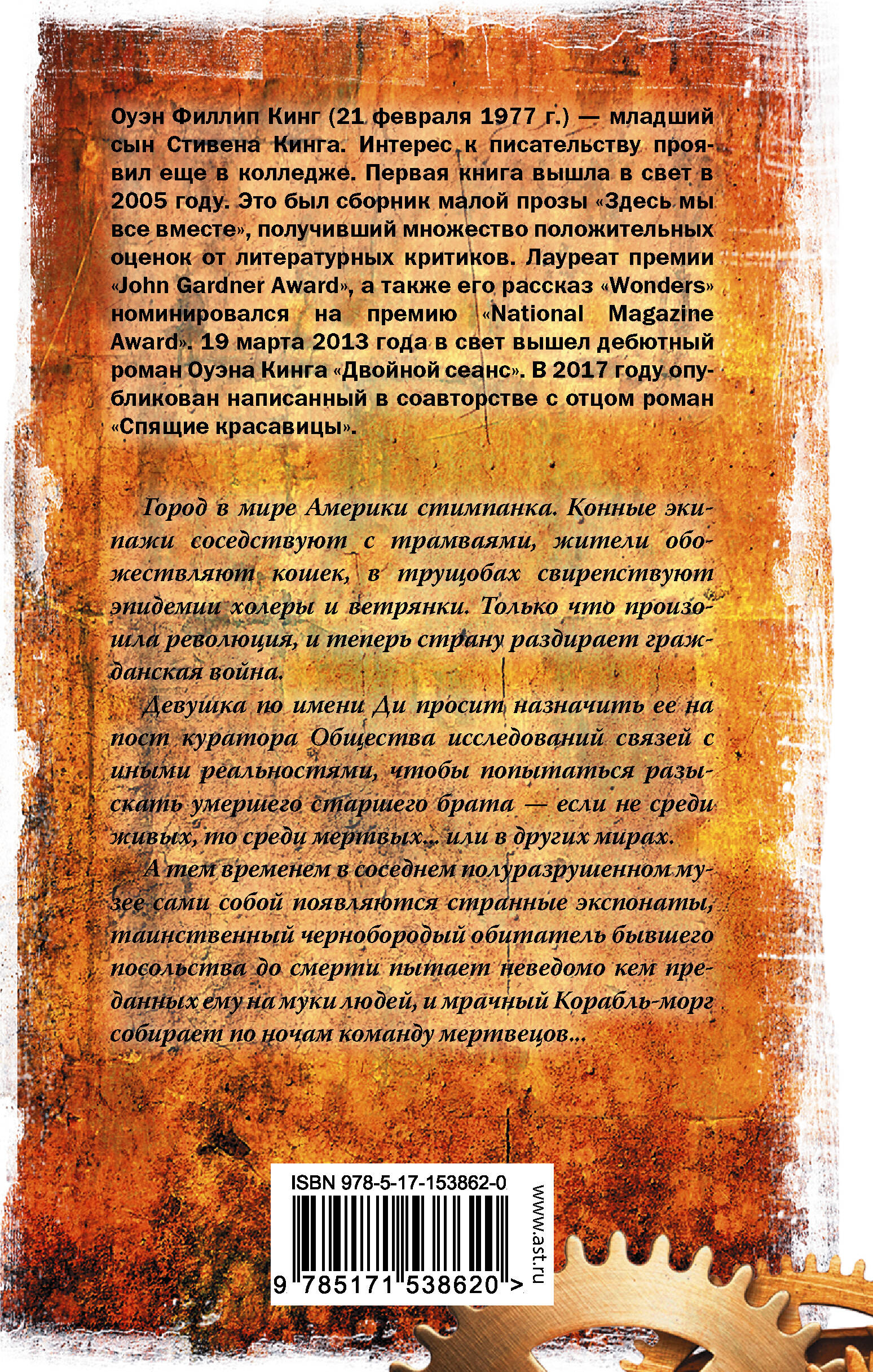 Город в мире Америки стимпанка. Конные экипажи соседствуют с трамваями, жители обожествляют кошек, в трущобах свирепствуют эпидемии холеры и ветрянки. Только что произошла революция, и теперь страну раздирает гражданская война. Девушка по имени Ди просит назначить ее на пост куратора Общества исследований связей с иными реальностями, чтобы попытаться разыскать умершего старшего брата - если не среди живых, то среди мертвых... или в других мирах. А тем временем в соседнем полуразрушенном музее сами собой появляются странные экспонаты, таинственный чернобородый обитатель бывшего посольства до смерти пытает неведомо кем преданных ему на муки людей, и мрачный Корабль-морг собирает по ночам команду мертвецов...| Издательство | ИЗДАТЕЛЬСТВО "АСТ" |