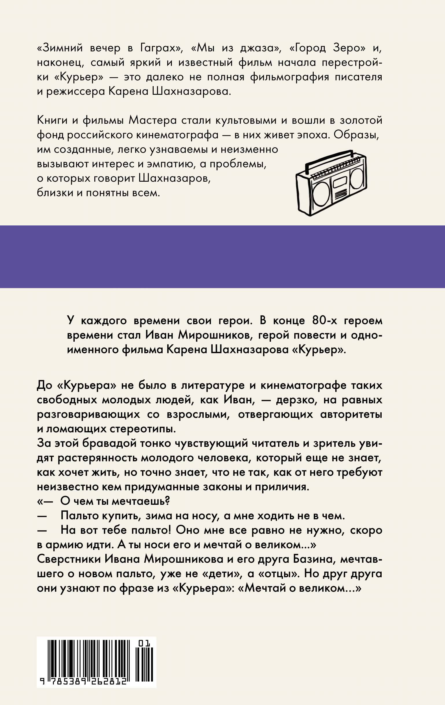 У каждого времени свои герои. В конце 80-х героем времени стал Иван Мирошников, герой повести и одноименного фильма Карена Шахназарова "Курьер". До "Курьера" не было в литературе и кинематографе таких свободных молодых людей, как Иван, - дерзко, на равных разговаривающих со взрослыми, отвергающих авторитеты и ломающих стереотипы. За этой бравадой тонко чувствующий читатель и зритель увидят растерянность молодого человека, который еще не знает, как хочет жить, но точно знает, что не так, как от него требуют неизвестно кем придуманные законы и приличия. "- О чем ты мечтаешь? - Пальто купить, зима на носу, а мне ходить не в чем. - На вот тебе пальто! Оно мне все равно не нужно, скоро в армию идти. А ты носи его и мечтай о великом..." Сверстники Ивана Мирошникова и его друга Базина, мечтавшего о новом пальто, уже не "дети", а "отцы". Но друг друга они узнают по фразам из "Курьера": "Мечтай о великом…"| Издательство | Азбука-Аттикус Издат.группа ООО |