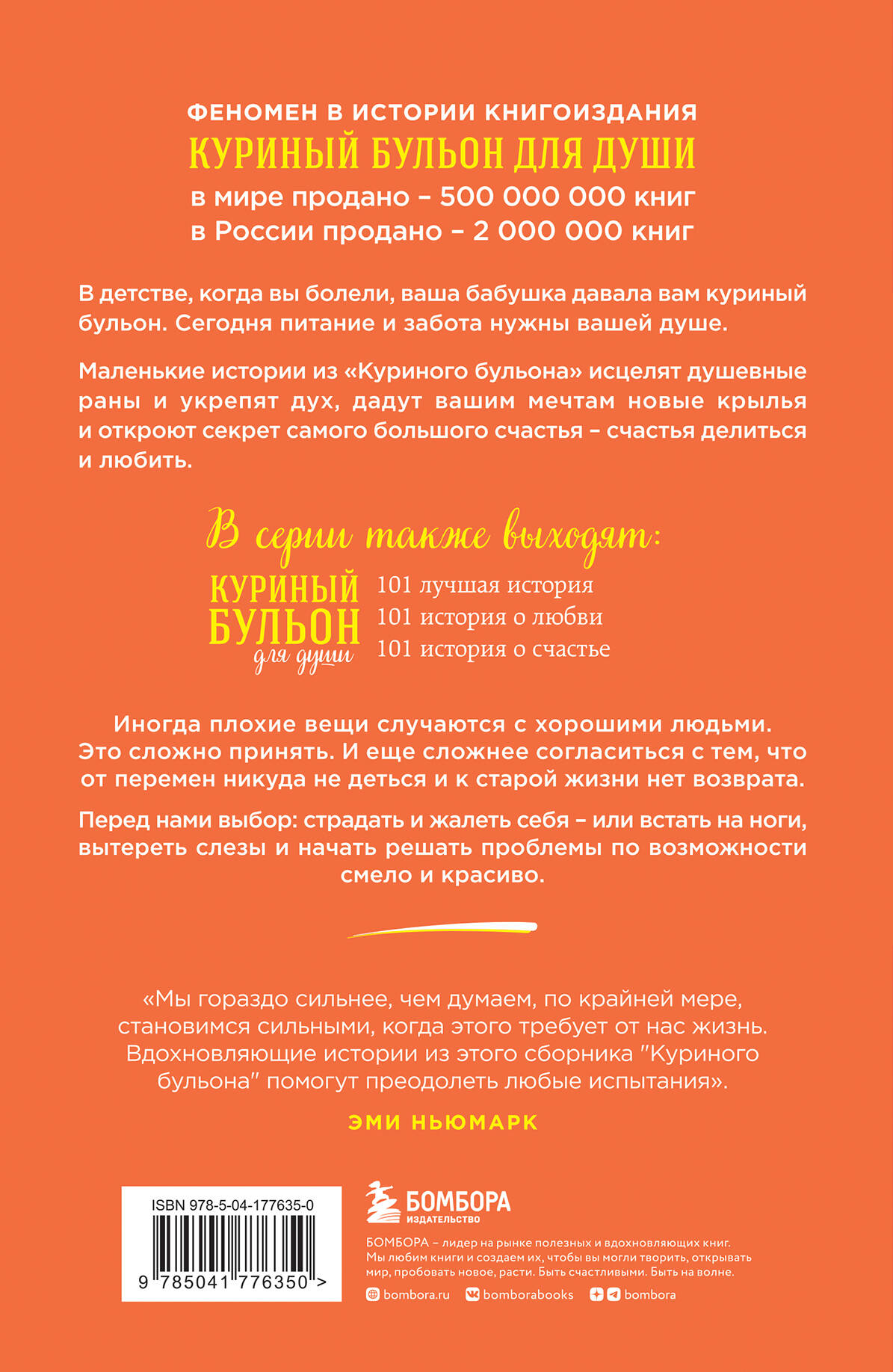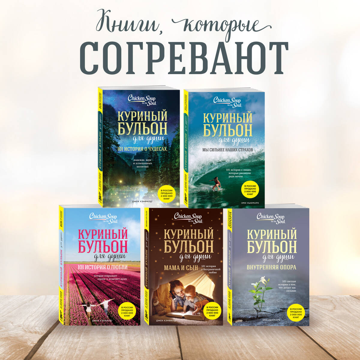 БОЛЕЕ 500 000 000 ПРОДАННЫХ КОПИЙ. ФЕНОМЕН В ИСТОРИИ КНИГОИЗДАНИЯ. САМАЯ ПРОДАВАЕМАЯ В МИРЕ СЕРИЯ. ИСТОРИЯ УСПЕХА 1993 год: Книга, которую никто не хотел издавать / #1 New York Times Bestseller / 20 000 проданных копий. 2003 год: + 180 новых книг в серии / Серия-бестселлер / 80 000 проданных копий. 2013 год: Около 250 книг в серии / Самая продаваемая серия в истории / Более 500 000 000 проданных экземпляров. КАК ВСЕ НАЧИНАЛОСЬ История создания книги «Куриный бульон» вдохновляет не меньше, чем маленькие истории, из которых она состоит. Джек Кэнфилд и Марк Хансен, оба популярные мотивационные спикеры, любили свои выступления «приправить» парочкой вдохновляющих историй. После тренингов многие обращались к ним: «А где можно найти ту историю про девочку-скаута? Я бы купил книгу ее сыну»... «А та история про парня и щенка - ее можно где-то прочитать?»... В течение года Кэнфилд и Хансен записывали истории, которые пережили сами или услышали от знакомых, и когда их набралось 101 - разослали по издательствам. Они получили 144 отказа. Тогда Джек и Марк решили найти покупателей еще до публикации книги, в надежде переубедить издателей. Они рассказывали о ней своим знакомым и слушателям тренингов и всех, кто был заинтересован, просили написать расписку о покупке будущей книги. Когда таких расписок набралось более 20 000, Джек и Марк снова обратились к издателям. Книгу напечатали, и все, кто давал обещание, купили ее. А дальше… продажи встали. Джек и Марк не хотели сдаваться. У них была цель - продать 1,5 миллиона за 1,5 года. Тогда они придумали «Правило пяти»: ежедневно совершать по пять активных шагов по продвижению и продаже книги. С этого момента Кэнфилд и Хансен каждый день рассылали по 5 экземпляров журналистам, голливудским звездам, делали по 5 звонков руководителям компаний с предложением подарить книги сотрудникам. В итоге через 1,5 года было продано 1,3 миллиона экземпляров. Издатель попросил написать продолжение. Со временем книга, которую отвергли 144 издательства, стала одним из самых успешных проектов в истории книгоиздания.