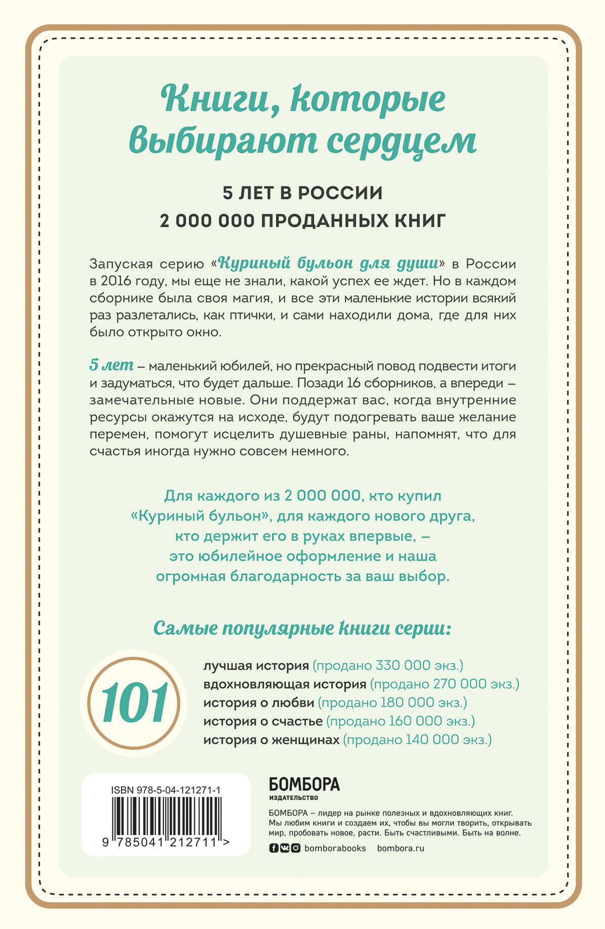 КНИГИ, КОТОРЫЕ ВЫБИРАЮТ СЕРДЦЕМ. 5 лет в России. 2 000 000 проданных экземпляров. Запуская серию «Куриный бульон для души» в России в 2016 году, мы еще не знали, какой успех ее ждет. Но в каждом сборнике была своя магия, и все эти маленькие истории всякий раз разлетались как птички и сами находили дома, где для них было открыто окно. 5 лет - маленький юбилей, но прекрасный повод подвести итоги и задуматься, что будет дальше. Позади 16 сборников, а впереди - замечательные новые. Они поддержат вас, когда внутренние ресурсы окажутся на исходе, будут подогревать ваше желание перемен, помогут исцелить душевные раны, напомнят, что для счастья иногда нужно совсем немного. Для каждого из 2 000 000, кто купил «Куриный бульон», для каждого нового друга, кто держит его в руках впервые, - это юбилейное оформление и наша огромная благодарность за ваш выбор. В ЭТОЙ СЕРИИ ВЫХОДЯТ: «101 лучшая история» (продано 330 000 экз.) «101 вдохновляющая история» (продано 270 000 экз.) «101 история о любви» (продано 180 000 экз.) «101 история о счастье» (продано 160 000 экз.) «101 история о женщинах» (продано 140 000 экз.)| Издательство | ООО "Издательство "Эксмо" |