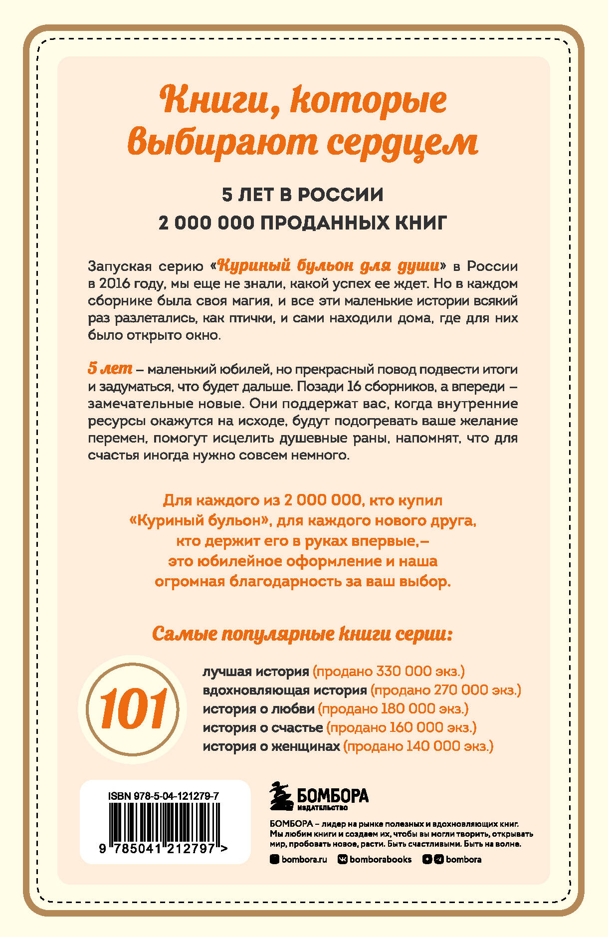 КНИГИ, КОТОРЫЕ ВЫБИРАЮТ СЕРДЦЕМ. 5 лет в России. 2 000 000 проданных экземпляров. Запуская серию «Куриный бульон для души» в России в 2016 году, мы еще не знали, какой успех ее ждет. Но в каждом сборнике была своя магия, и все эти маленькие истории всякий раз разлетались как птички и сами находили дома, где для них было открыто окно. 5 лет - маленький юбилей, но прекрасный повод подвести итоги и задуматься, что будет дальше. Позади 16 сборников, а впереди - замечательные новые. Они поддержат вас, когда внутренние ресурсы окажутся на исходе, будут подогревать ваше желание перемен, помогут исцелить душевные раны, напомнят, что для счастья иногда нужно совсем немного. Для каждого из 2 000 000, кто купил «Куриный бульон», для каждого нового друга, кто держит его в руках впервые, - это юбилейное оформление и наша огромная благодарность за ваш выбор. В ЭТОЙ СЕРИИ ВЫХОДЯТ: «101 лучшая история» (продано 330 000 экз.) «101 вдохновляющая история» (продано 270 000 экз.) «101 история о любви» (продано 180 000 экз.) «101 история о счастье» (продано 160 000 экз.) «101 история о женщинах» (продано 140 000 экз.)| Издательство | ООО "Издательство "Эксмо" |