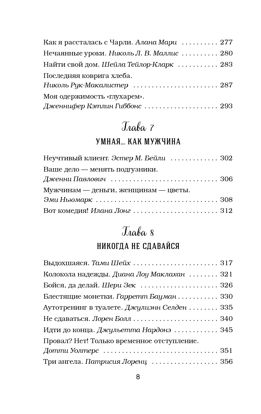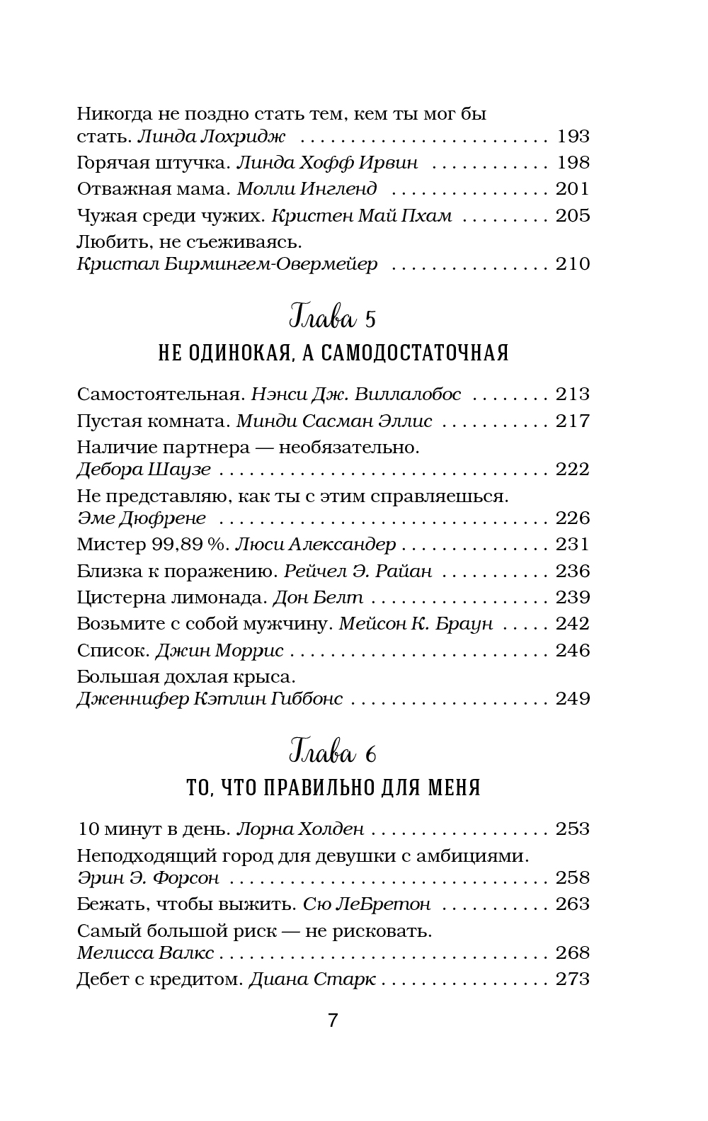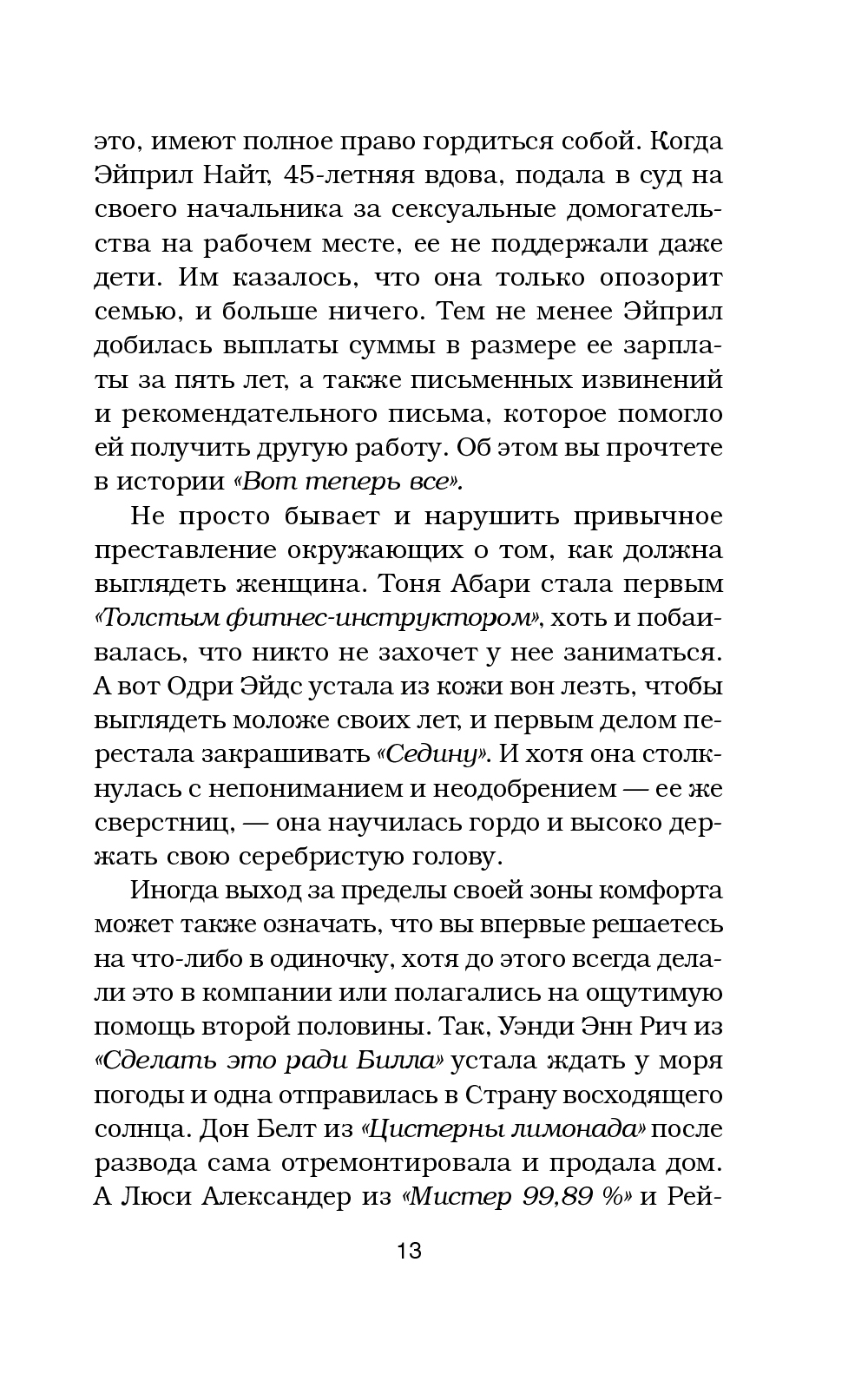 Героини этого сборника танцуют, не дожидаясь, пока закончится дождь. Сталкиваясь с предательством мужчины, учатся забивать гвозди и по-прежнему считают себя желанными. Борются с болезнью с помощью кошек и творчества. А с неуверенностью в себе - с помощью красной помады. Отказываются от головокружительной карьеры ради детей. И все равно потом становятся успешными. Удивительные, ранимые, смелые, они рассказывают, как годами жили внутри очерченных кем-то границ. И как трудно, непривычно и прекрасно оказалось снаружи.| Издательство | Эксмо |