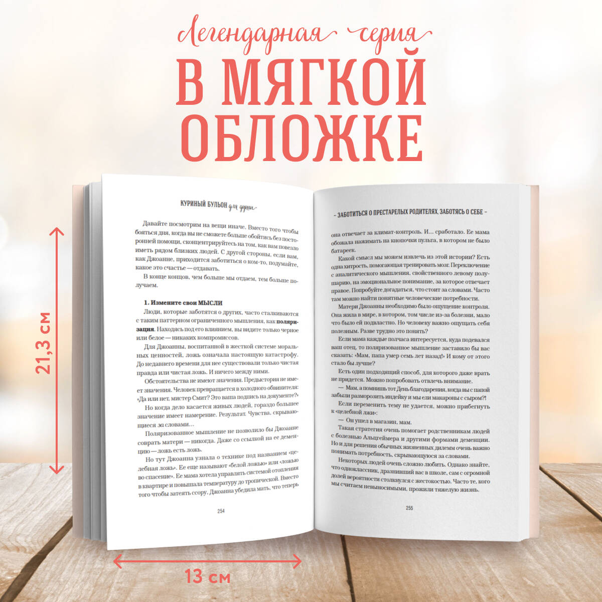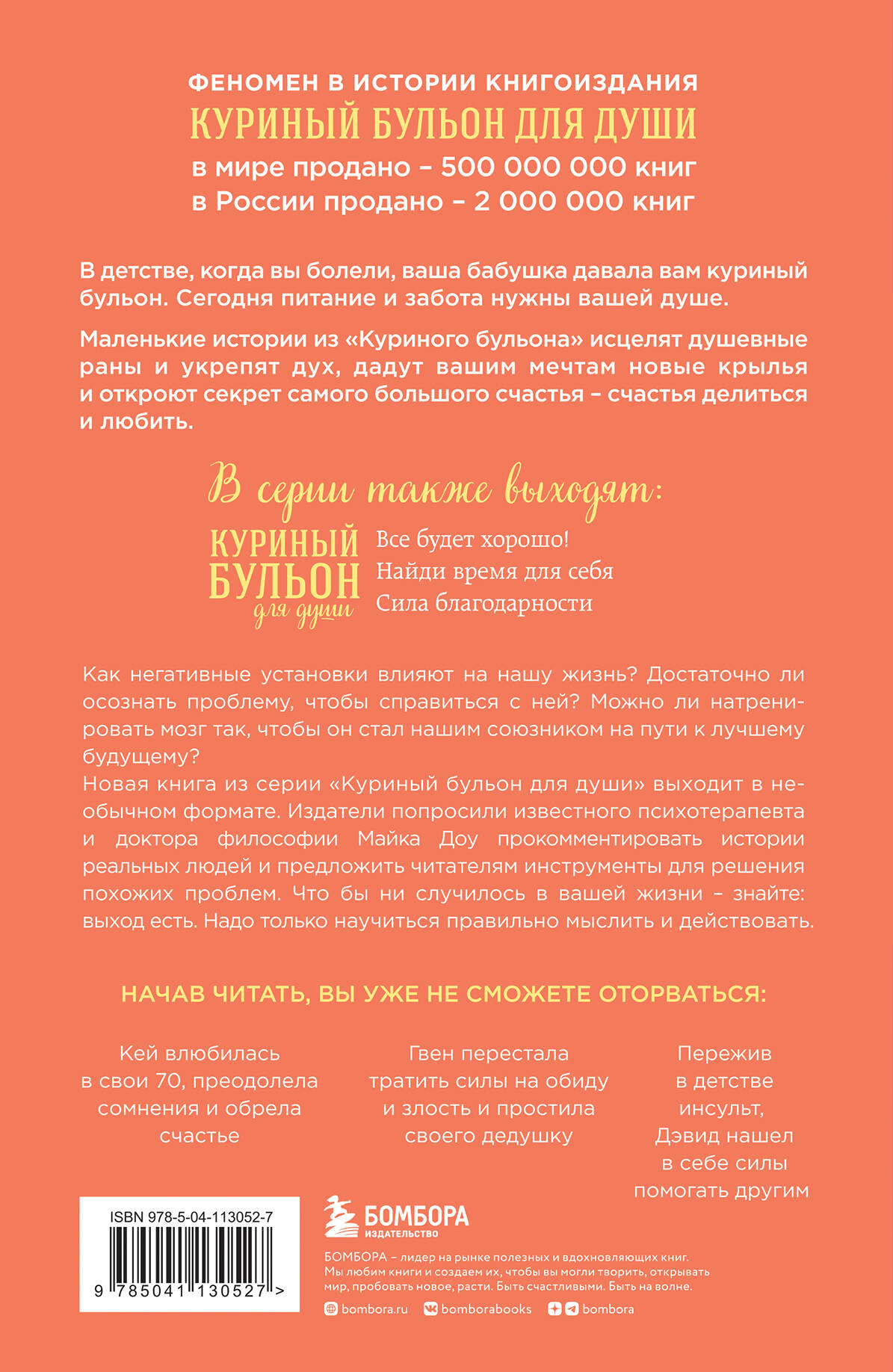 Более 500 000 000 проданных копий. Феномен в истории книгоиздания. Самая продаваемая в мире серия. Как негативные установки влияют на нашу жизнь? Достаточно ли осознать проблему, чтобы справиться с ней? Можно ли натренировать мозг так, чтобы он стал нашим союзником на пути к лучшему будущему? Новая книга серии выходит в необычном формате. Издатели попросили известного психотерапевта и доктора философии Майка Доу прокомментировать истории реальных людей и предложить читателям инструменты для решения похожих проблем. Что бы ни случилось в вашей жизни - увольнение, развод, тяжелая болезнь или смерть близкого - знайте: выход есть! Надо только научиться правильно мыслить и действовать. Шеннон и Майк жили на разных континентах и познакомились во время гонок на инвалидных колясках. Через некоторое время у них родилась дочь, хотя все говорили, что это невозможно. Гвен перестала тратить силы на обиду и злость и простила своего дедушку. Оставшись одна после развода и отъезда детей, Бет приютила бездомного кота, и тот изменил ее жизнь. Когда Кей исполнилось семьдесят, она снова влюбилась. Преодолев сомнения и страхи, Кей обрела счастье.| Издательство | ООО "Издательство "Эксмо" |