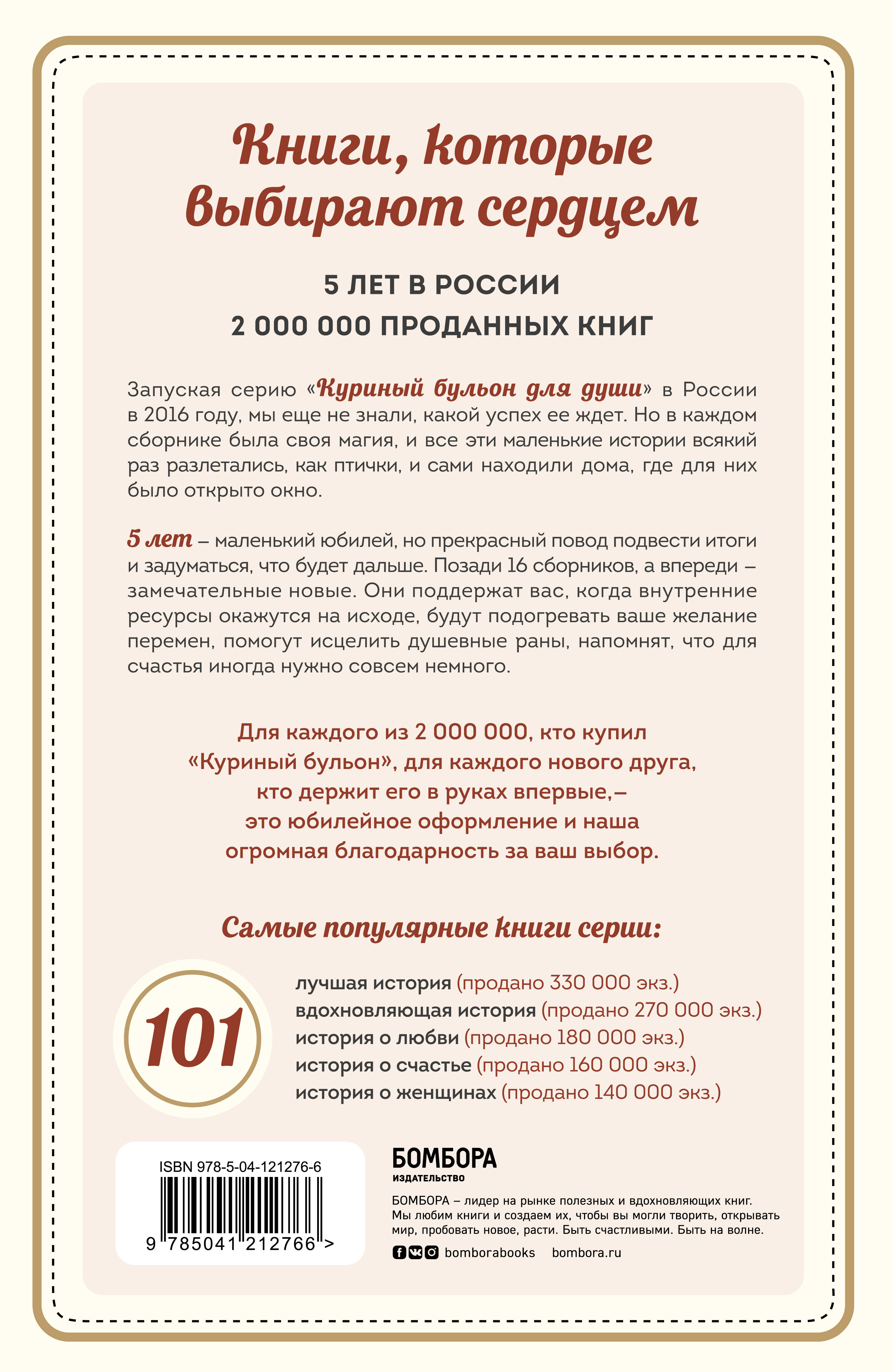 КНИГИ, КОТОРЫЕ ВЫБИРАЮТ СЕРДЦЕМ. 5 лет в России. 2 000 000 проданных экземпляров. Запуская серию «Куриный бульон для души» в России в 2016 году, мы еще не знали, какой успех ее ждет. Но в каждом сборнике была своя магия, и все эти маленькие истории всякий раз разлетались как птички и сами находили дома, где для них было открыто окно. 5 лет - маленький юбилей, но прекрасный повод подвести итоги и задуматься, что будет дальше. Позади 16 сборников, а впереди - замечательные новые. Они поддержат вас, когда внутренние ресурсы окажутся на исходе, будут подогревать ваше желание перемен, помогут исцелить душевные раны, напомнят, что для счастья иногда нужно совсем немного. Для каждого из 2 000 000, кто купил «Куриный бульон», для каждого нового друга, кто держит его в руках впервые, - это юбилейное оформление и наша огромная благодарность за ваш выбор. В ЭТОЙ СЕРИИ ВЫХОДЯТ: «101 лучшая история» (продано 330 000 экз.) «101 вдохновляющая история» (продано 270 000 экз.) «101 история о любви» (продано 180 000 экз.) «101 история о счастье» (продано 160 000 экз.) «101 история о женщинах» (продано 140 000 экз.)| Издательство | ООО "Издательство "Эксмо" |