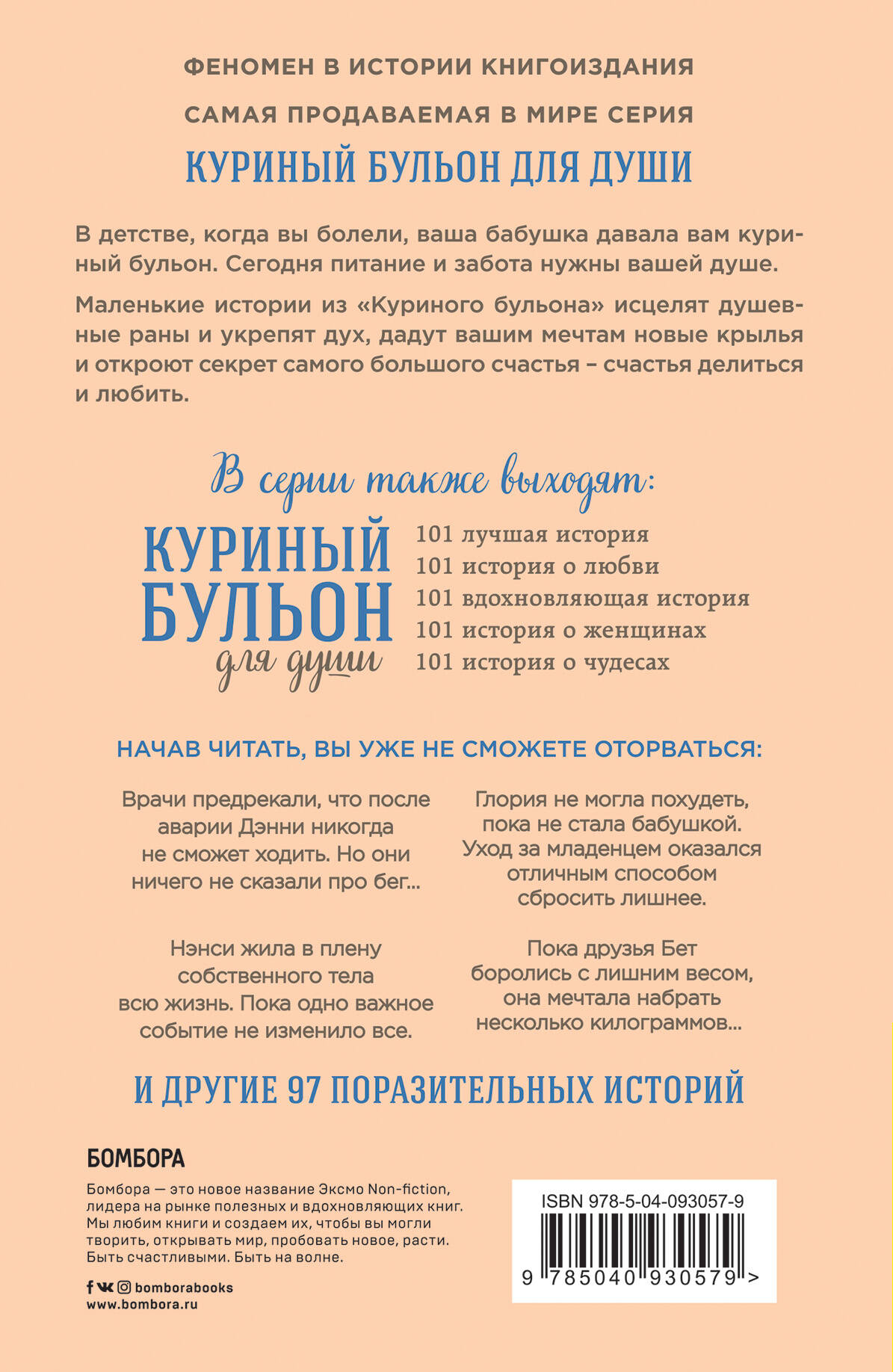 БОЛЕЕ 500 000 000 ПРОДАННЫХ КОПИЙ. ФЕНОМЕН В ИСТОРИИ КНИГОИЗДАНИЯ. САМАЯ ПРОДАВАЕМАЯ В МИРЕ СЕРИЯ. История успеха: 1993 год: Книга, которую никто не хотел издавать / #1 New York Times Bestseller / 20 000 проданных копий. 2003 год: + 180 новых книг в серии / Серия-бестселлер / 80 000 проданных копий. 2013 год: Около 250 книг в серии / Самая продаваемая серия в истории / Более 500 000 000 проданных экземпляров. Как всё начиналось История создания книги «Куриный бульон» вдохновляет не меньше, чем маленькие истории, из которых она состоит. Джек Кэнфилд и Марк Хансен, оба популярные мотивационные спикеры, любили свои выступления «приправить» парочкой вдохновляющих историй. После тренингов многие обращались к ним: «А где можно найти ту историю про девочку-скаута? Я бы купил книгу ее сыну», «А та история про парня и щенка - ее можно где-то прочитать?». В течение года Кэнфилд и Хансен записывали истории, которые пережили сами или услышали от знакомых, и когда их набралось 101 - разослали по издательствам. Они получили 144 отказа. Тогда Джек и Марк решили найти покупателей еще до публикации книги, в надежде переубедить издателей. Они рассказывали о ней своим знакомым и слушателям тренингов, и всех, кто был заинтересован, просили написать расписку о покупке будущей книги. Когда таких расписок набралось более 20 000, Джек и Марк снова обратились к издателям. Книгу напечатали, и все, кто давал обещание, купили ее. А дальше… продажи встали. Джек и Марк не хотели сдаваться. У них была цель - продать 1,5 миллиона за 1,5 года. Тогда они придумали «Правило пяти»: ежедневно совершать по пять активных шагов по продвижению и продаже книги. С этого момента Кэнфилд и Хансен каждый день рассылали по 5 экземпляров журналистам, голливудским звездам, делали по 5 звонков руководителям компаний с предложением подарить книги сотрудникам. В итоге через 1,5 года было продано 1,3 миллиона экземпляров. Издатель попросил написать продолжение. Со временем книга, которую отвергли 144 издательства, стала одним из самых успешных проектов в истории книгоиздания.| Издательство | ООО "Издательство "Эксмо" |