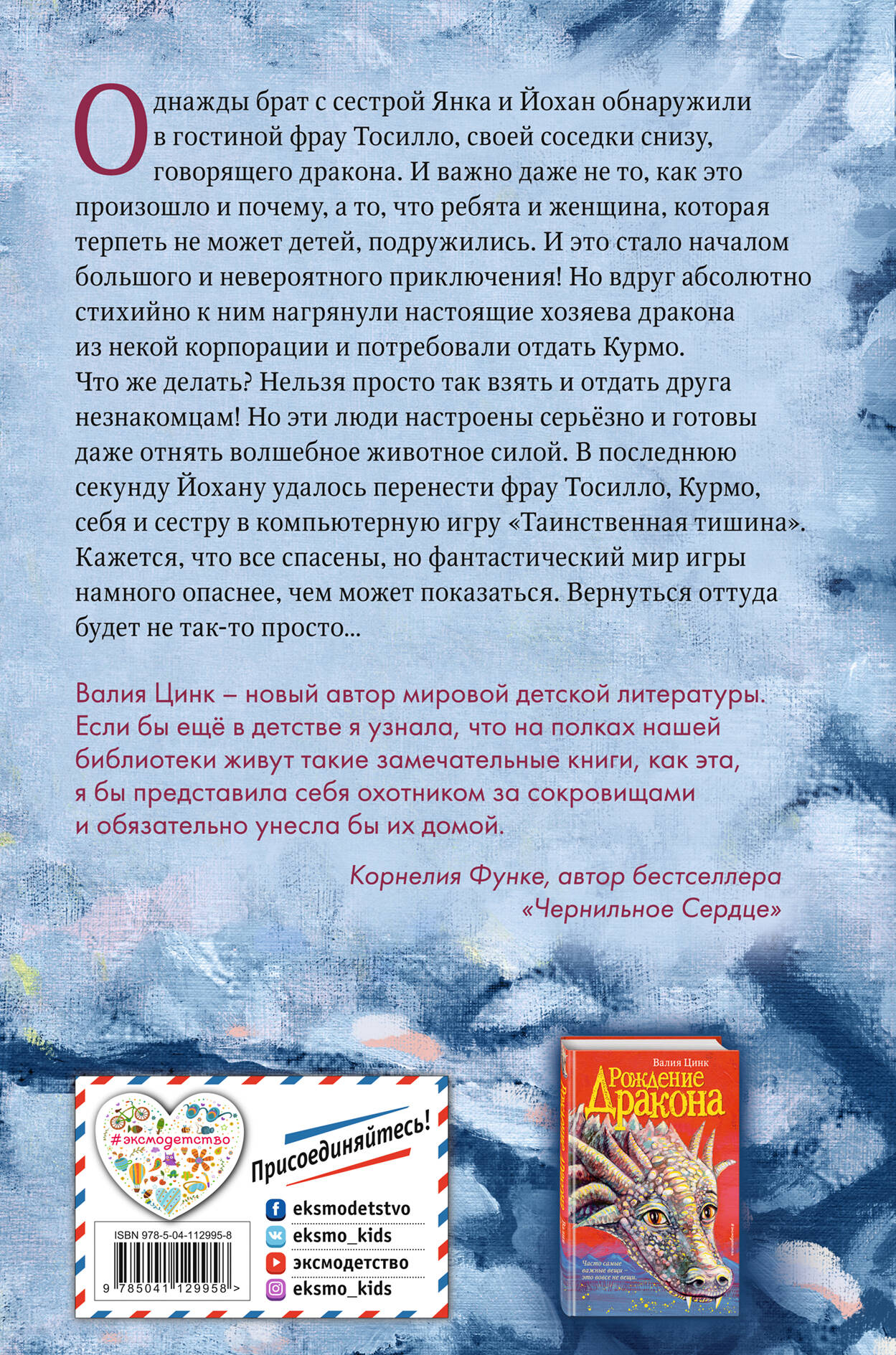 Однажды брат с сестрой, Янка и Йохан, обнаружили в гостиной фрау Тосилло, своей соседки снизу, говорящего дракона. И важно даже не то, как это произошло и почему, а то, что ребята и женщина, которая терпеть не может детей, подружились. И это стало началом большого и невероятного приключения! В книге есть всё, что нравится современным подросткам: привлекательные герои, много юмора, хороший сюжет, дракон и компьютерные игры. Очень красивое оформление! Чешуйки дракончика и название на обложке оформлены золотой фольгой. Не пропустите продолжение истории - «Курмо загадывает желание»!| Издательство | ООО "Издательство "Эксмо" |