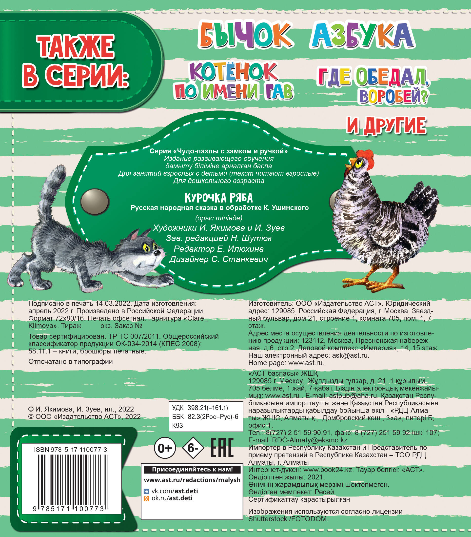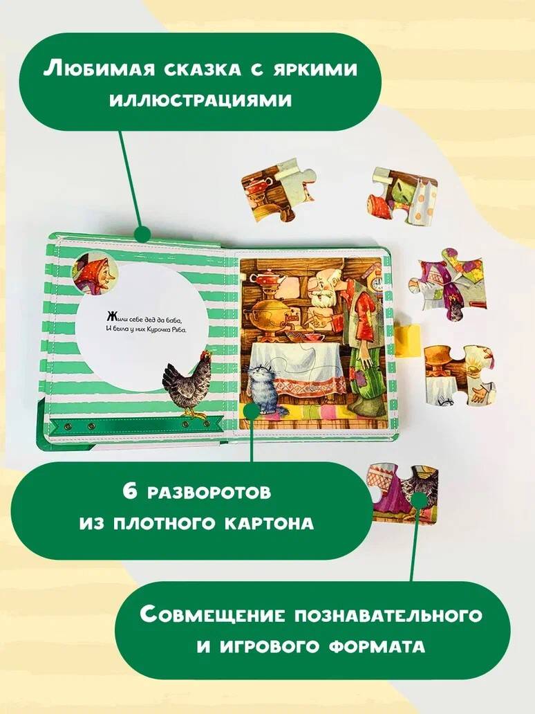 Русская народная сказка в новом формате книжек с пазлами с пластиковым замочком и ручкой! Любимые и известные нескольким поколениям родителей стихи и сказки, яркие иллюстрации популярных детских художников, развивающие пазлы и удобный замочек с ручкой, которые позволят взять книжку с собой в дорогу - все это соединилось в одном удобном формате. - на каждом развороте - пазл из 6 частей с удобной выемкой для маленьких пальчиков; - плотная обложка с пластиковыми замочком и ручкой - удобно играть и брать с собой в дорогу; - любимые классические стихи и сказки отлично подходят для обучения малыша чтению; - яркие иллюстрации известных художников. Ребенку будет не только интересно прочитать или послушать сказку, но и самому сложить картинки из пазлов!