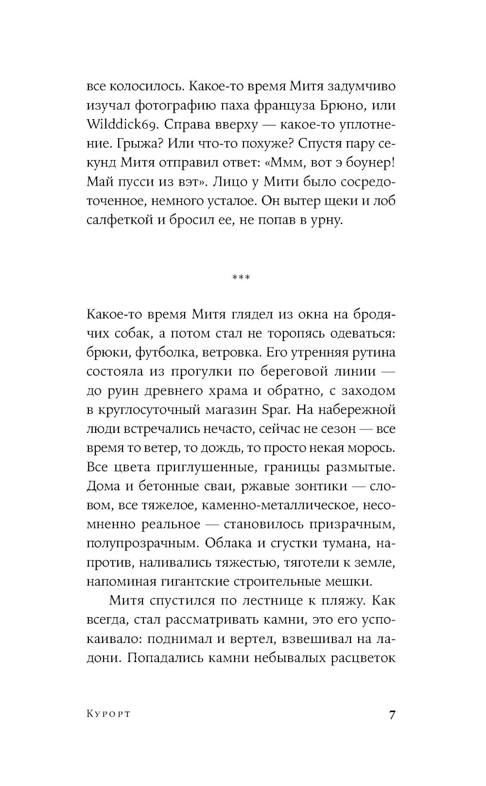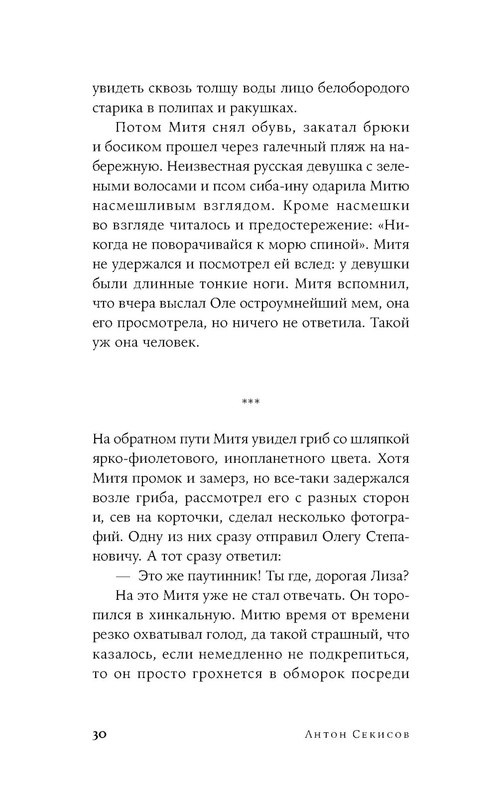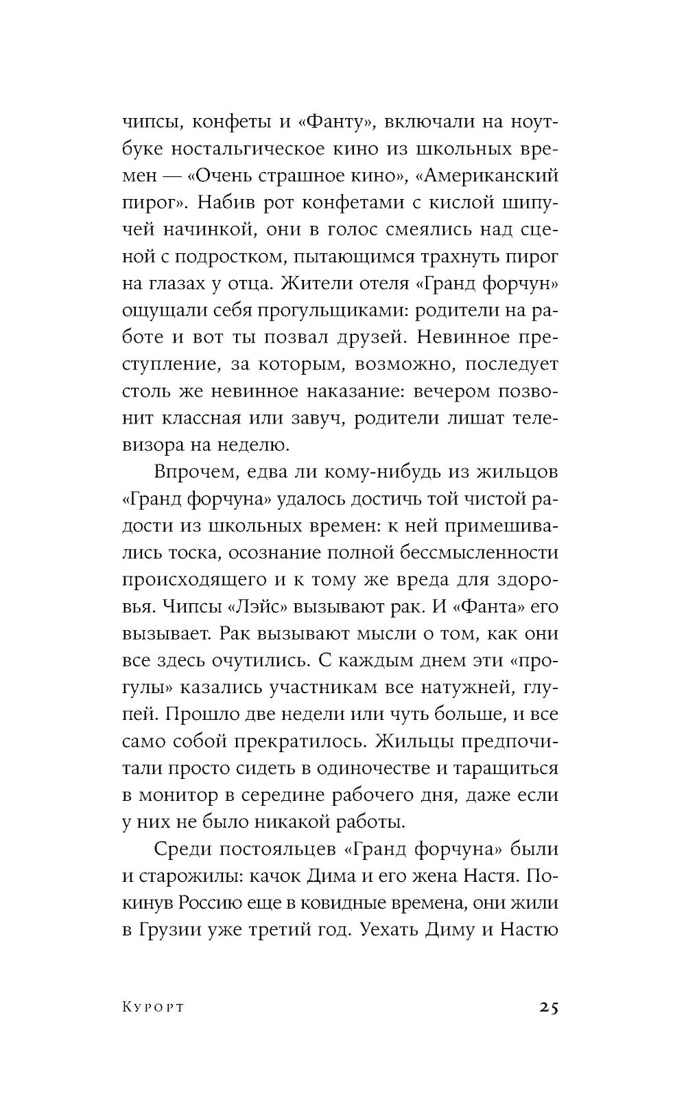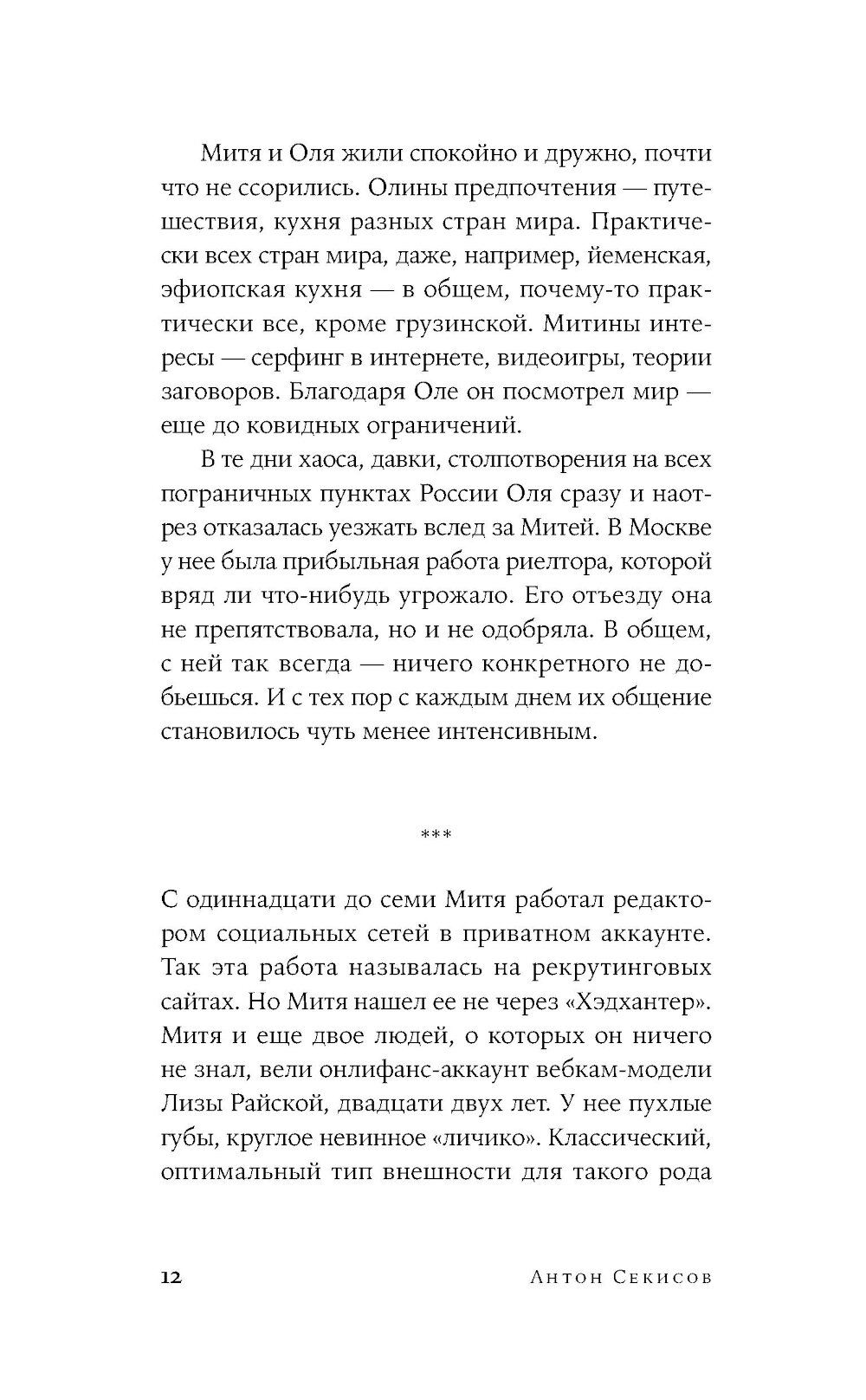 Мите тридцать семь, он бывший корреспондент столичной газеты, но уже два месяца живет в Грузии и работает редактором соцсетей в приватном аккаунте. Так официально называлась эта вакансия, но на самом деле Митя просто переписывается с незнакомыми пользователями от лица двадцатидвухлетней вебкам-модели Лизы. Вместе с другими релокантами он завис на побережье странного зыбкого безвременья, где можно пить «Фанту», смотреть диснеевские мультфильмы и бесконечно перебирать в памяти фрагменты прошлого. Происходит как будто много разных странных и не очень событий, но на самом деле Митя просто замер на берегу в ожидании сам еще не понял чего и наблюдает, как покачивается на волнах его нынешняя, обманчиво легкая, как пена, жизнь.| Издательство | Альпина нон-фикшн |