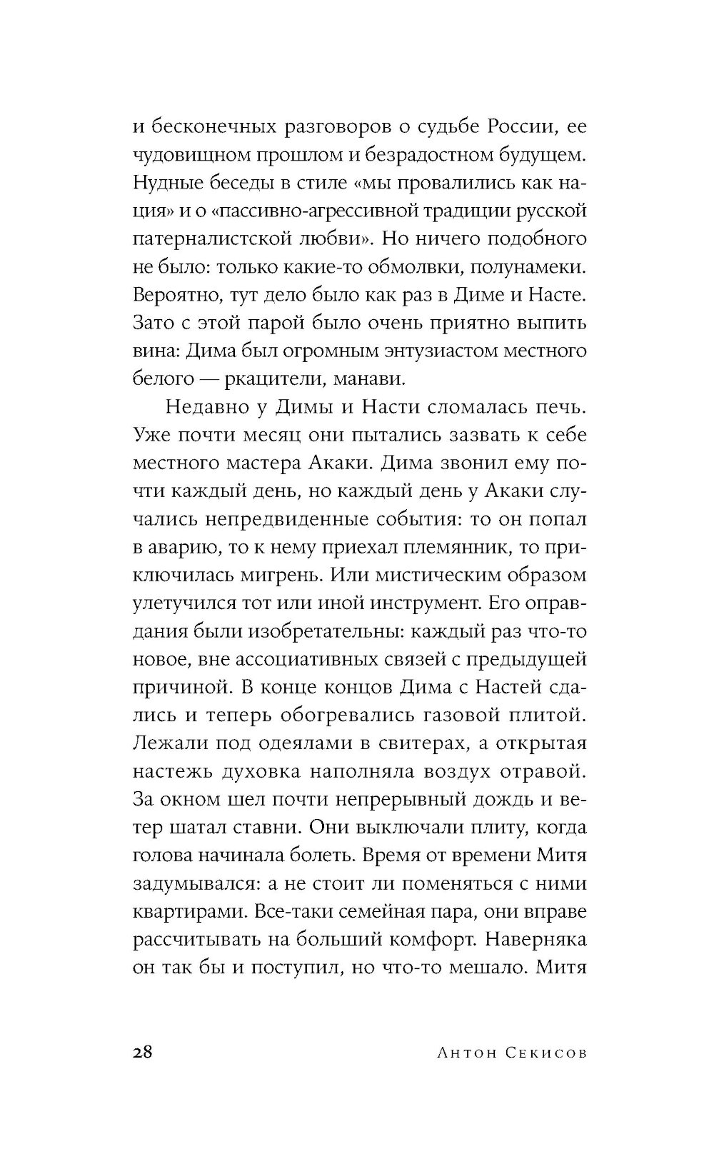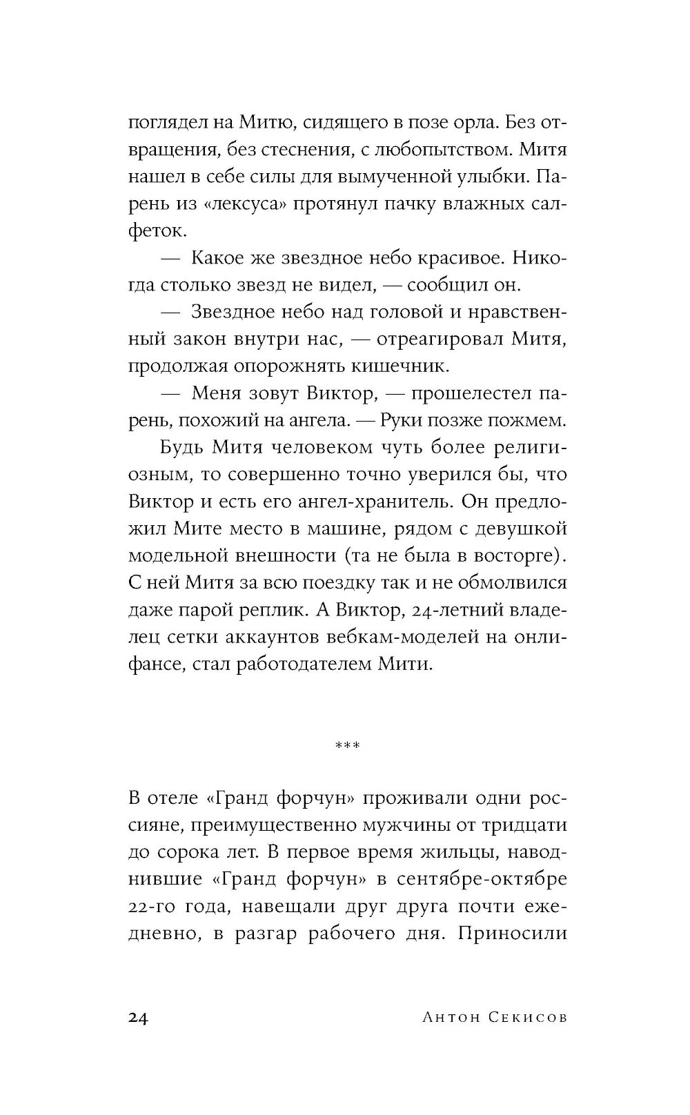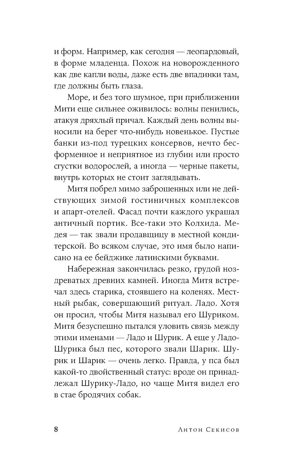 Мите тридцать семь, он бывший корреспондент столичной газеты, но уже два месяца живет в Грузии и работает редактором соцсетей в приватном аккаунте. Так официально называлась эта вакансия, но на самом деле Митя просто переписывается с незнакомыми пользователями от лица двадцатидвухлетней вебкам-модели Лизы. Вместе с другими релокантами он завис на побережье странного зыбкого безвременья, где можно пить «Фанту», смотреть диснеевские мультфильмы и бесконечно перебирать в памяти фрагменты прошлого. Происходит как будто много разных странных и не очень событий, но на самом деле Митя просто замер на берегу в ожидании сам еще не понял чего и наблюдает, как покачивается на волнах его нынешняя, обманчиво легкая, как пена, жизнь.| Издательство | Альпина нон-фикшн |