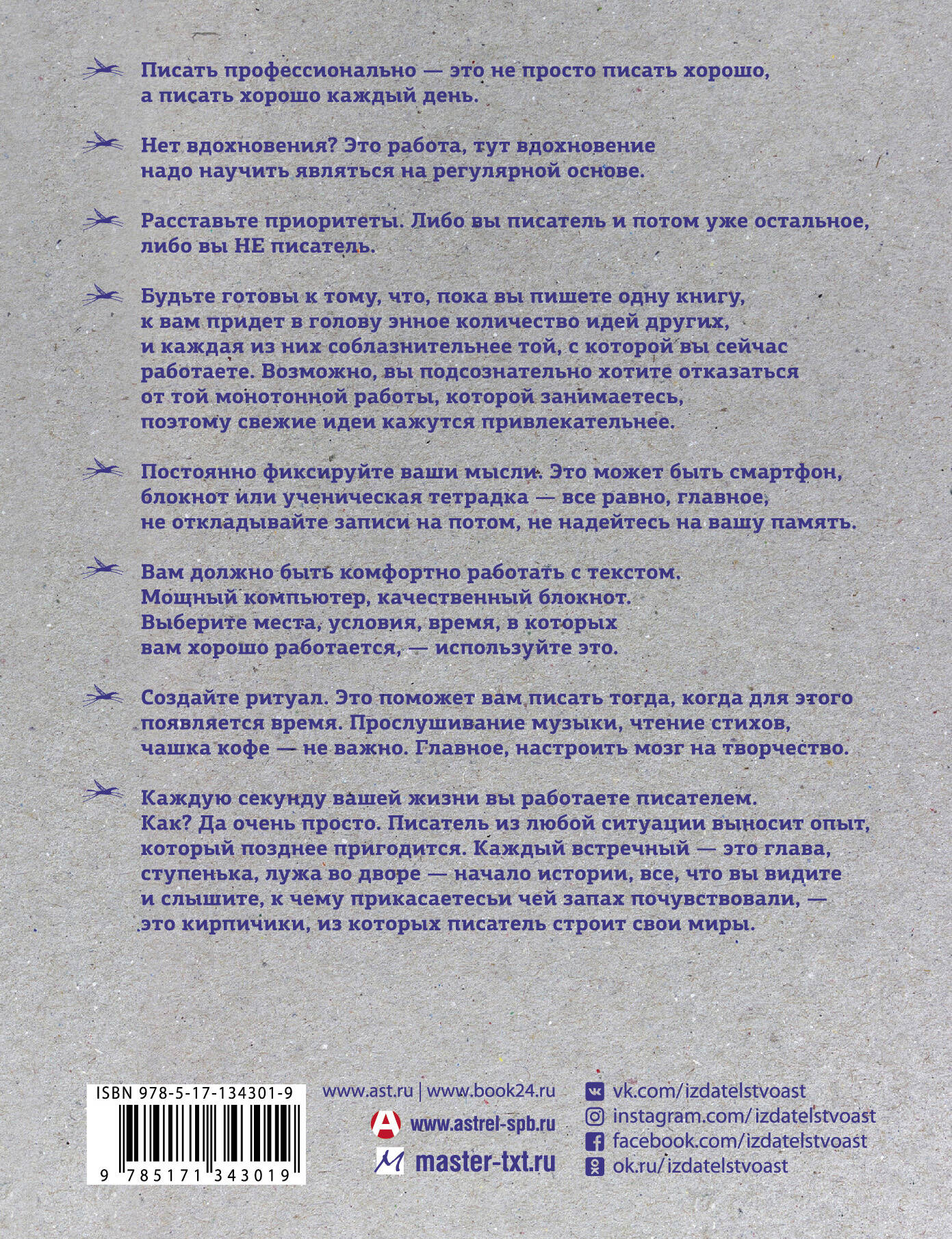 "Читателям этого знать не надо, но авторы должны отдавать себе отчет, что мастер слова - это нечто большее, чем человек, который написал некую историю. Некую историю раз в жизни может написать любой нормальный человек. Скорее всего, это будет автобиографический текст, и, скорее всего, он будет неплох: ведь если выжать в одну книгу все самое забавное, что было в жизни, должно получиться как минимум нескучно. Писатель - это другое. В этой книге мы будем говорить именно о тех вещах, которые делают писателя не таким, как все". Герой, идея, мир, история вашей книги, структура текста, композиция, жанры - об этом, а также о том, как работать с издательством, что нужно знать об авторском праве, рекламе и продвижении книг. Александр Прокопович - главный редактор "Астрель-СПб" (издательская группа "АСТ"), писатель и сценарист, организатор и преподаватель литературных курсов "Мастер текста".| Издательство | Издательство "АСТ" |