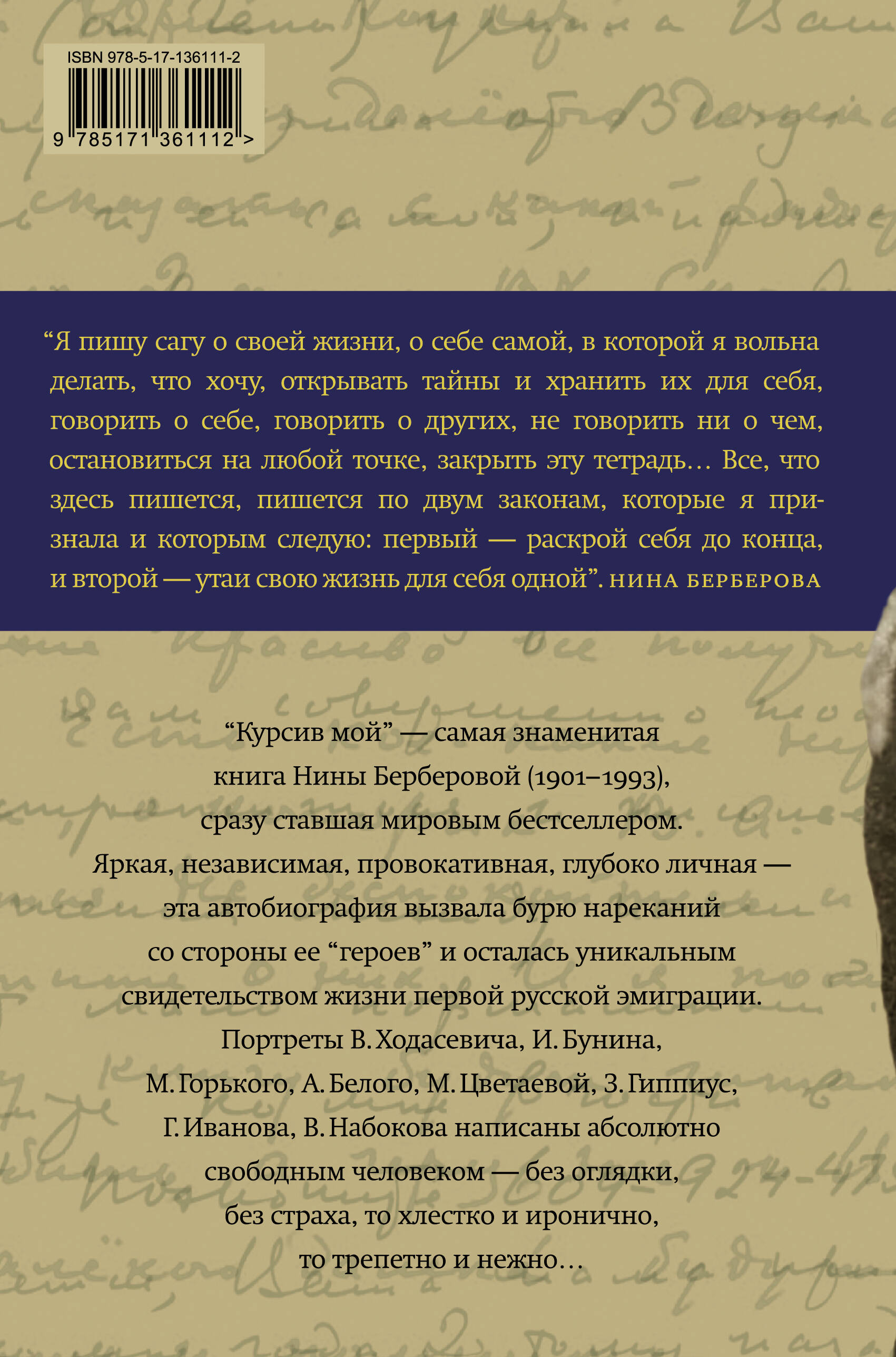 "Курсив мой" - самая знаменитая книга Нины Берберовой (1901-1993), сразу ставшая мировым бестселлером. Яркая, независимая, провокативная, глубоко личная - эта автобиография вызвала бурю нареканий со стороны ее "героев" и осталась уникальным свидетельством жизни первой русской эмиграции. Портреты В. Ходасевича, И. Бунина, М. Горького, А. Белого, М. Цветаевой, З. Гиппиус, Г. Иванова, В. Набокова написаны абсолютно свободным человеком - без оглядки, без страха, то хлестко и иронично, то трепетно и нежно… "Я пишу сагу о своей жизни, о себе самой, в которой я вольна делать, что хочу, открывать тайны и хранить их для себя, говорить о себе, говорить о других, не говорить ни о чем, остановиться на любой точке, закрыть эту тетрадь… Все, что здесь пишется, пишется по двум законам, которые я признала и которым следую: первый - раскрой себя до конца, и второй - утаи свою жизнь для себя одной".| Издательство | ИЗДАТЕЛЬСТВО "АСТ" |