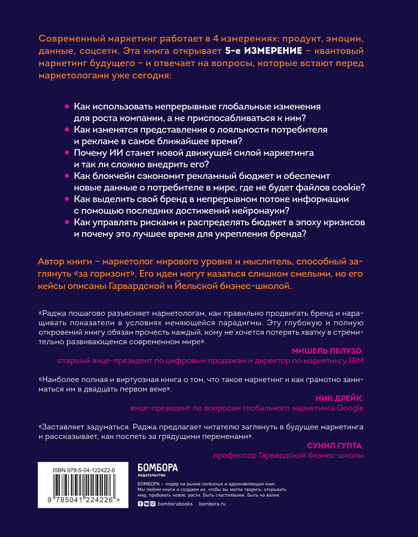 Современный маркетинг работает в 4-х измерениях: продукт, эмоции, данные, соцсети. Эта книга открывает 5-е измерение - квантовый маркетинг будущего - и отвечает на вопросы, которые встают перед маркетологами уже сегодня: • Как использовать непрерывные глобальные изменения для роста компании, а не приспосабливаться к ним. • Как изменятся представления о лояльности потребителя и рекламе в самое ближайшее время. • Почему ИИ станет новой движущей силой маркетинга и так ли сложно внедрить его. • Как блокчейн сэкономит рекламный бюджет и обеспечит новые данные о потребителе в мире, где не будет файлов cookie. • Как выделить свой бренд в непрерывном потоке информации с помощью последних достижений нейронауки. • Как управлять рисками и распределять бюджет в эпоху кризисов и почему это лучшее время для укрепления бренда. Автор книги - маркетолог мирового уровня и мыслитель, способный заглянуть «за горизонт». Его идеи могут казаться слишком смелыми, но его кейсы описаны Гарвардской и Йельской школами бизнеса. «Раджа пошагово разъясняет маркетологам, как правильно продвигать бренд и наращивать показатели в условиях меняющейся парадигмы. Эту глубокую и полную откровений книгу обязан прочесть каждый, кому не хочется потерять хватку в стремительно развивающемся современном мире». - Мишель Пелузо, старший вице-президент по цифровым продажам и директор по маркетингу IBM «Наиболее полная и виртуозная книга о том, что такое маркетинг и как грамотно заниматься им в двадцать первом веке». - Ник Дрейк, вице-президент по вопросам глобального маркетинга Google «Заставляет задуматься. Раджа предлагает читателю заглянуть в будущее маркетинга и рассказывает, как поспеть за грядущими переменами». - Сунил Гупта, профессор Гарвардской школы бизнеса| Издательство | ООО "Издательство "Эксмо" |