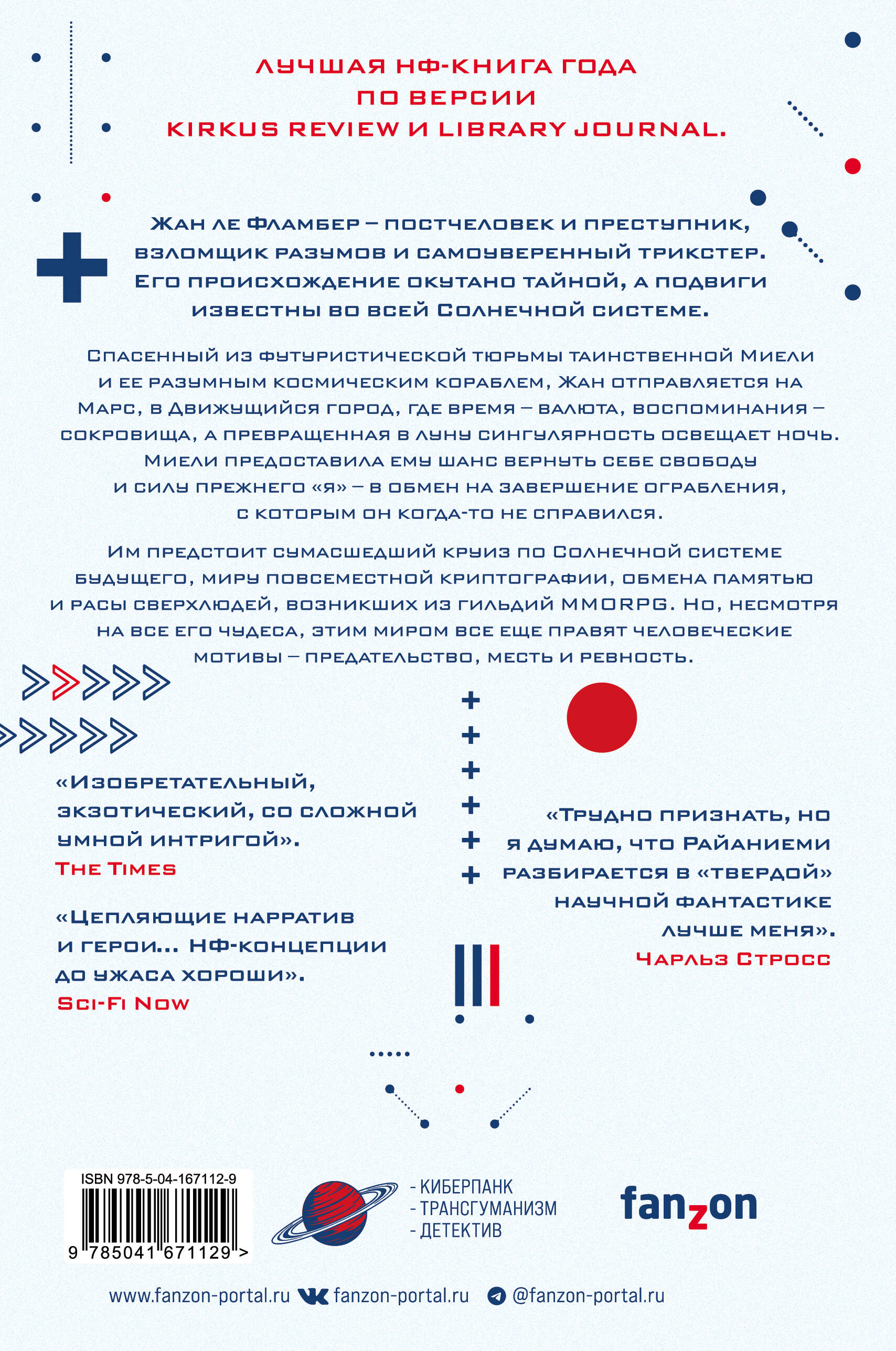 Премии «Еврокон», «Блуждающая звезда», «Галактика». Номинации на премию «Локус», Мемориальную премию Джона Кэмпбелла. Лучшая НФ-книга года по версии Kirkus Review и Library Journal. Жан ле Фламбер - постчеловек и преступник, взломщик разумов, самоуверенный трикстер. Его происхождение окутано тайной, но его подвиги известны во всей Солнечной системе. Спасенный из футуристической тюрьмы таинственной Миели и ее разумным космическим кораблем, Жан отправляется на Марс, в Движущийся город, где время - валюта, воспоминания - сокровища, а превращенная в луну сингулярность освещает ночь. Миели предоставила ему шанс вернуть себе свободу и силу прежнего «я» - в обмен на завершение ограбления, с которым он когда-то не справился. Им предстоит сумасшедшая увеселительная поездка по Солнечной системе будущего, миру повсеместной криптографии, обмена воспоминаний и расы сверхлюдей, возникших из гильдий MMORPG. Несмотря на все свои чудеса, этот мир все еще управляется человеческими мотивами - предательством, местью и ревностью. «Изобретательный, экзотический, со сложной умной интригой». - The Times «Трудно признать, но я думаю, что Райаниеми разбирается в "твердой" научной фантастике лучше меня». - Чарльз Стросс «Многие авторы убили бы за то, чтобы написать прозу хотя бы наполовину такую хорошую, как эта...» - The Financial Times «Цепляющие нарратив и герои… НФ-концепции до ужаса хороши». - Sci-Fi Now «Фонтан идей». - Interzone «"Квантовый вор", как и другие лучшие космические оперы этого века, это дом чудес, где положения мгновенно становятся традицией, а аргументы бросаются в глаза». - Джон Клют «Блестящий роман!» - Strange Horizins| Издательство | Эксмо |