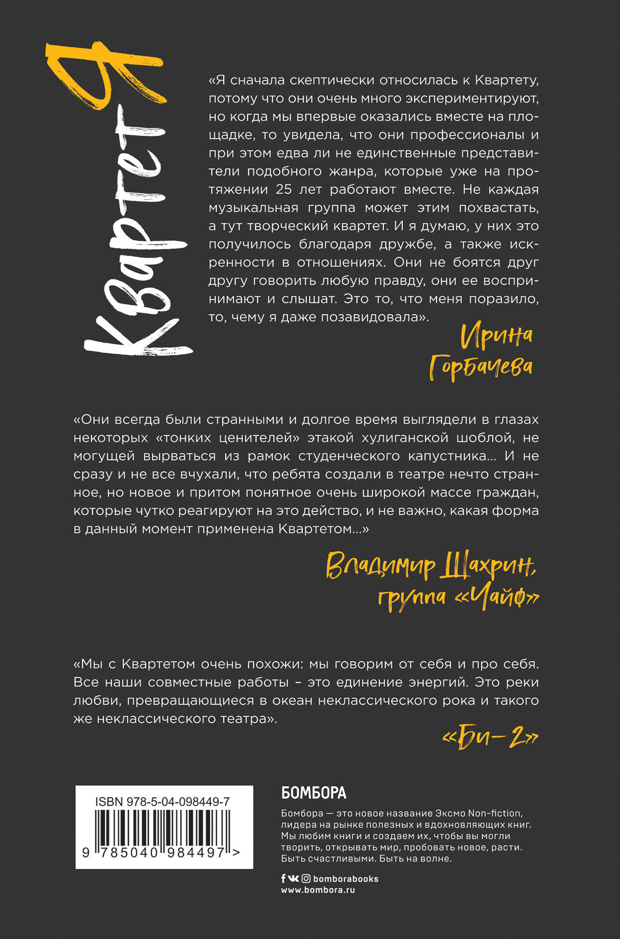 Вокруг суперпопулярного коллектива, состоящего из четырех харизматичных, ярких и талантливых артистов, всегда будет ходить много слухов и сплетен. Александр Демидов, один из создателей и постоянный участник «Квартета И», раскрывает все закулисные тайны самого смешного театра страны. Книга написана Демидовым в дневниковой форме, так что читатель сможет полностью погрузиться в творческую и самобытную атмосферу театрального коллектива. Выхода книги с нетерпением ждет фанатская аудитория (66.4К подписчиков в ВК, 37.5К в FB).| Издательство | ООО "Издательство "Эксмо" |