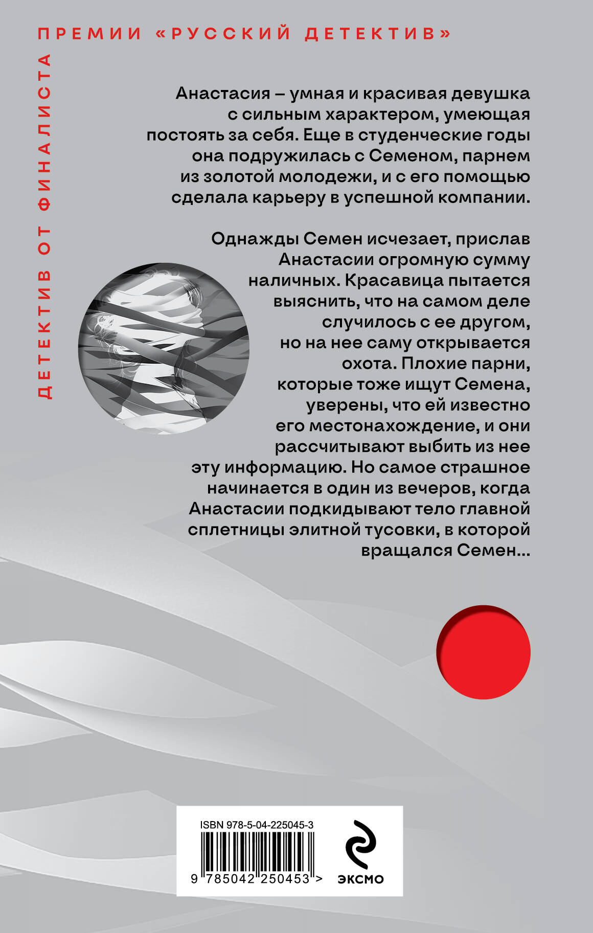 Детектив от финалиста премии «Русский детектив». Анастасия - умная и красивая девушка с сильным характером, умеющая постоять за себя. Еще в студенческие годы она подружилась с Семеном, парнем из «золотой молодежи», и с его помощью сделала карьеру в успешной компании. Однажды Семен исчезает, прислав Анастасии огромную сумму наличных. Красавица пытается выяснить, что на самом деле случилось с ее другом, но на нее саму открывается охота. Плохие парни, которые тоже ищут Семена, уверены, что ей известно его местонахождение, и они рассчитывают выбить из нее эту информацию. Но самое страшное начинается в один из вечеров, когда Анастасии подкидывают тело главной сплетницы элитной тусовки, в которой вращался Семен…| Издательство | ООО "Издательство "Эксмо" |