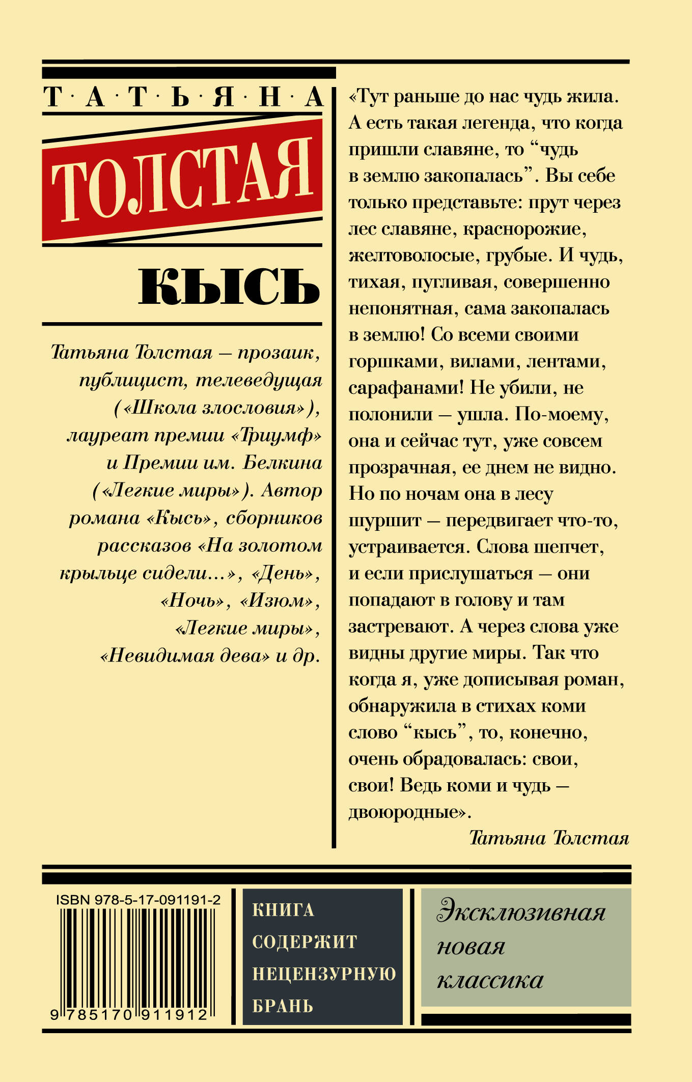Татьяна Толстая - прозаик, публицист, телеведущая ("Школа злословия"), лауреат Премии им. Белкина ("Легкие миры"). Автор сборников рассказов "На золотом крыльце сидели…", "День", "Ночь", "Изюм", "Легкие миры", "Невидимая дева" и др. Роман "Кысь" был удостоен премии "Триумф" и вошел в шорт-лист премии "Русский Букер".| Издательство | ИЗДАТЕЛЬСТВО "АСТ" |