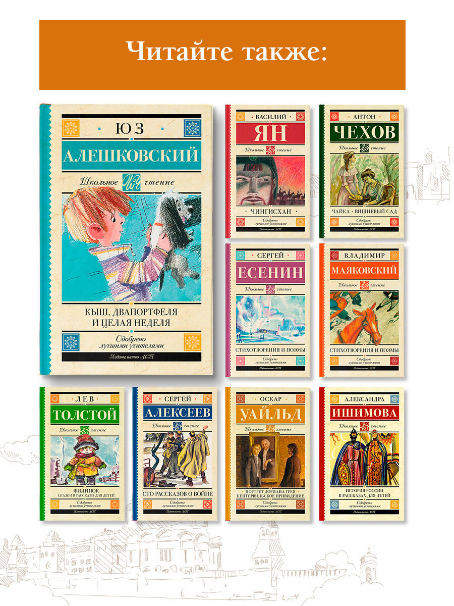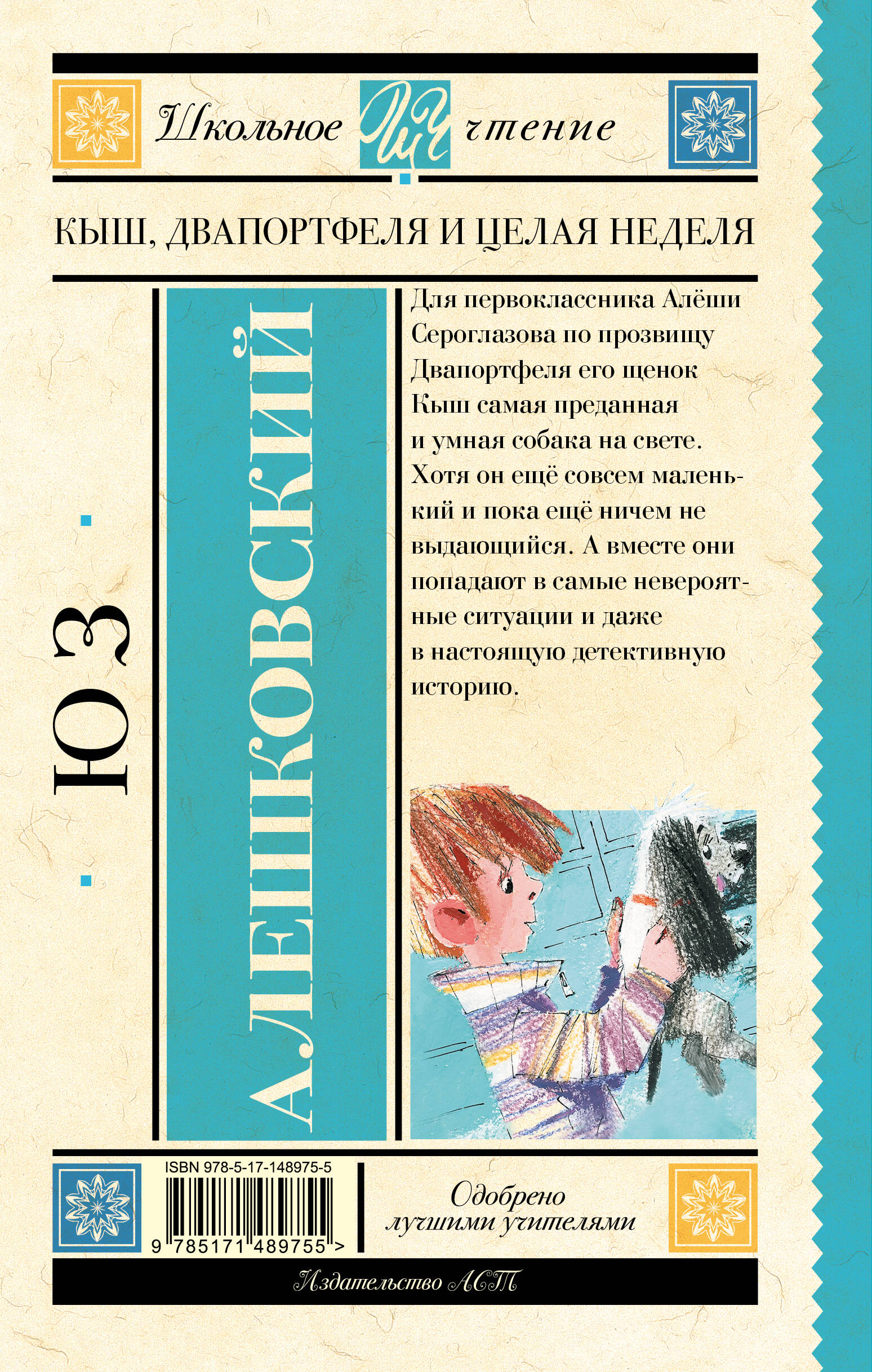 Знаменитая детская повесть Юза Алешковского! «Кыш, Двапортфеля и целая неделя» - повесть для ребят, умеющих ценить настоящую дружбу и совершающих во имя неё самые настоящие подвиги. Она рассказывает о дружбе первоклассника Алёши Сероглазова и его щенка Кыша. Книга написана с большой любовью к детям и братьям нашим меньшим. Поэтому Кыш получился таким живым, а Алёша - верным товарищем, способным на удивительные поступки. В серию включены лучшие произведения отечественной и зарубежной литературы, входящие в школьную программу с 1 по 11 класс и в списки дошкольного чтения. Книги в твердом переплете сделают знакомство с литературой легким и увлекательным. Серия, которая не ударит по семейному бюджету и поможет юному читателю расти нравственно и интеллектуально!| Издательство | АСТ |