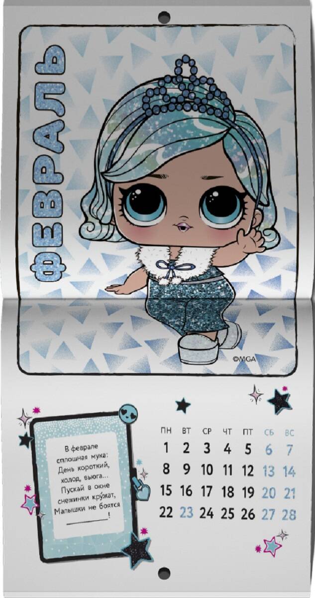 ВЕСЬ ГОД С КУКОЛКАМИ L.O.L. SURPRISE! НА КАЖДОЙ СТРАНИЧКЕ КРАСОТКА ИЗ СЕМЬИ L.O.L. SURPRISE! ЗАДАСТ ТЕБЕ ВЕСЁЛУЮ ЗАГАДКУ ПРО ВРЕМЕНА ГОДА. ЛИСТАЙ, РАЗГАДЫВАЙ И КАЖДЫЙ МЕСЯЦ НАСЛАЖДАЙСЯ НОВОЙ СТИЛЬНОЙ КРОШКОЙ L.O.L. SURPRISE! У СЕБЯ НА СТЕНЕ!| Издательство | АСТ |